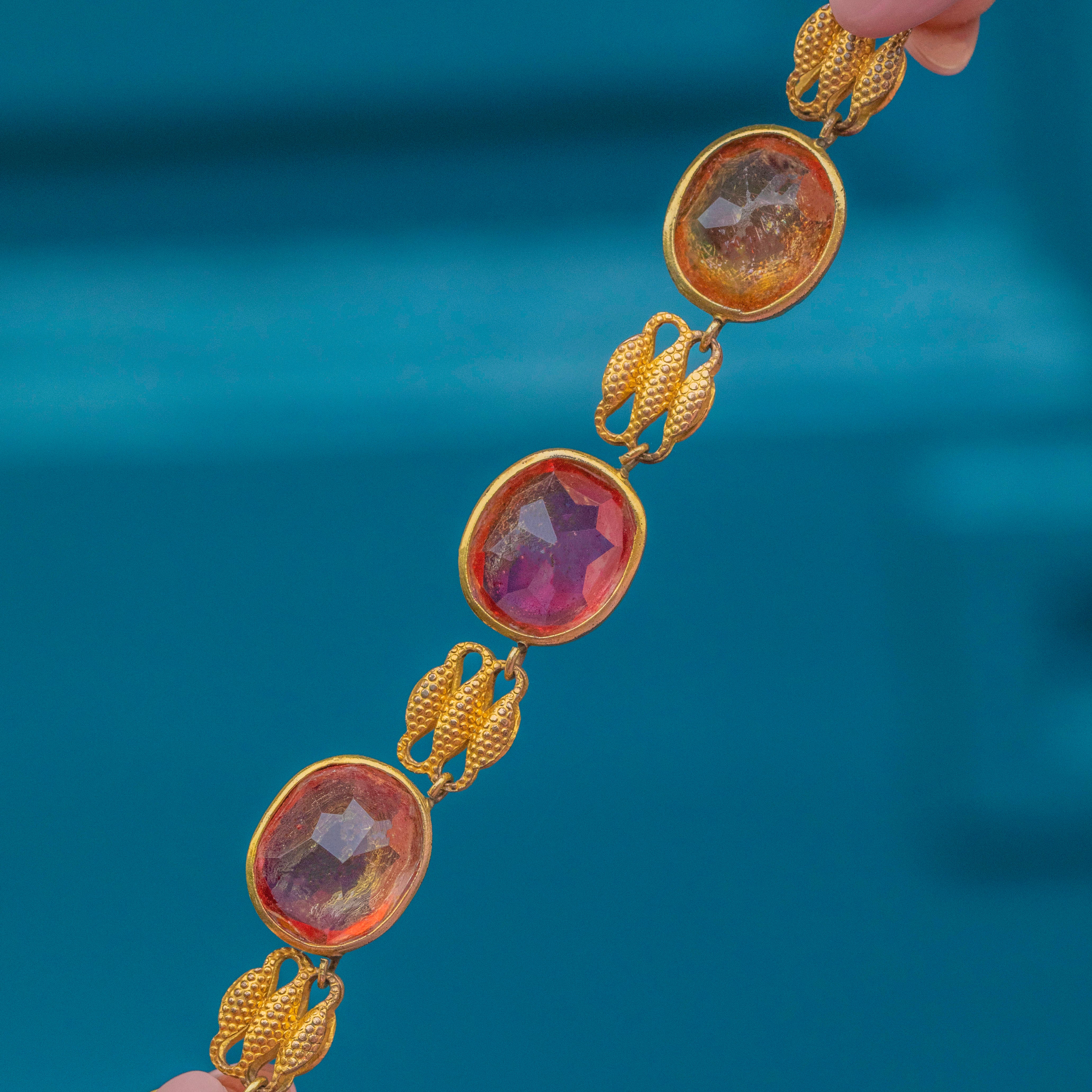 Each stone is encased within a pretty Pinchbeck setting, a highly collectible metal that was first created as a more affordable alternative to Gold during the 18th Century. Wonderfully emulating the appearance of high carat Gold, Pinchbeck is incredibly rare and sought after for its brilliance! Steeped in history, you will never find a necklace as exquisite as this beauty.