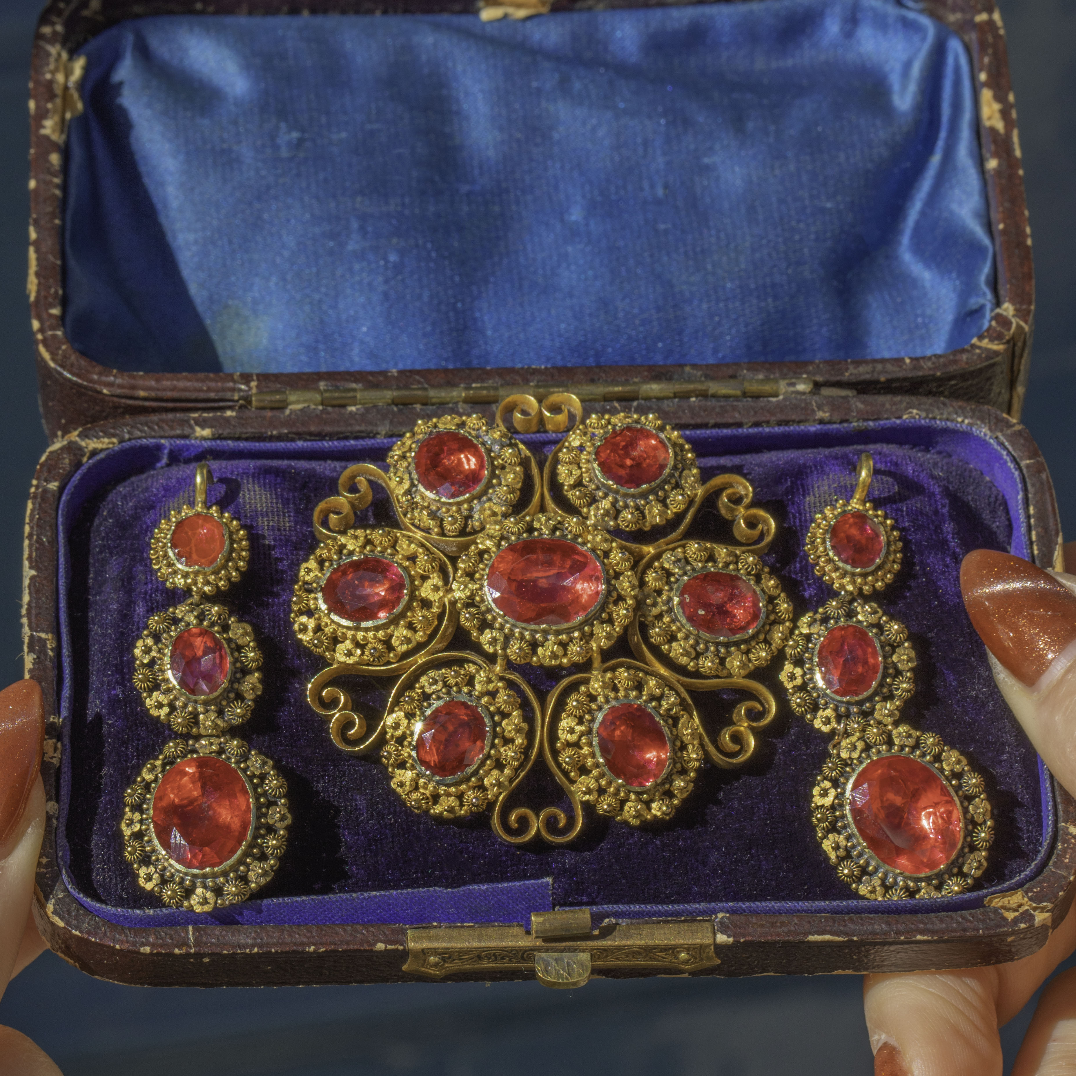 The Georgians were lovers of a parure, a full set of jewellery containing a necklace, earrings, pendant and brooch. A demi-parure comprises two to three pieces, and this one has been made with 18ct Gold and pink foiled Rock Crystal gemstones. The intricacy of the cannettille work and floral details of the Golden Pinchbeck are simply breathtaking, enhanced by the bright magenta tones of the foiled crystals