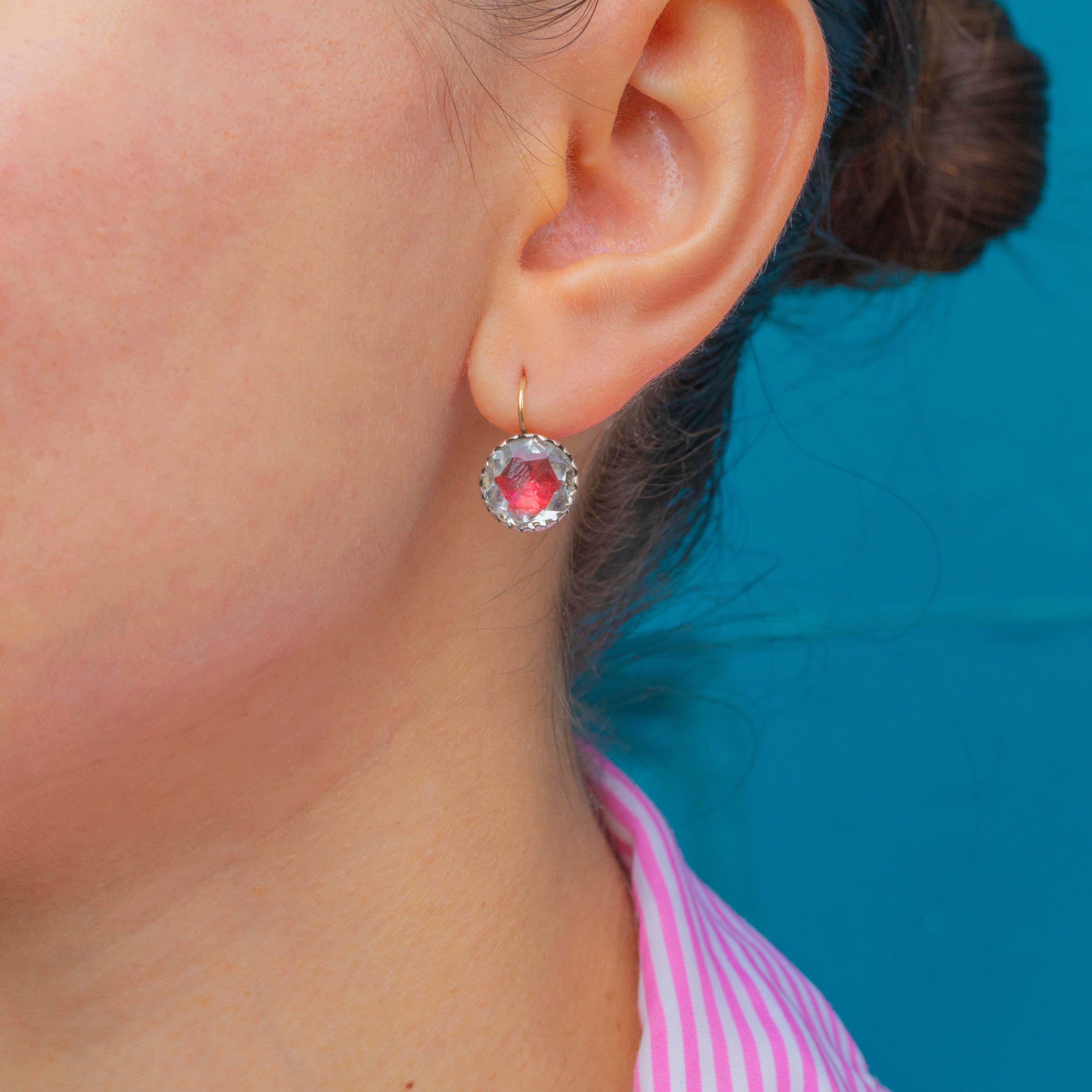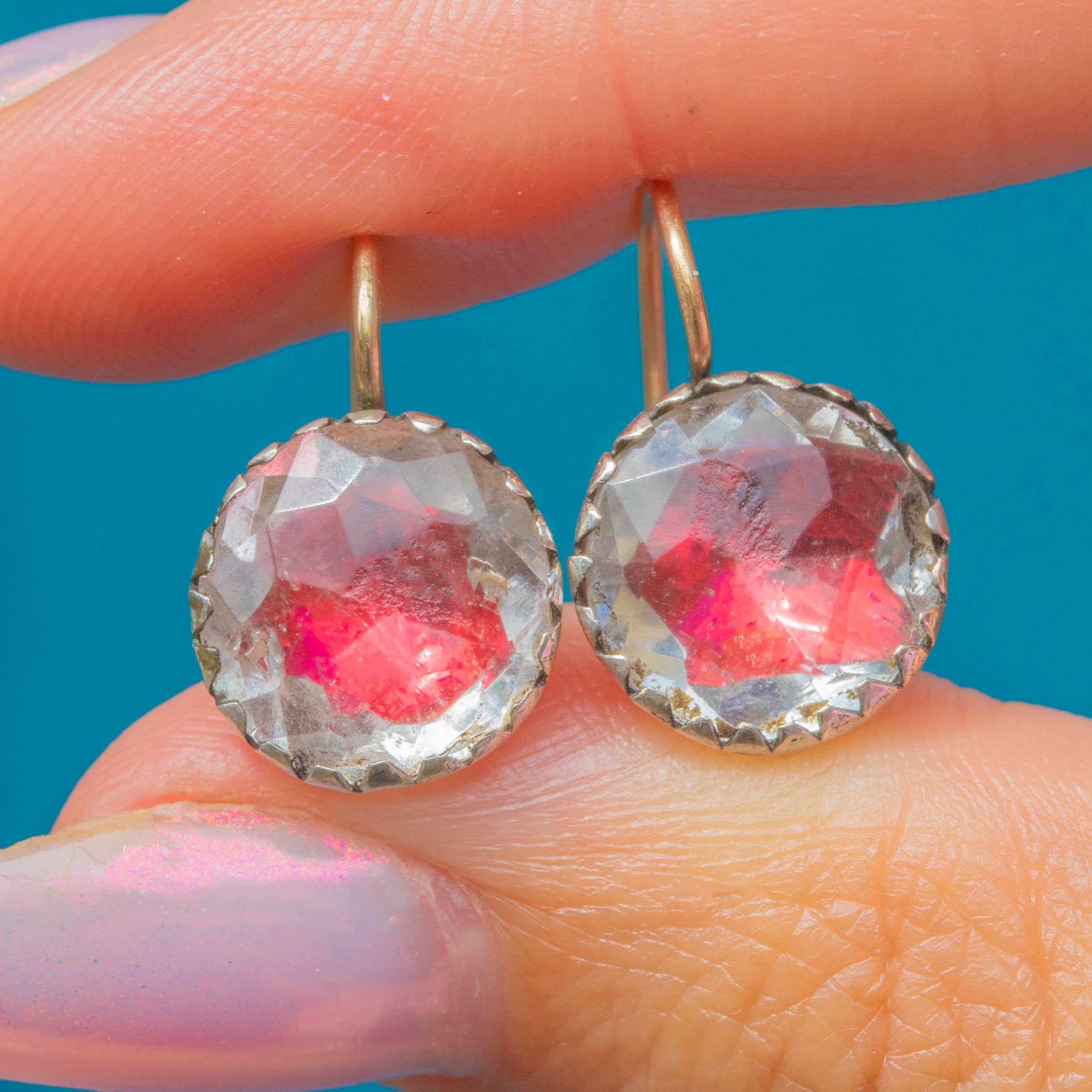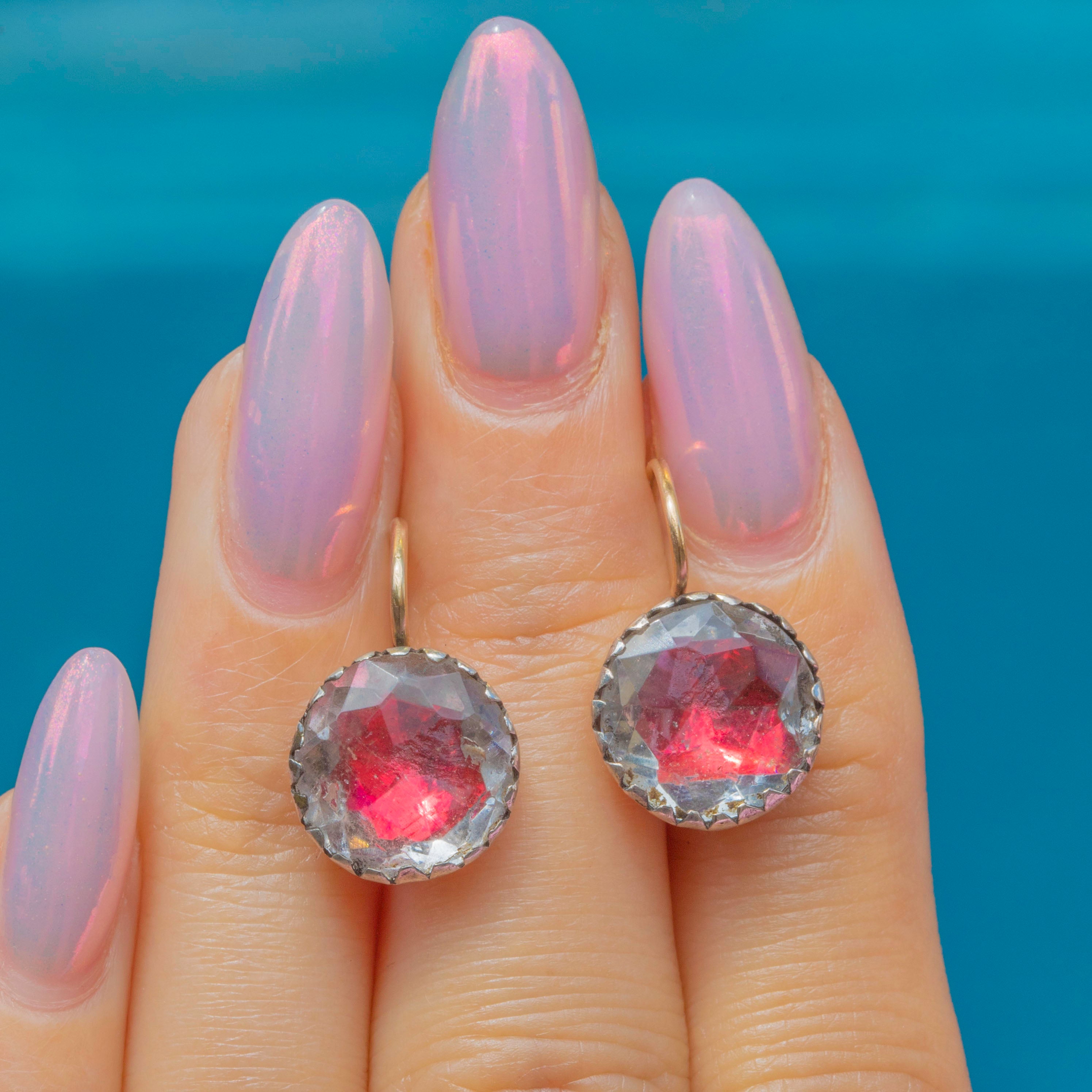 VERY GOOD: The Paste have crisp facets and are securely set, with only mild surface wear throughout, which is to be expected with age. The foils are intact, with no visible wear, and retain their bright pink hue. There is evidence of a conversion on the back of the earrings, but this has been carried out well and cannot be seen looking front on. The hooks are long and slender, providing comfortable and secure wear.