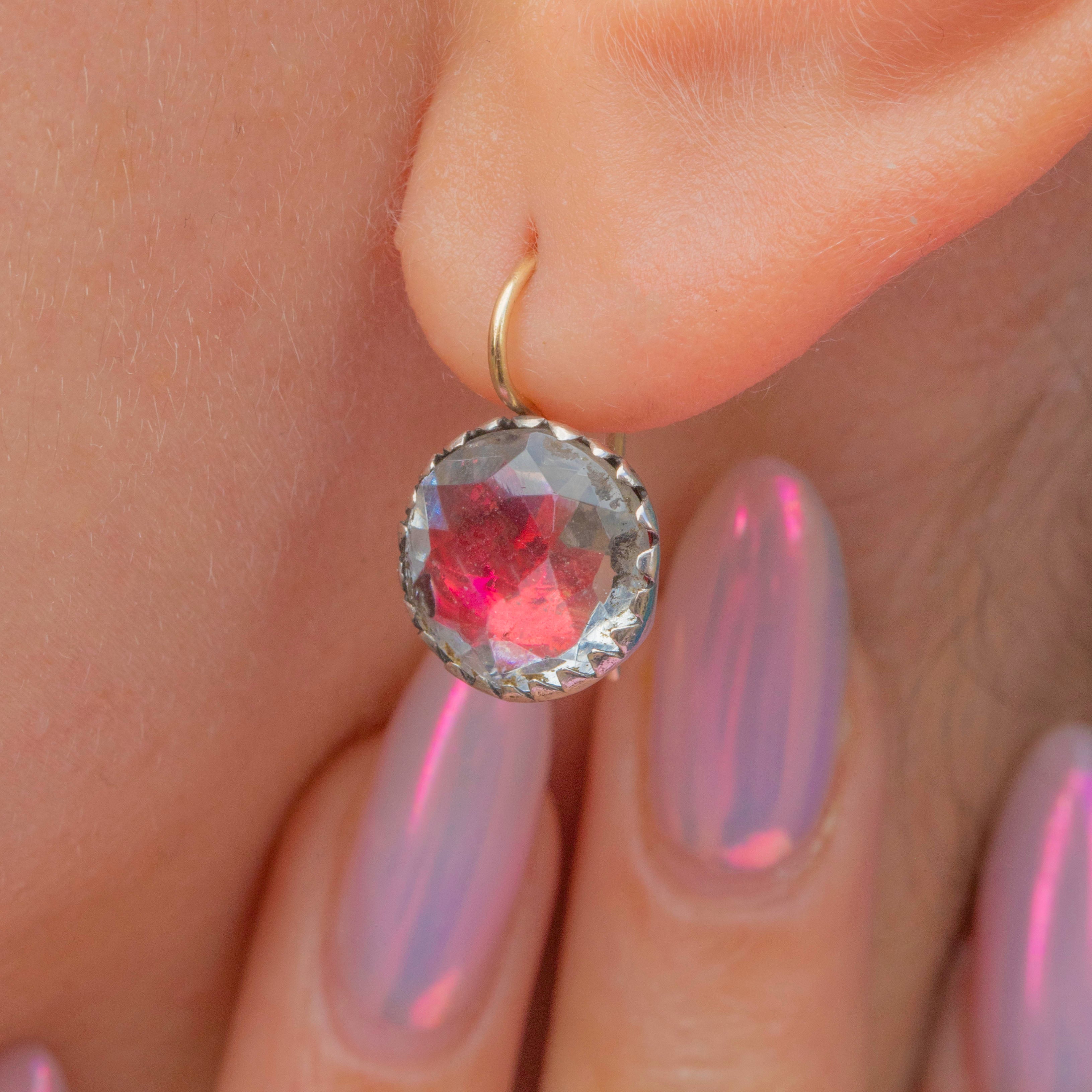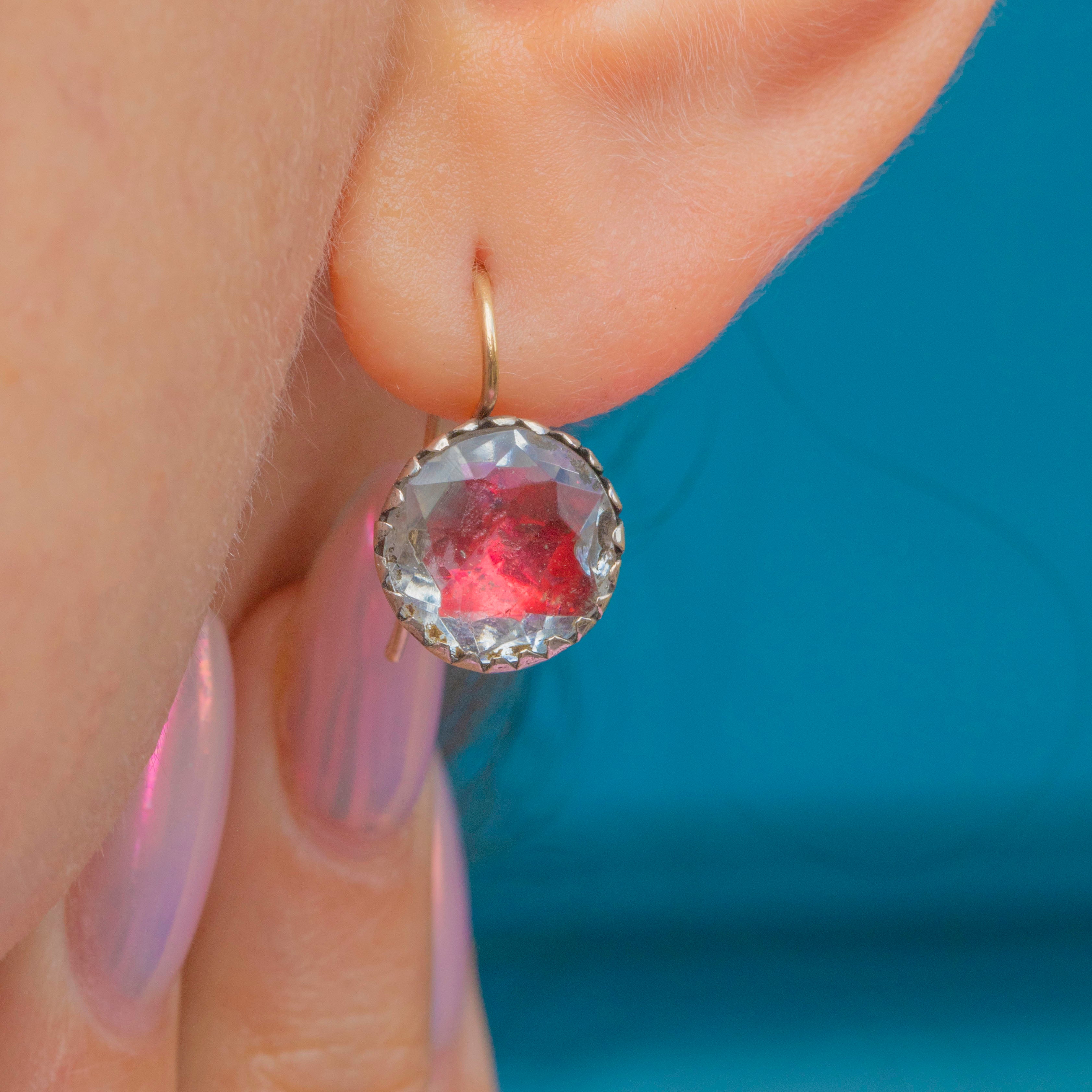 Shimmering with hot pink hues from their foiled backs, these Georgian Paste earrings will look resplendent adorning your lobes! Each round drop boasts an expertly hand-cut and faceted Paste, displayed in classically Georgian Silver settings, and come complete with solid, 9ct Gold hooks.