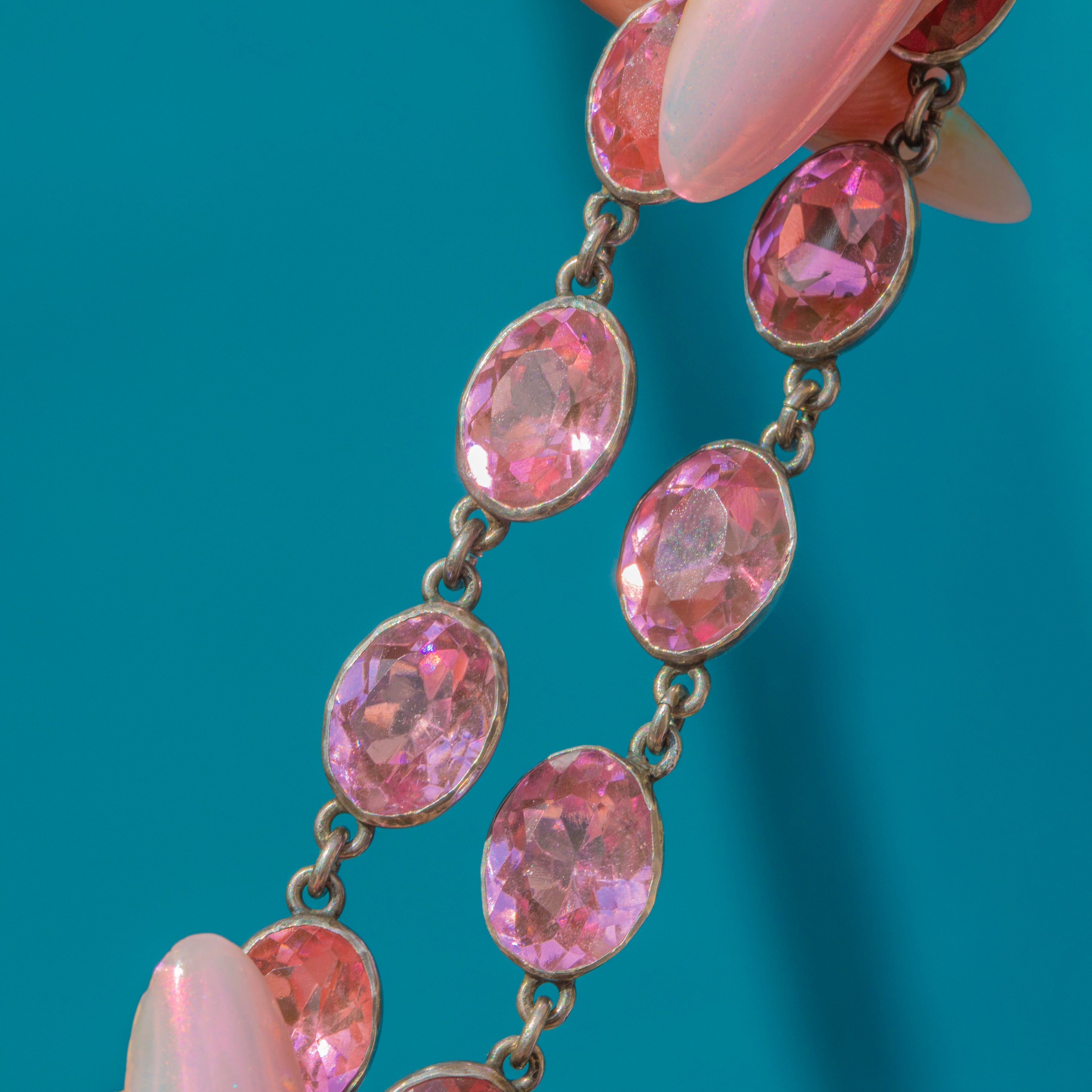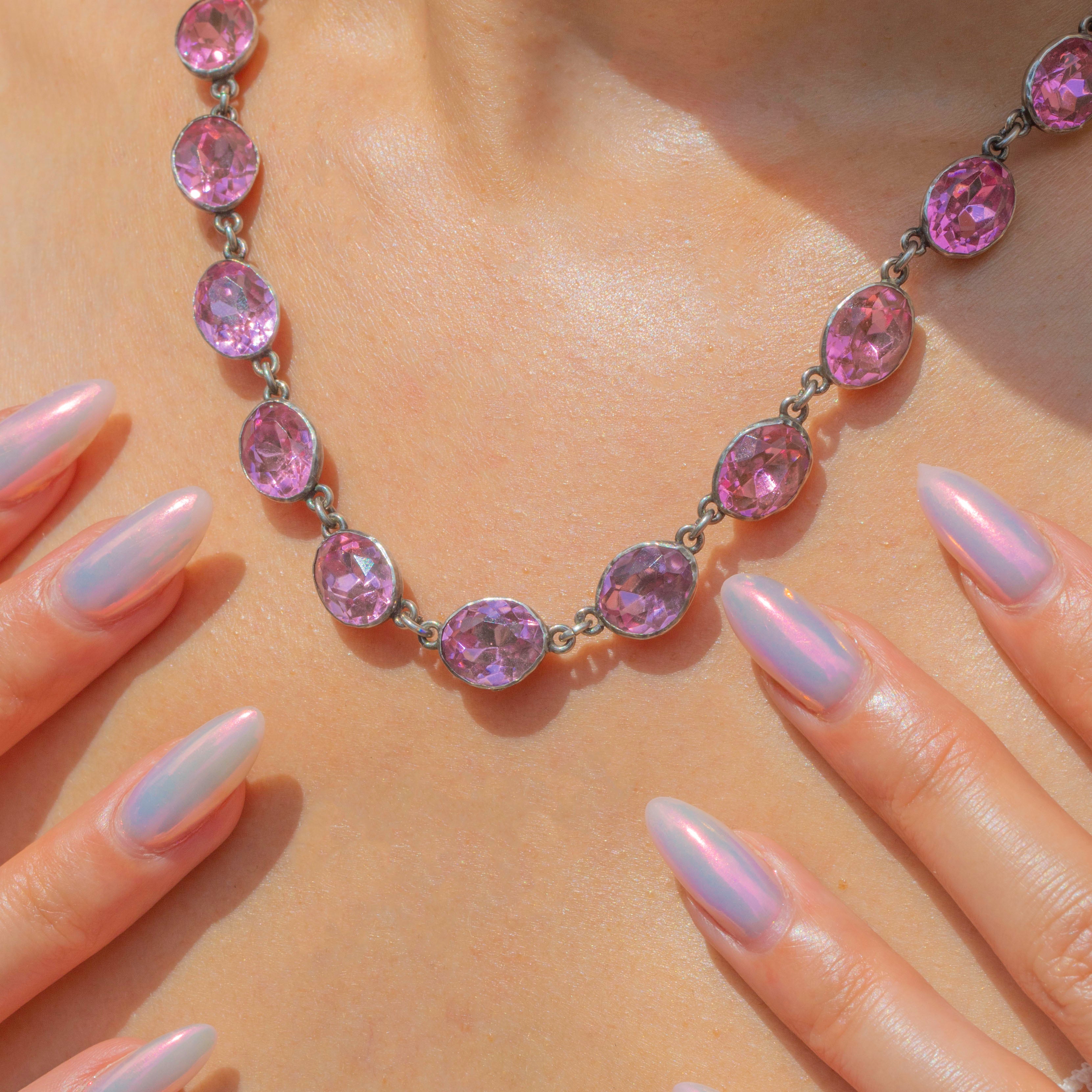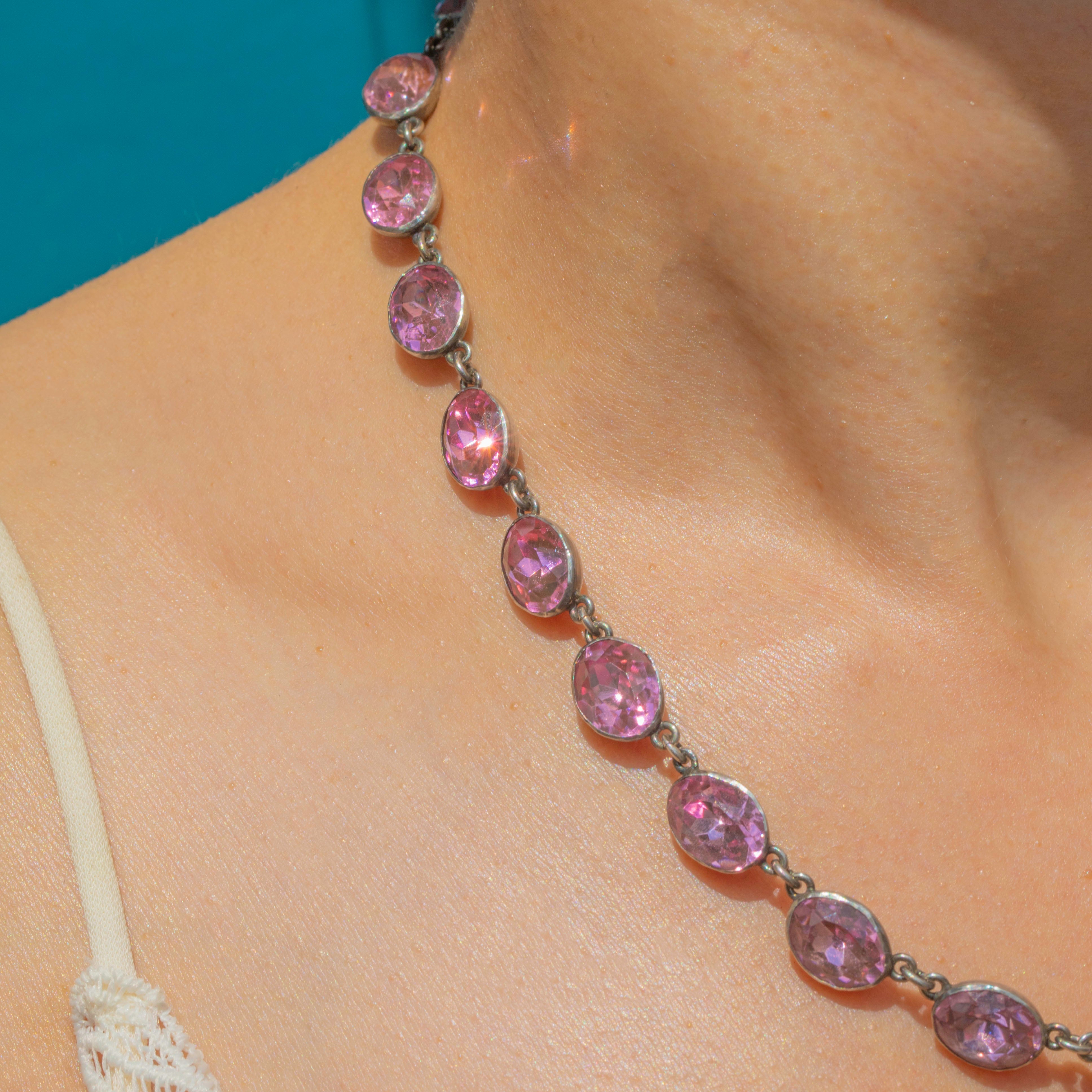Pretty in pink, this Georgian pink Paste rivière necklace is a must-have for antique jewellery enthusiasts. The necklace consists of blush baby pink Paste gemstones that flow like a river around the neck, encapsulating the essence of the French word for river, rivière!