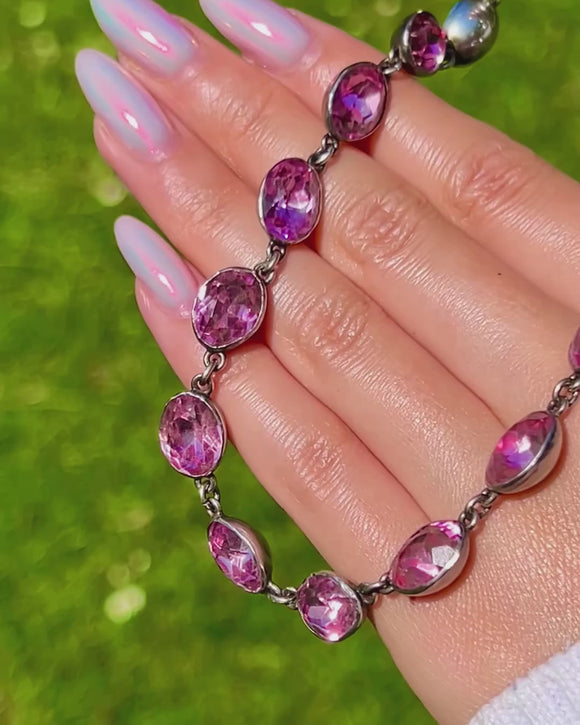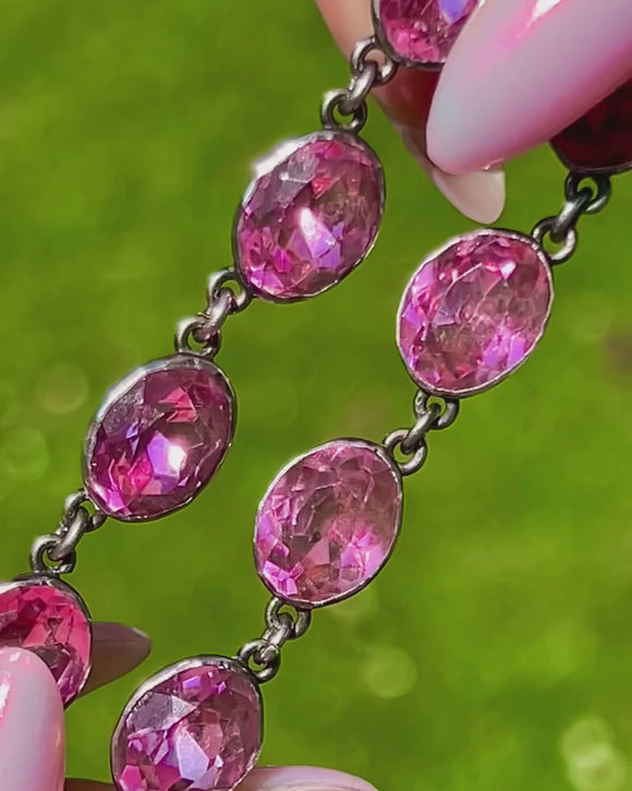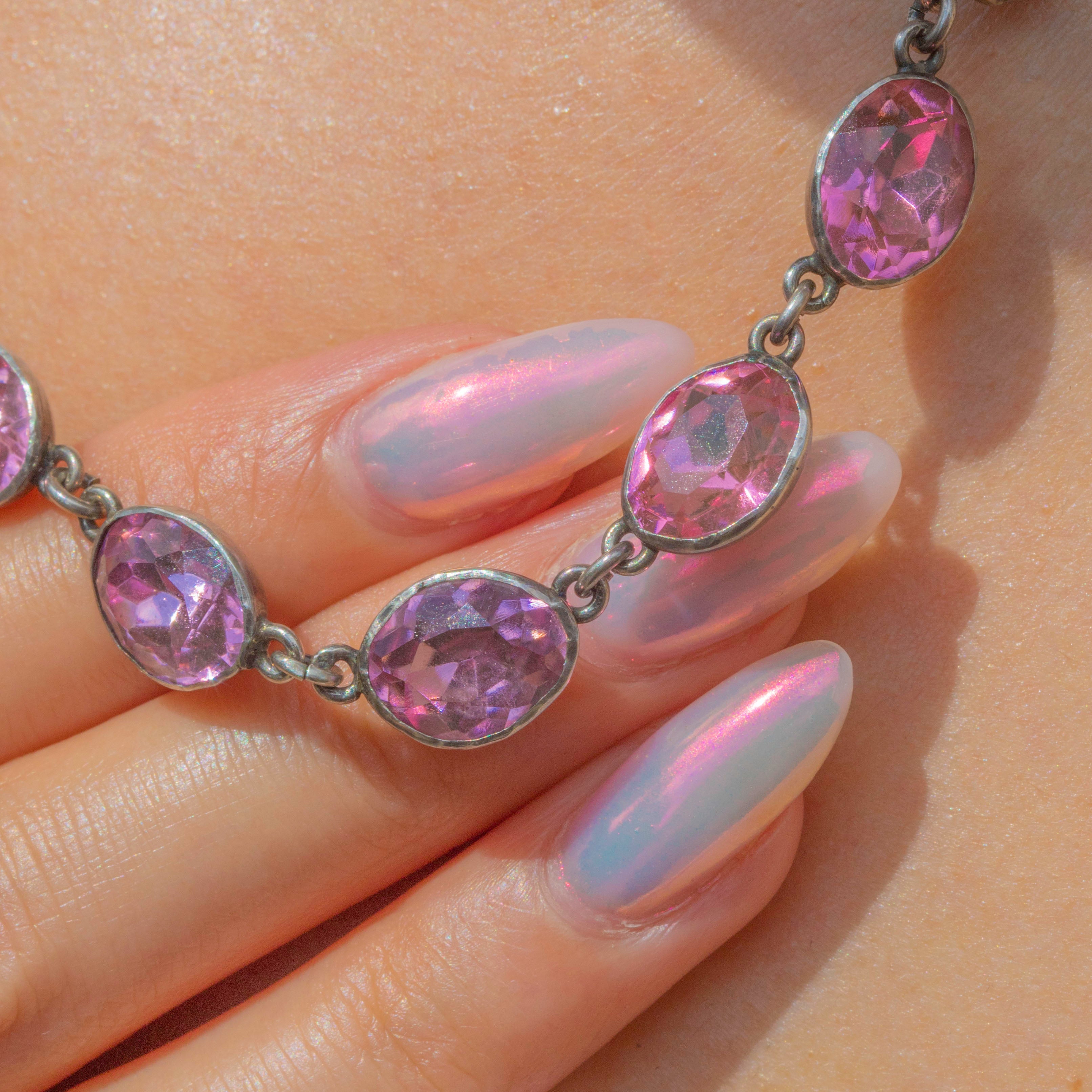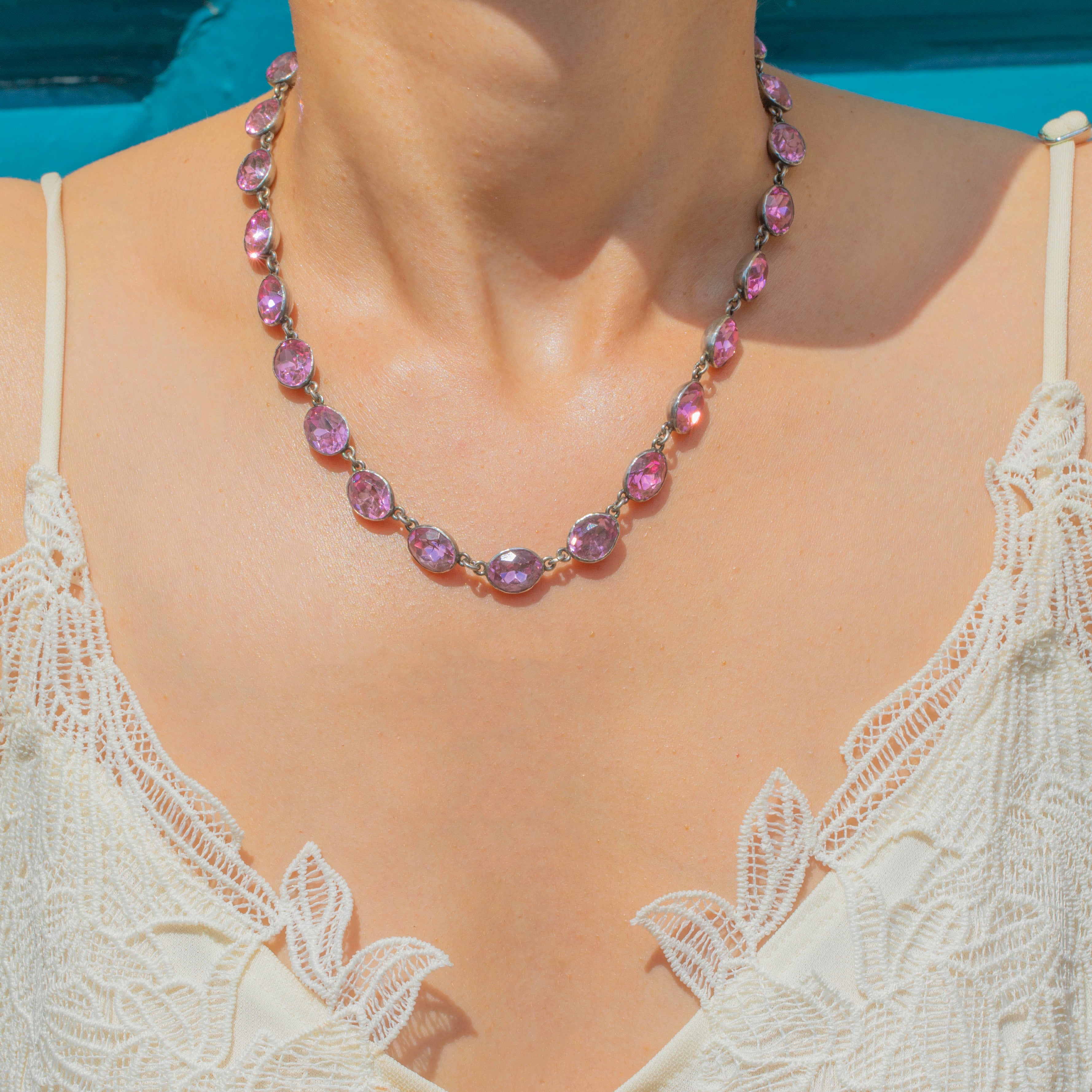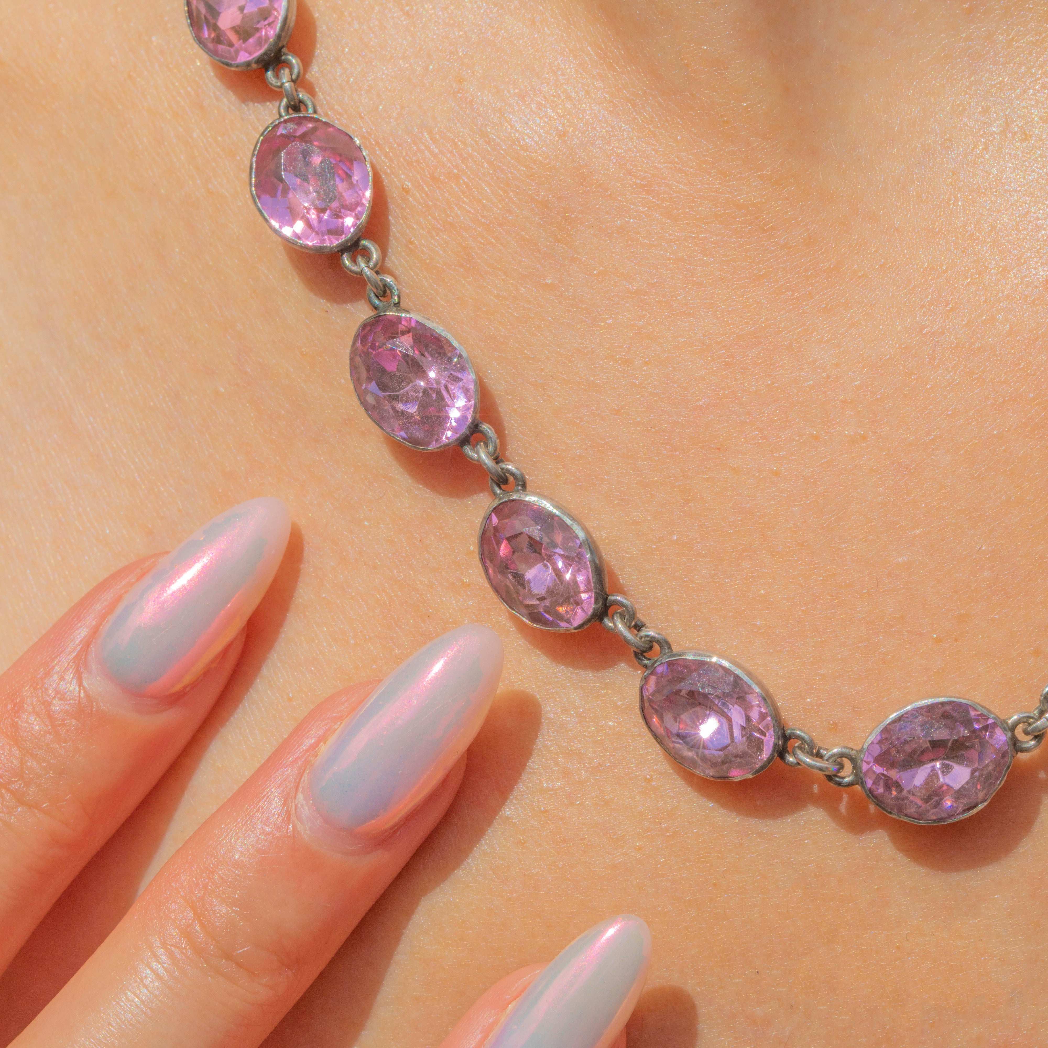 Pretty in pink, this Georgian pink Paste rivière necklace is a must-have for antique jewellery enthusiasts. The necklace consists of blush baby pink Paste gemstones that flow like a river around the neck, encapsulating the essence of the French word for river, rivière!