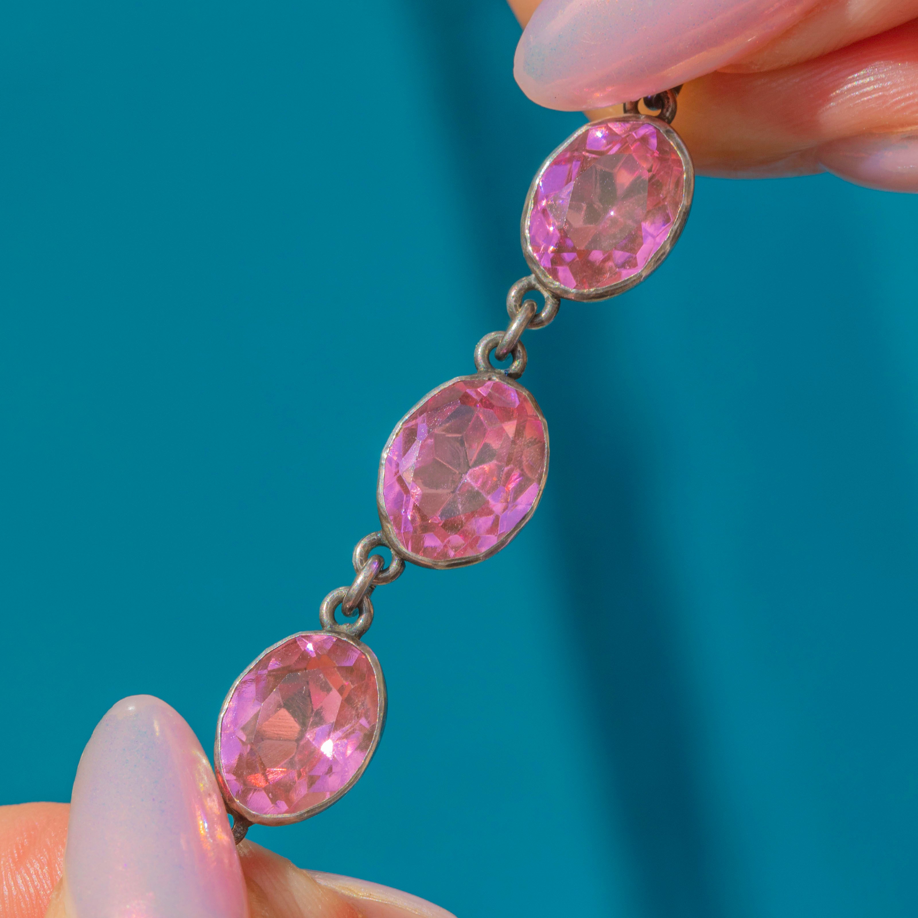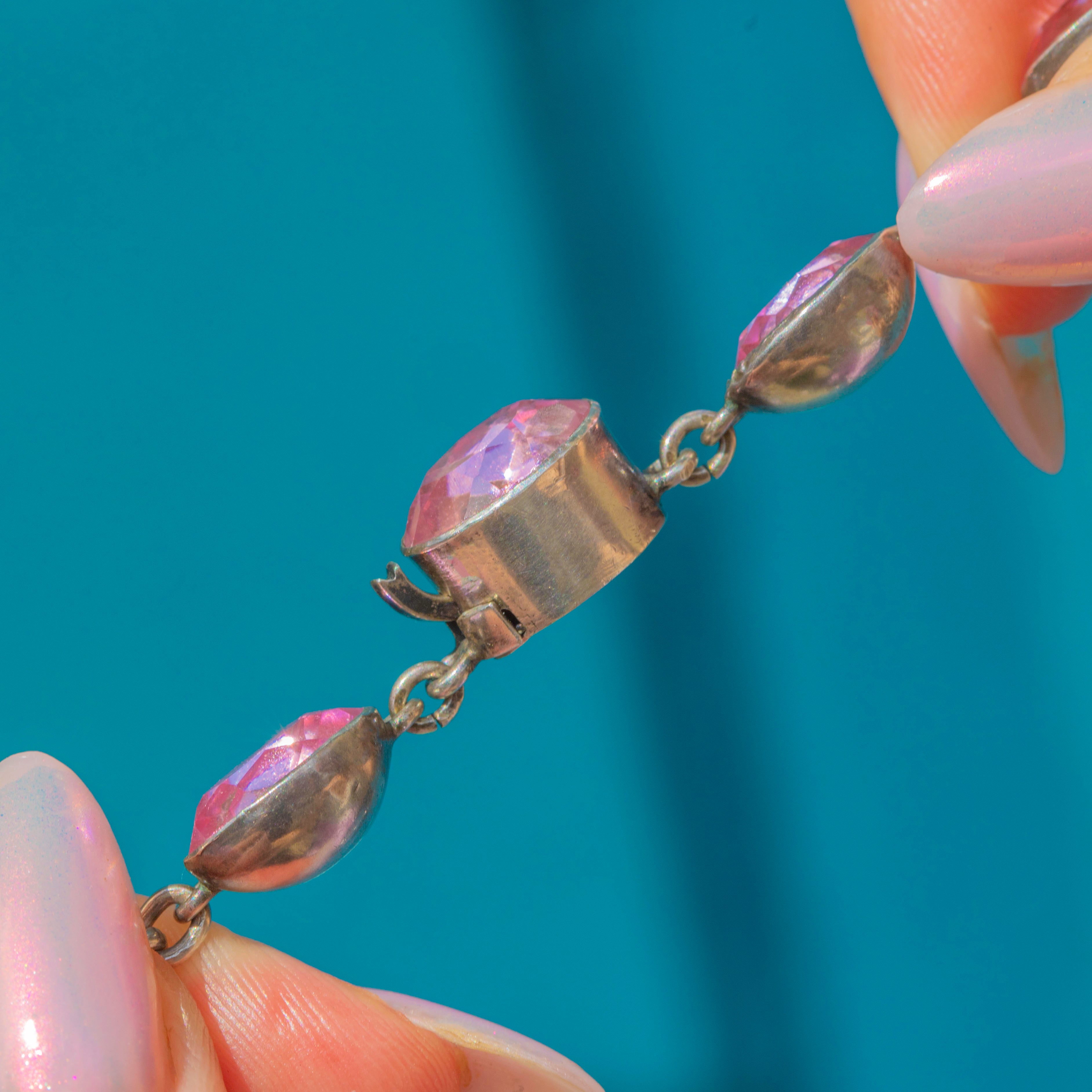 Measuring 14.5" long, this treasure will effortlessly caress your neck, peeking out from beneath your collar. We adore how the blushed tones of the pink Paste gemstones vary slightly in hue, an homage to the perfectly imperfect craftsmanship of antique jewellery.