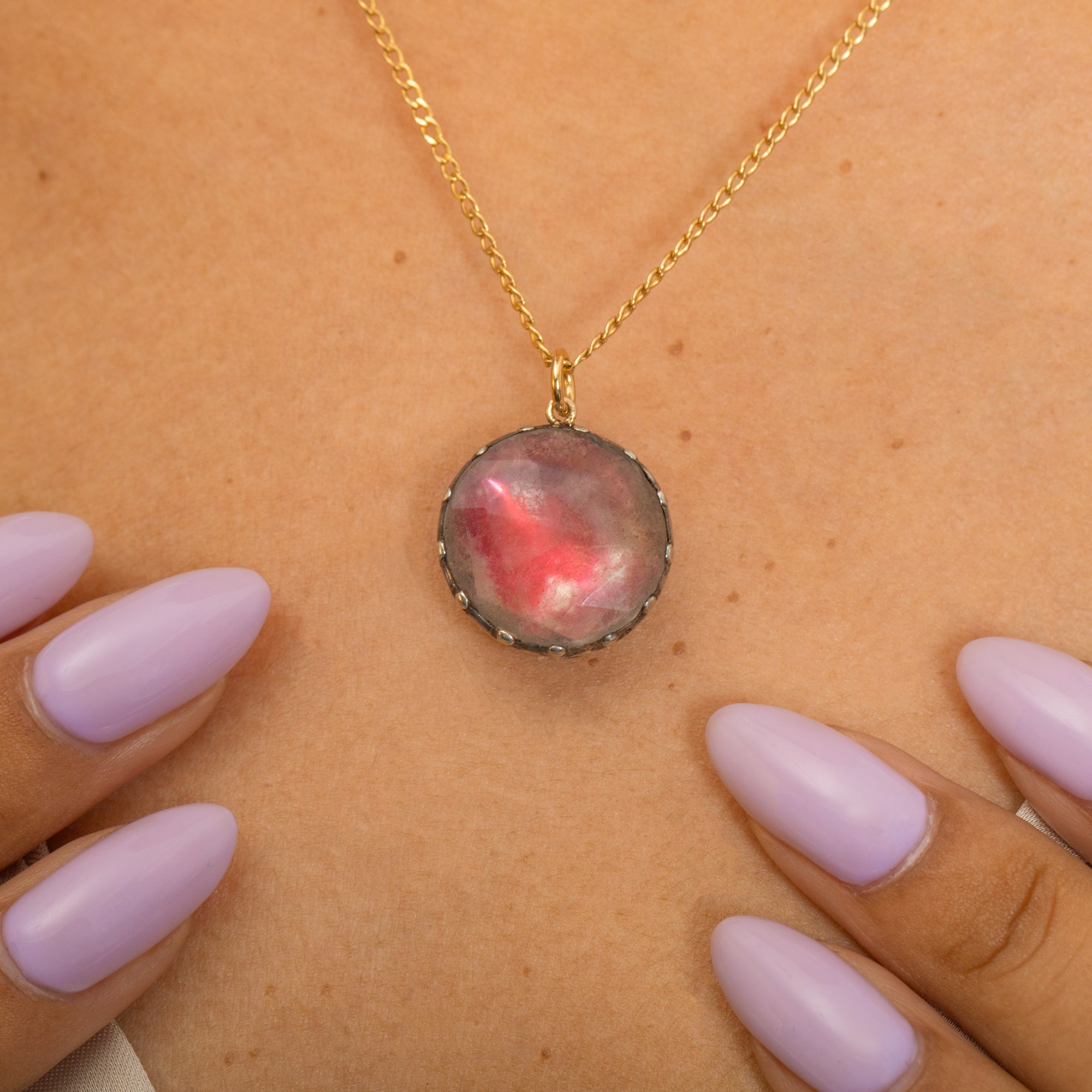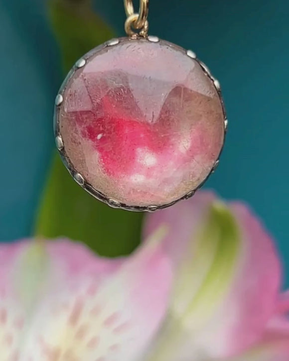 This Georgian shimmery blush pink foiled Paste pendant is such a lovely piece. Set within Sterling Silver settings with an 18ct Gold jump ring, this Paste gem reveals an exquisite blush pink foil in the light.