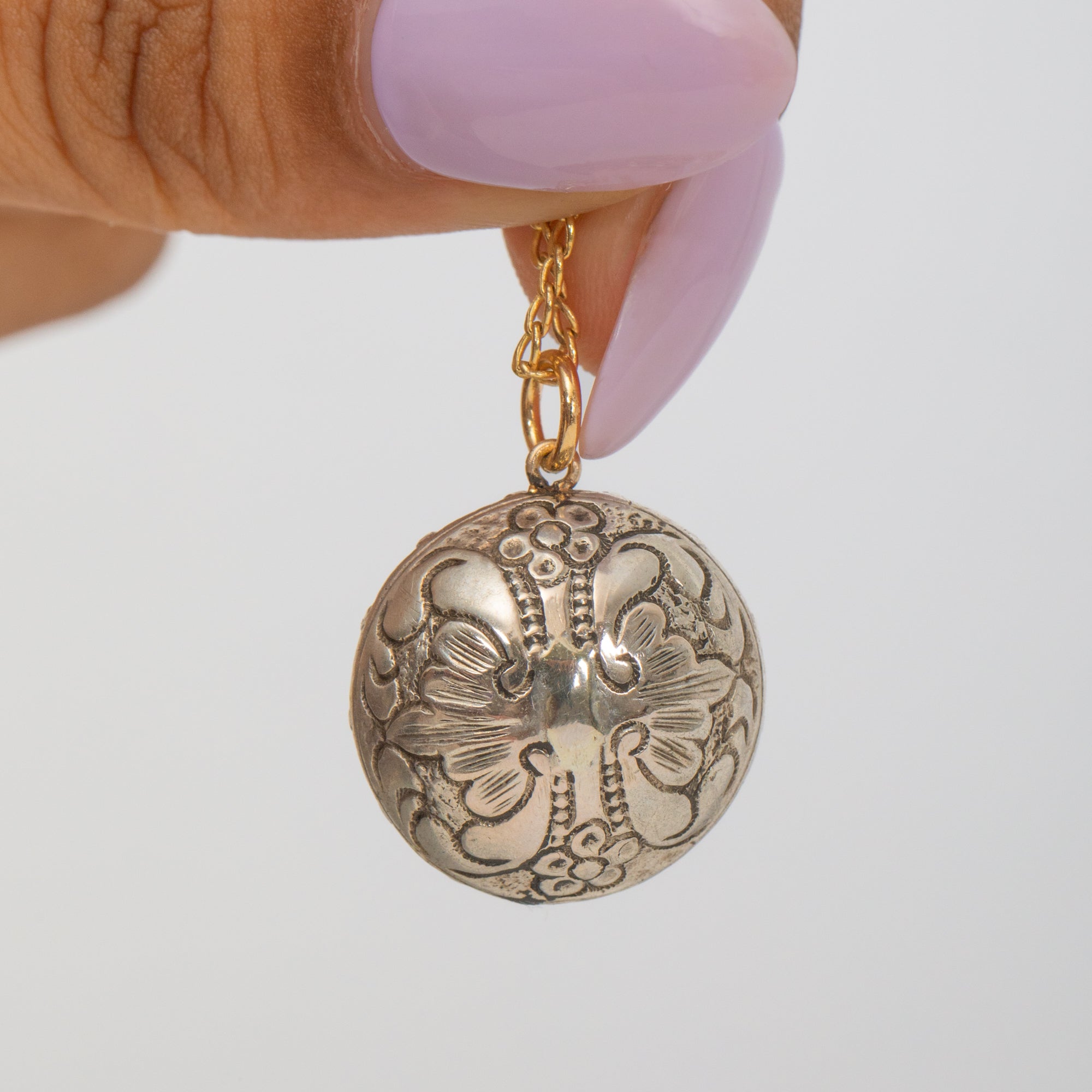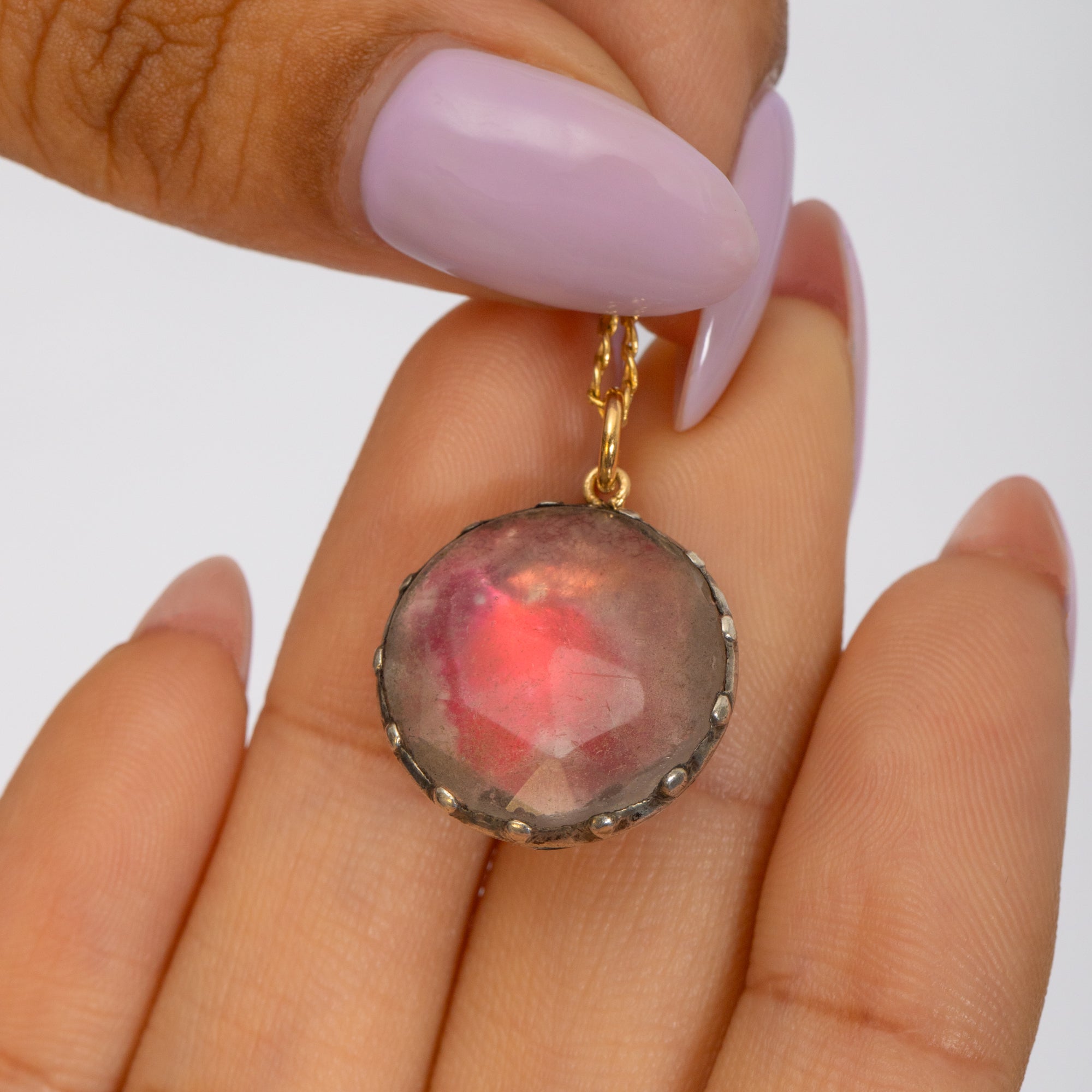 VERY GOOD. This Georgian shimmery blush pink foiled paste pendant is offered in very good condition. The classic Georgian pie crust setting holds the Paste securely in place, and the Paste has crisp facets with only some minor surface wear. The Silver is lustrous and has accrued an admirable patina within the engraved details making them stand out. The 18ct Gold jump ring is soldered closed allowing you to wear this antique Paste pendant confidently!