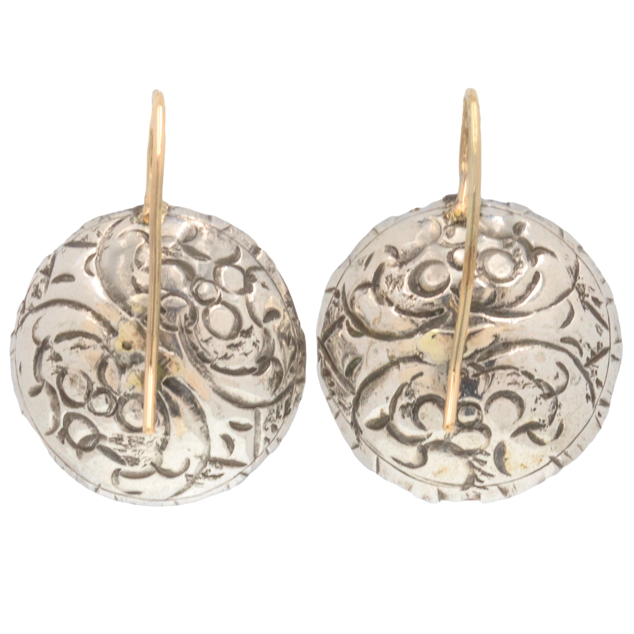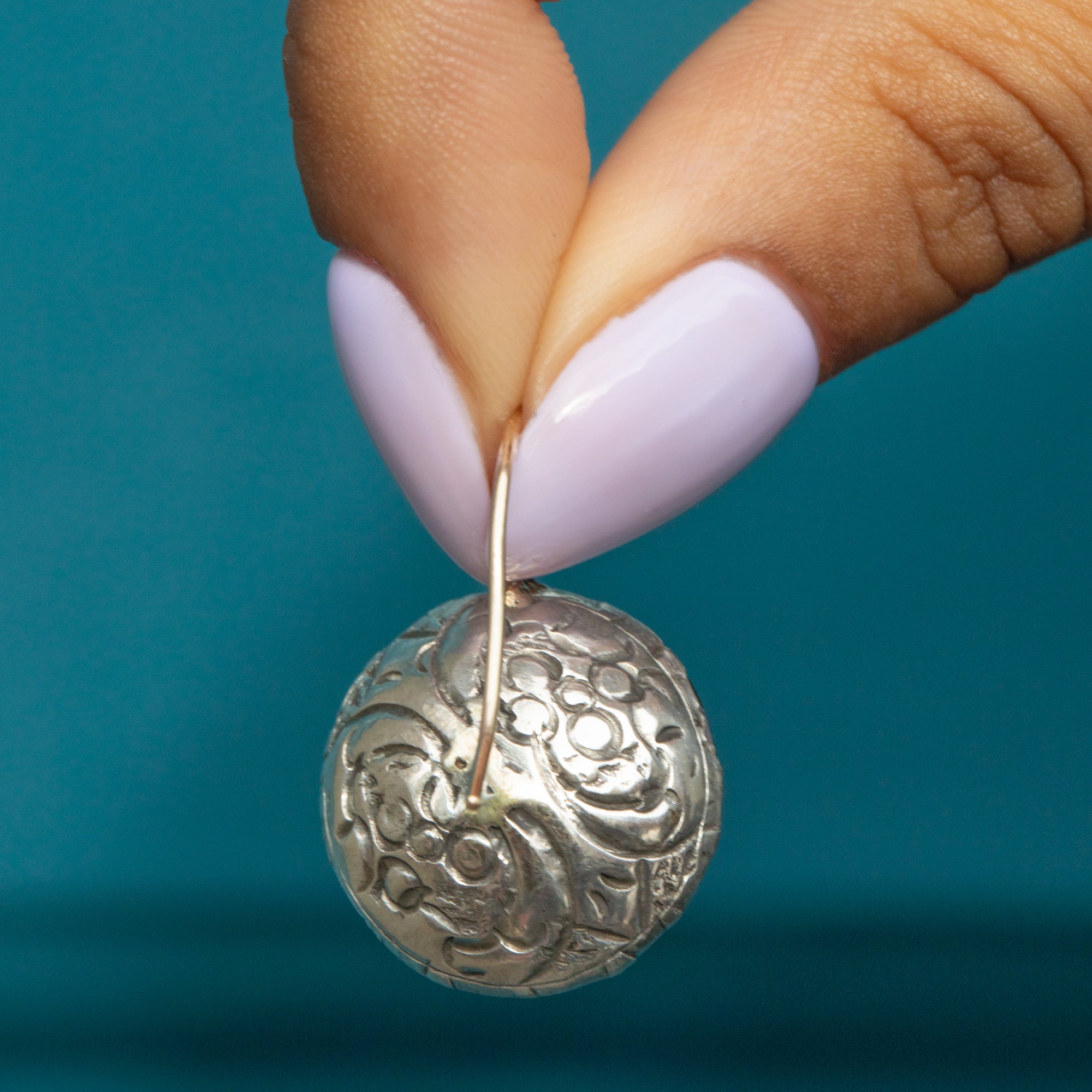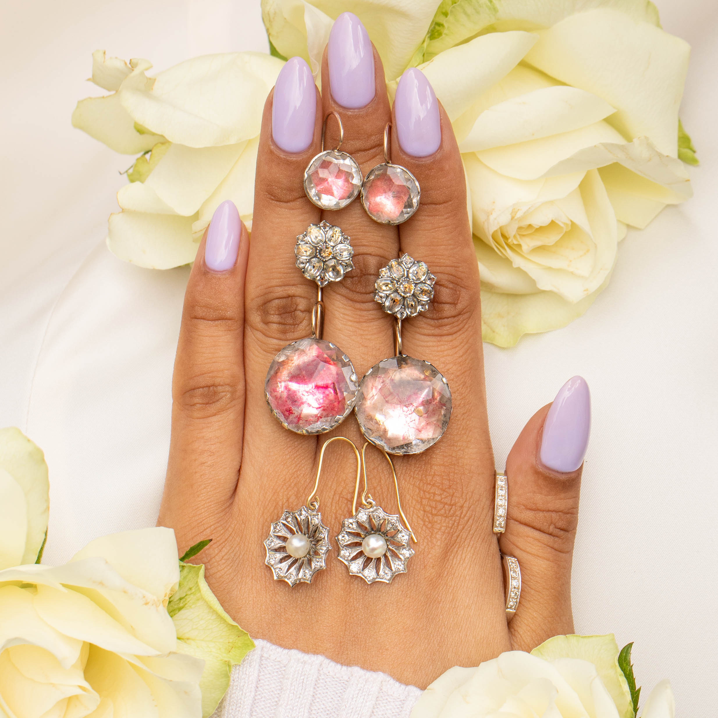 These Georgian Silver pink foiled Paste earrings are a delightful pair! Two bright foiled Paste gems emanate pretty pink hues from their foiled backs, held within domed Silver settings that display floral engravings. Complete with sleek 9ct Gold wire hooks, they are perfect for adding a touch of sophistication to your outfit!
