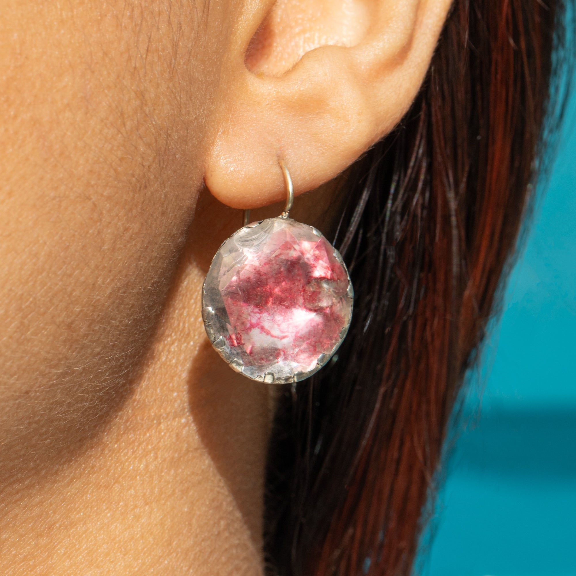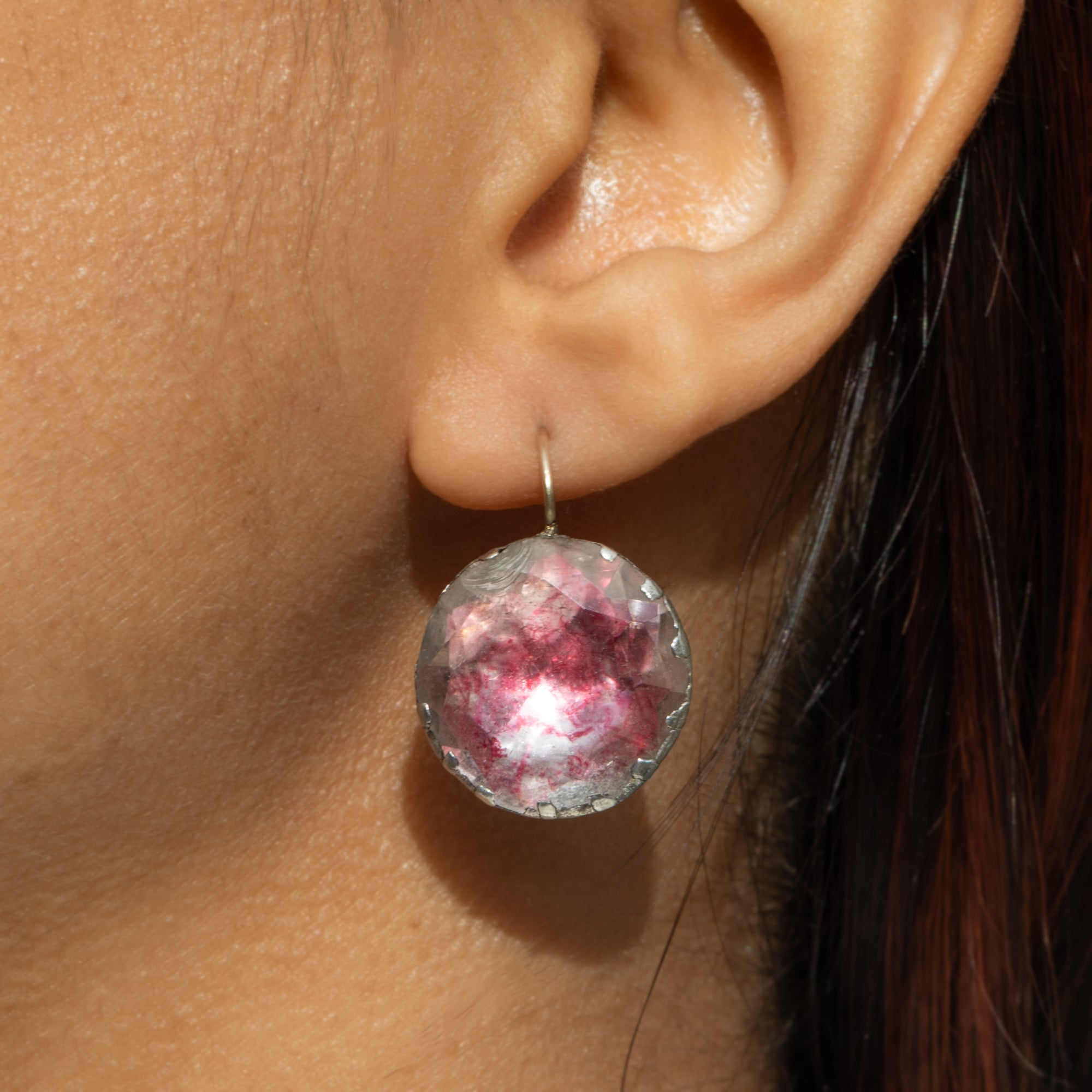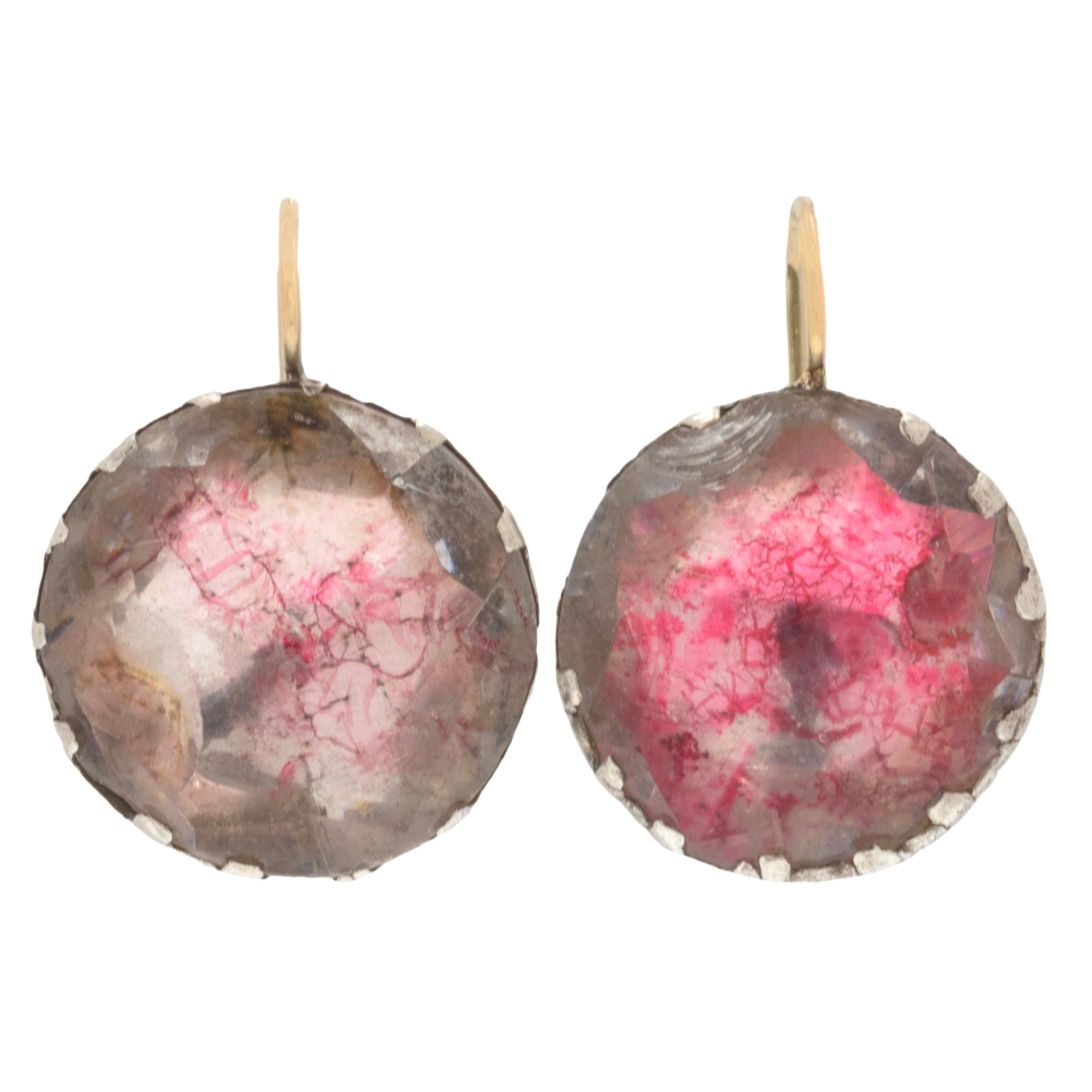 VERY GOOD. These Georgian Silver pink foiled Paste earrings are in superb condition, especially when considering their grand age! The Paste gems are beautifully faceted, with some light wear, but this is minimal and can only be seen under very close inspection. The button-backs have crisp engravings that have accrued an admirable patina emphasising that only serves to accentuate the highly skilled craftsmanship. There is some slight variation in colour of the earrings, due to how the foils have aged, with one that possesses a more vibrant pink hue, but both have a nice overall finish. A highly desirable pair of Georgian earrings that will make a statement wherever you go!