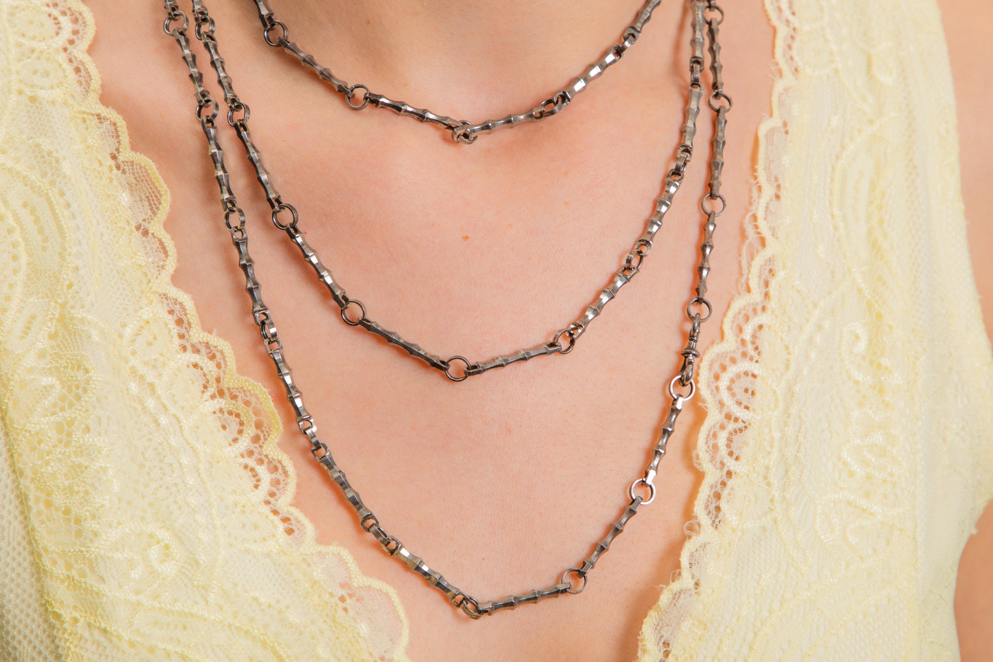 Every inch of her design is unique and incredibly hard to come by nowadays. Composed of a link style we have never seen before, akin to bamboo, each Steel link is joined by super rare sliced steel split ring connectors, and with 54.5 inches of her, you can soak up her antique beauty wrapped around multiple times.
