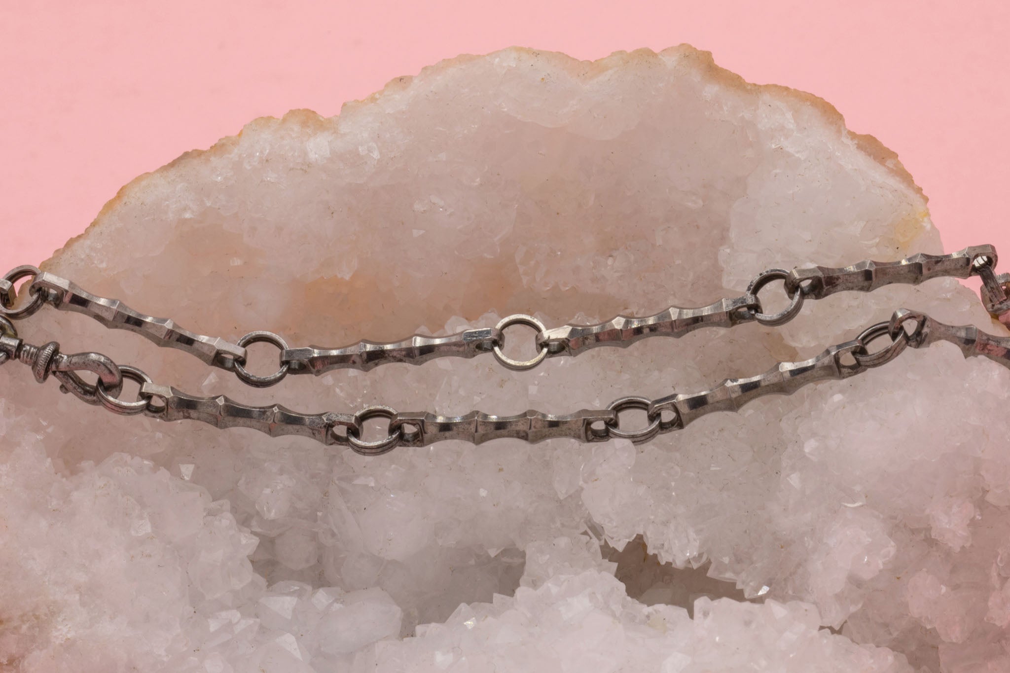 With a stunning gunmetal tone, this exquisite piece of antique jewellery will add a touch of punk and Gothic glamour to your jewellery wardrobe. The faceted links catch the light perfectly, making her radiance and beauty shine without interruption.