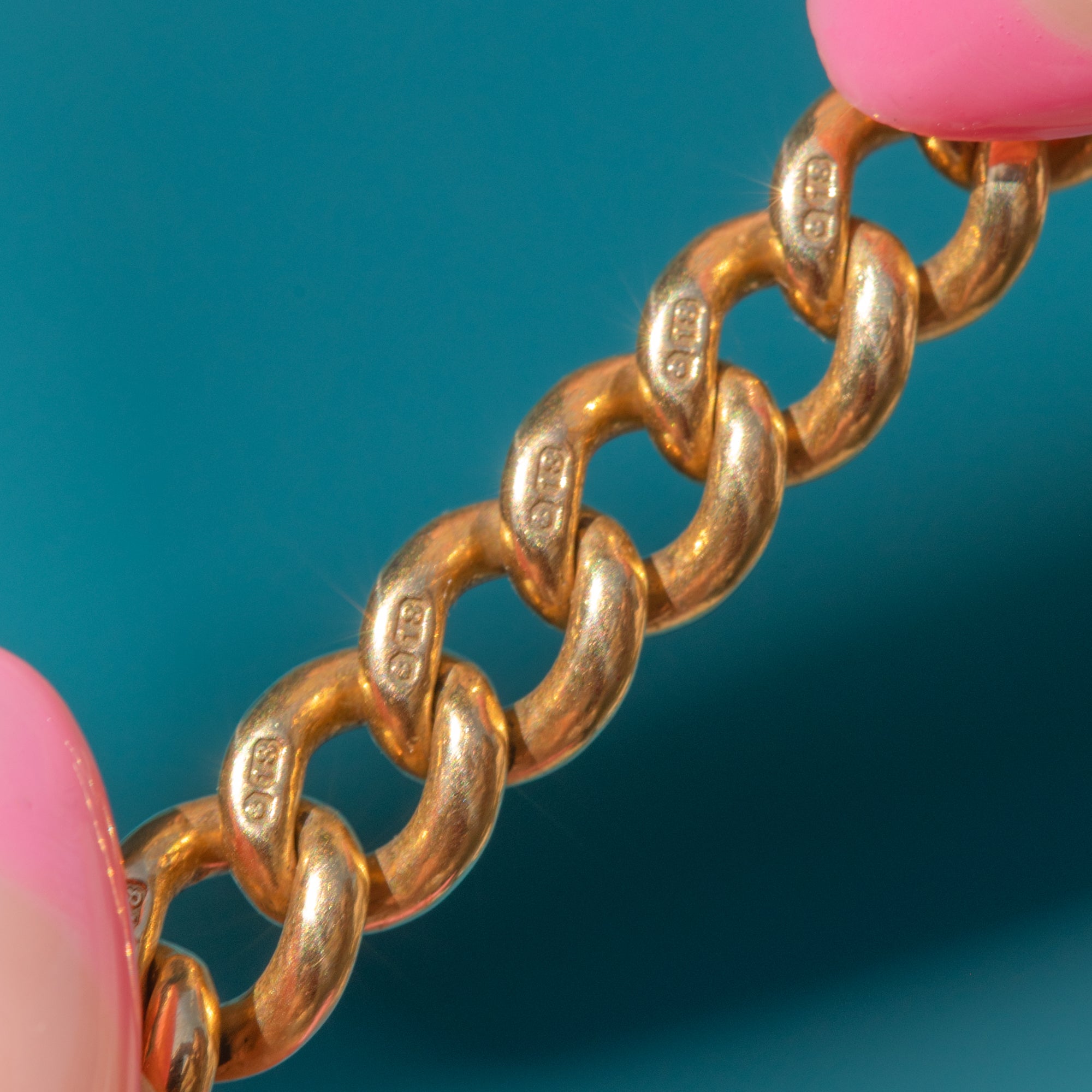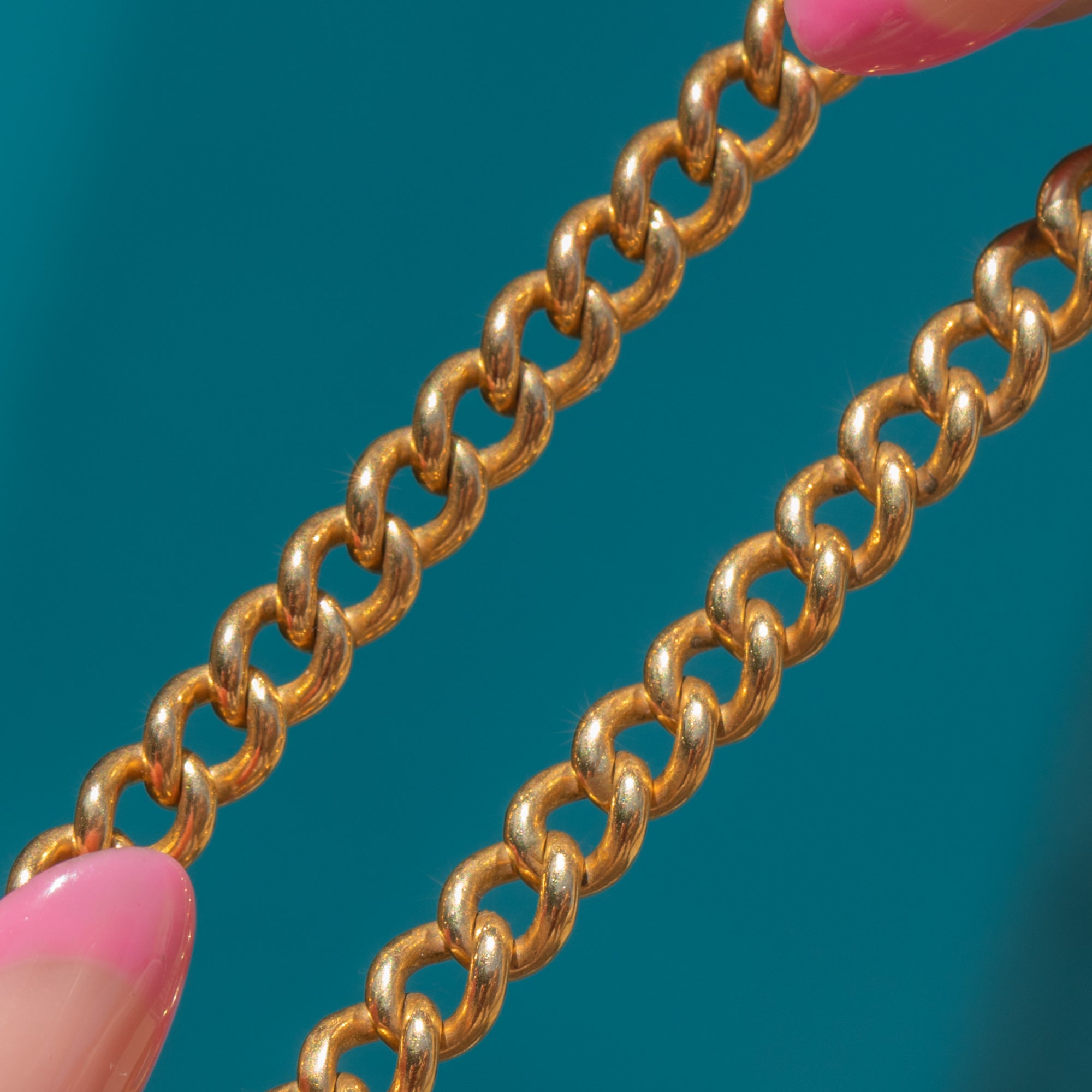 Crafted entirely from solid buttery 18ct Gold, this chunky antique chain weighs in at almost 50 grams and has a lovely glossy sheen throughout. With her interlocking belcher links cascading across your décolletage like liquid Gold, she is sure to impress from every angle!