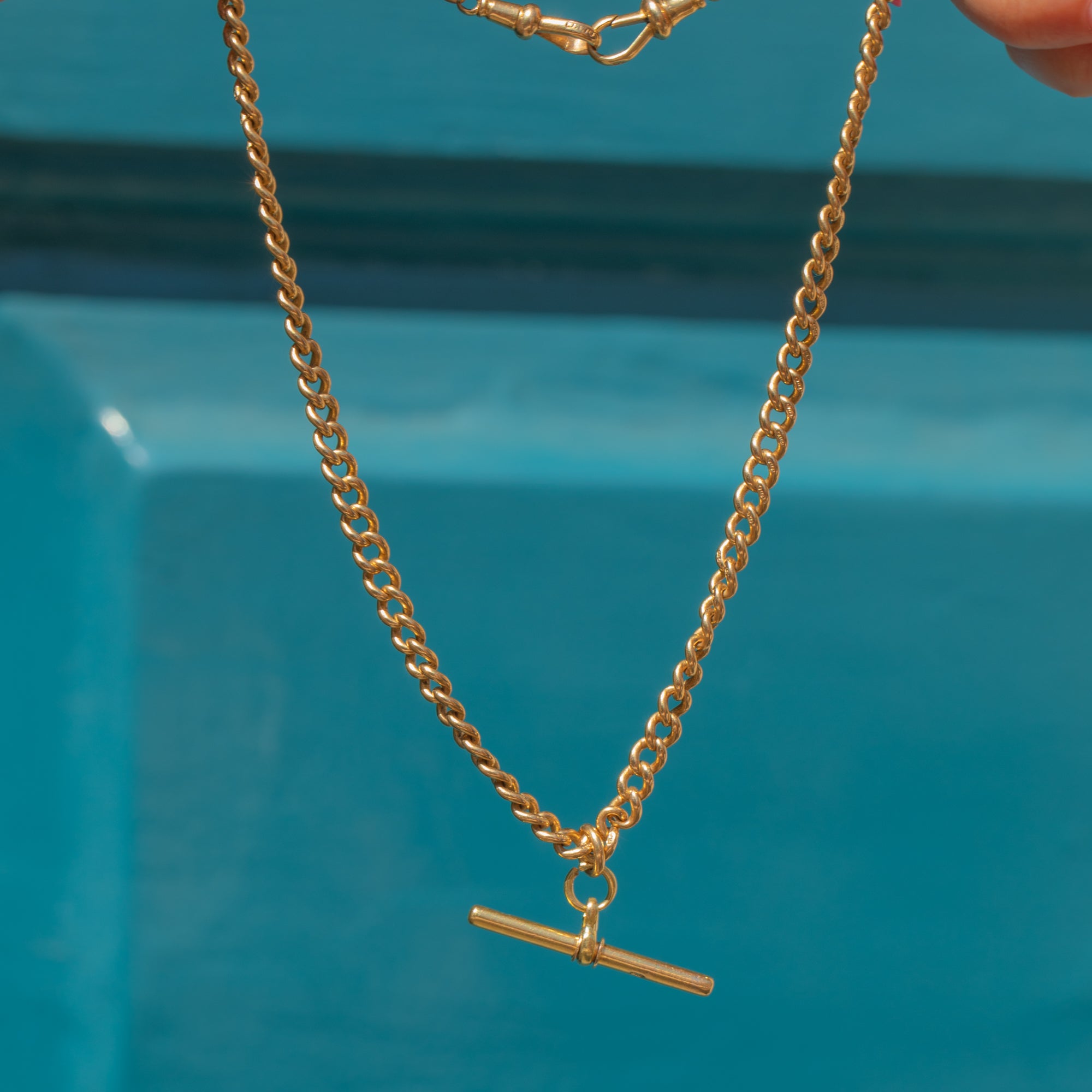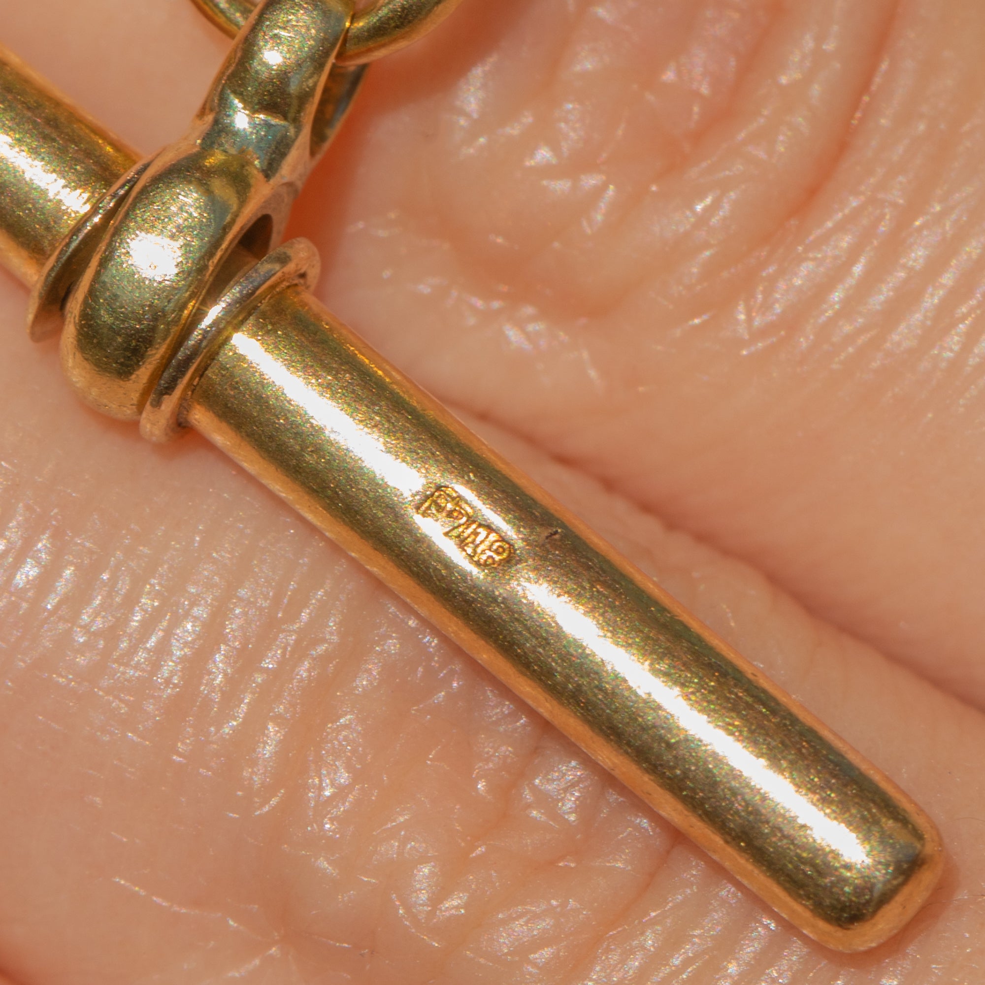 EXCELLENT: This antique 18ct Gold Albert chain is in great condition. The Gold is bright and buttery, and her t-bar is well soldered. Slight wear commensurate with being over 100 years old, but overall, all the links and connections are robust, and will bring another 100 years of enjoyment! A gorgeous piece, this antique chain is a must-have!