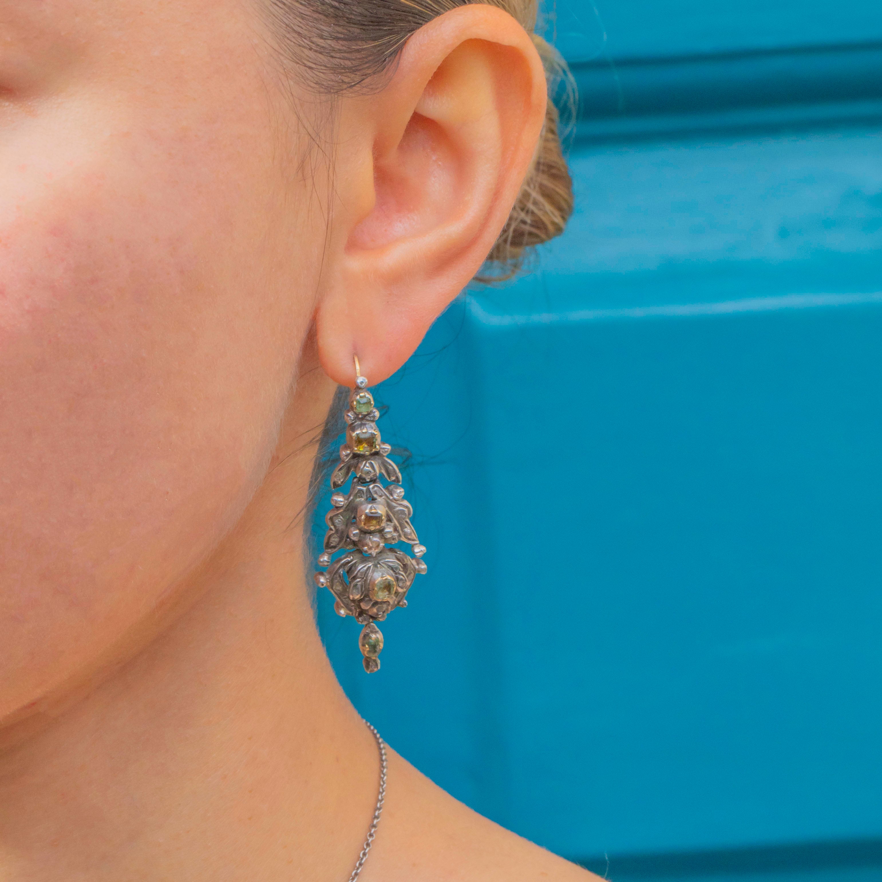 VERY GOOD-EXCELLENT: Considering their age, these Georgian earrings are in superb condition. The gemstones are all securely set with only minor age-related wear. The Silver and Gold settings retain their beautiful antique patina, with no damage or restoration visible.