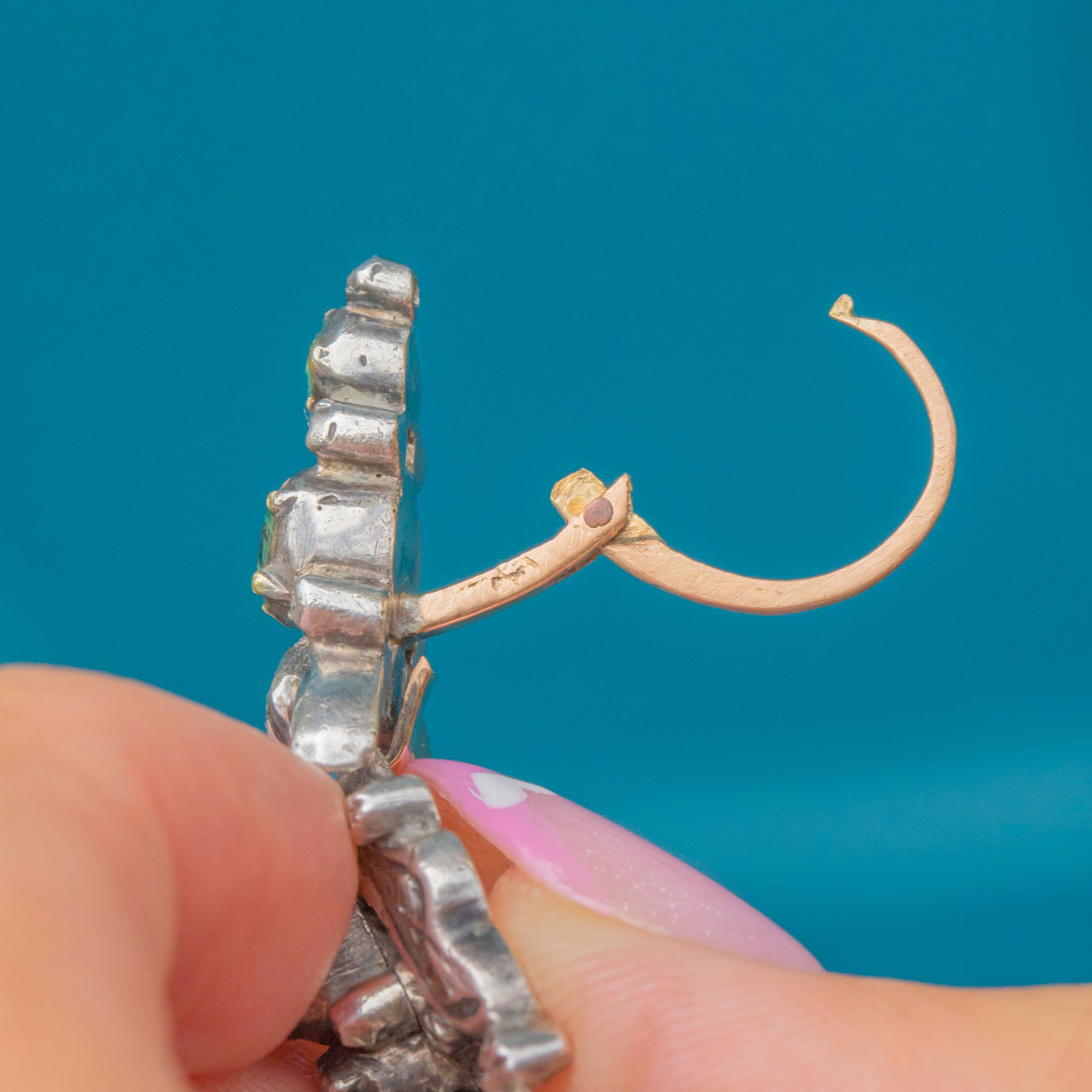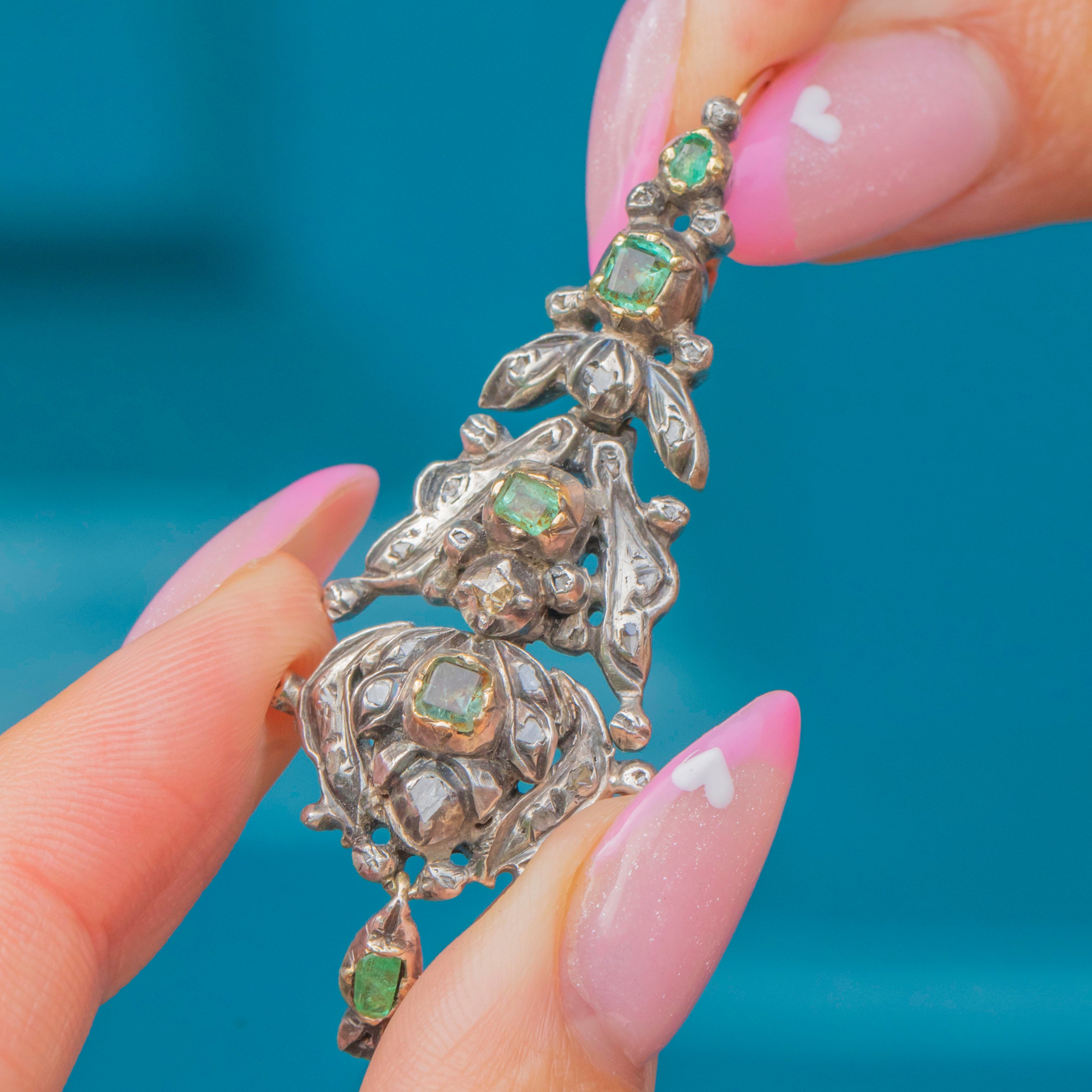 These exceptional Georgian Iberian earrings are an extraordinary survival from the 18th century, beautifully showcasing the region’s distinctive jewellery style. Crafted in Silver backed in 9ct Gold, they feature a dazzling arrangement of natural Emeralds and old-cut Diamonds, each stone individually set to create movement and sparkle when worn.