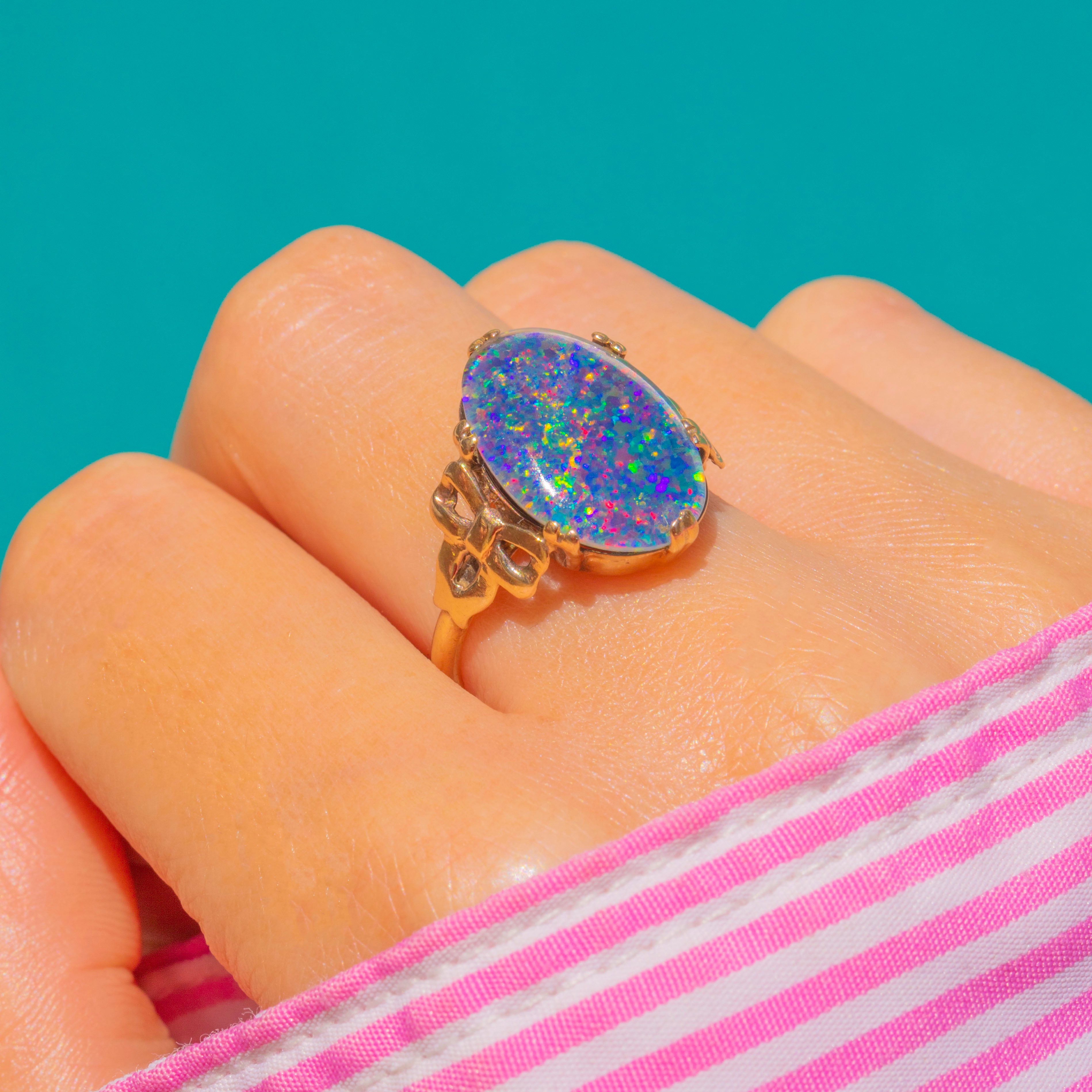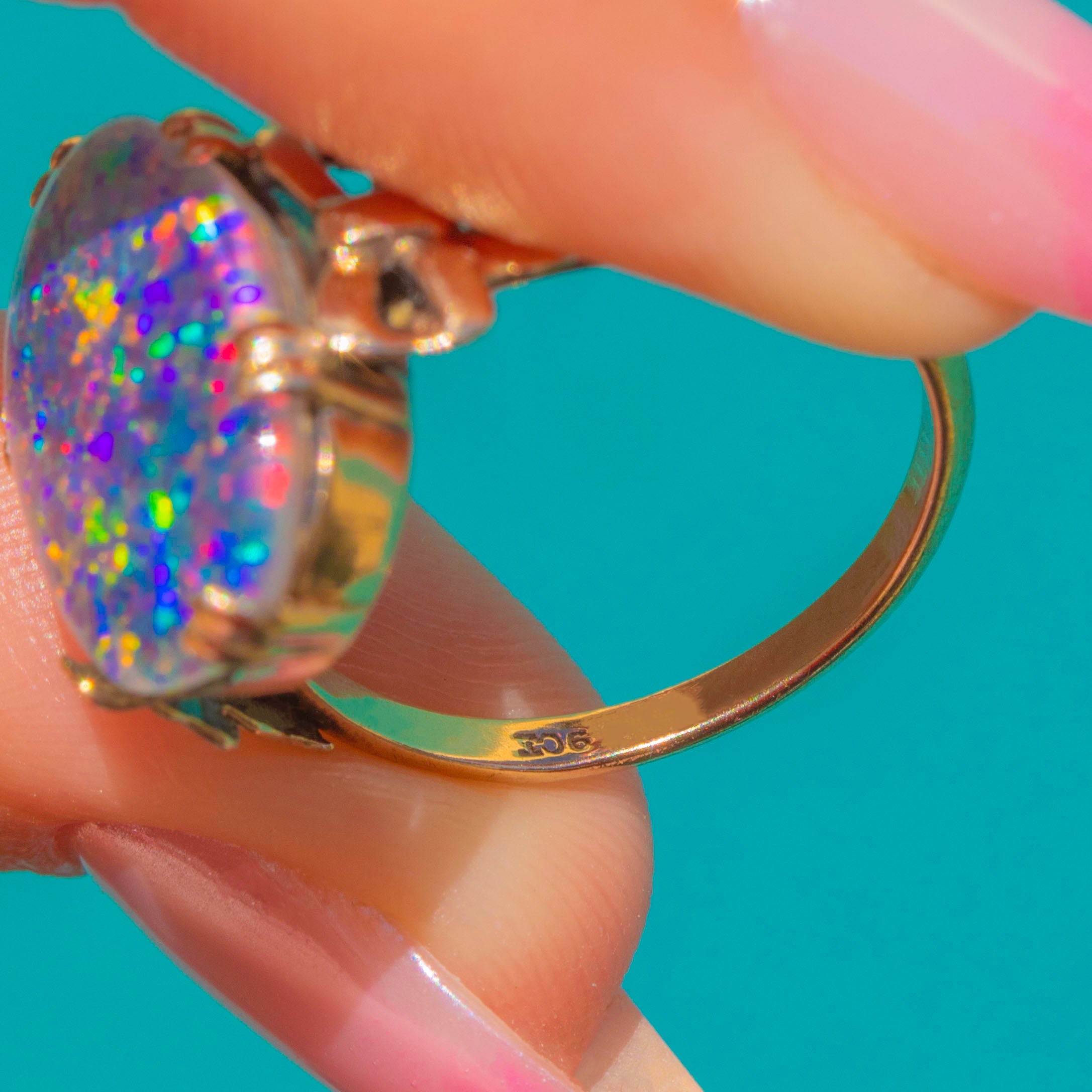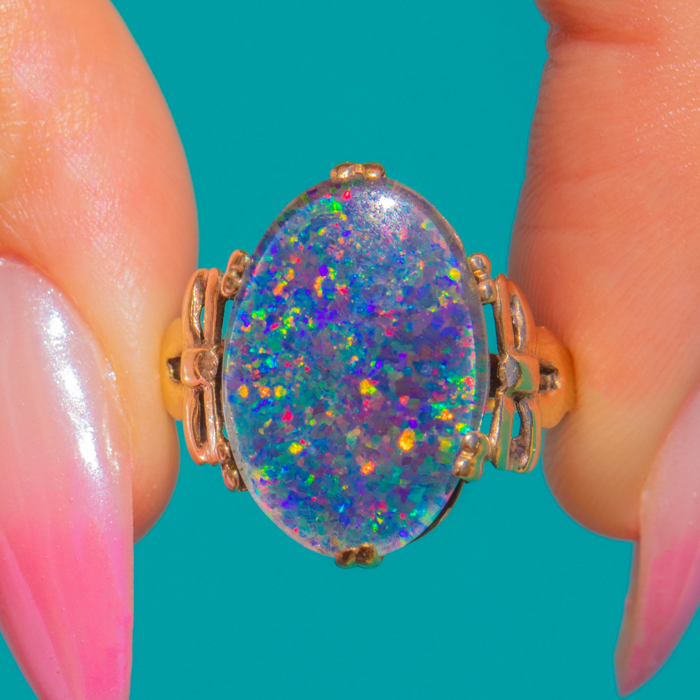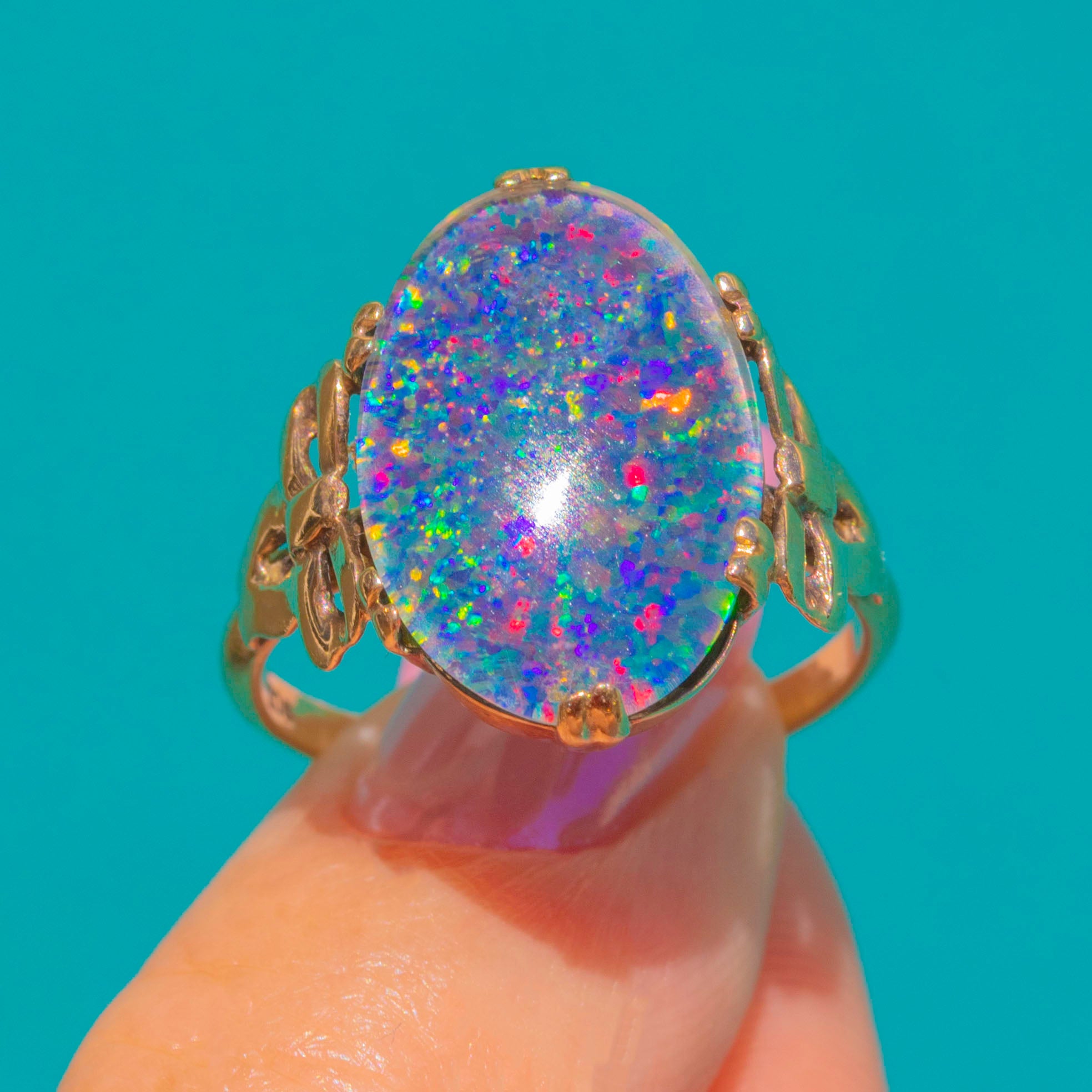 A shimmering statement of vintage glamour, this 9ct Gold dress ring showcases a high-domed Opal Triplet alive with electric blues and violets, flickering with greens, golds and fiery reds. The glossy cabochon is cradled by neat claws, its colour play elevated by the warm glow of Gold.