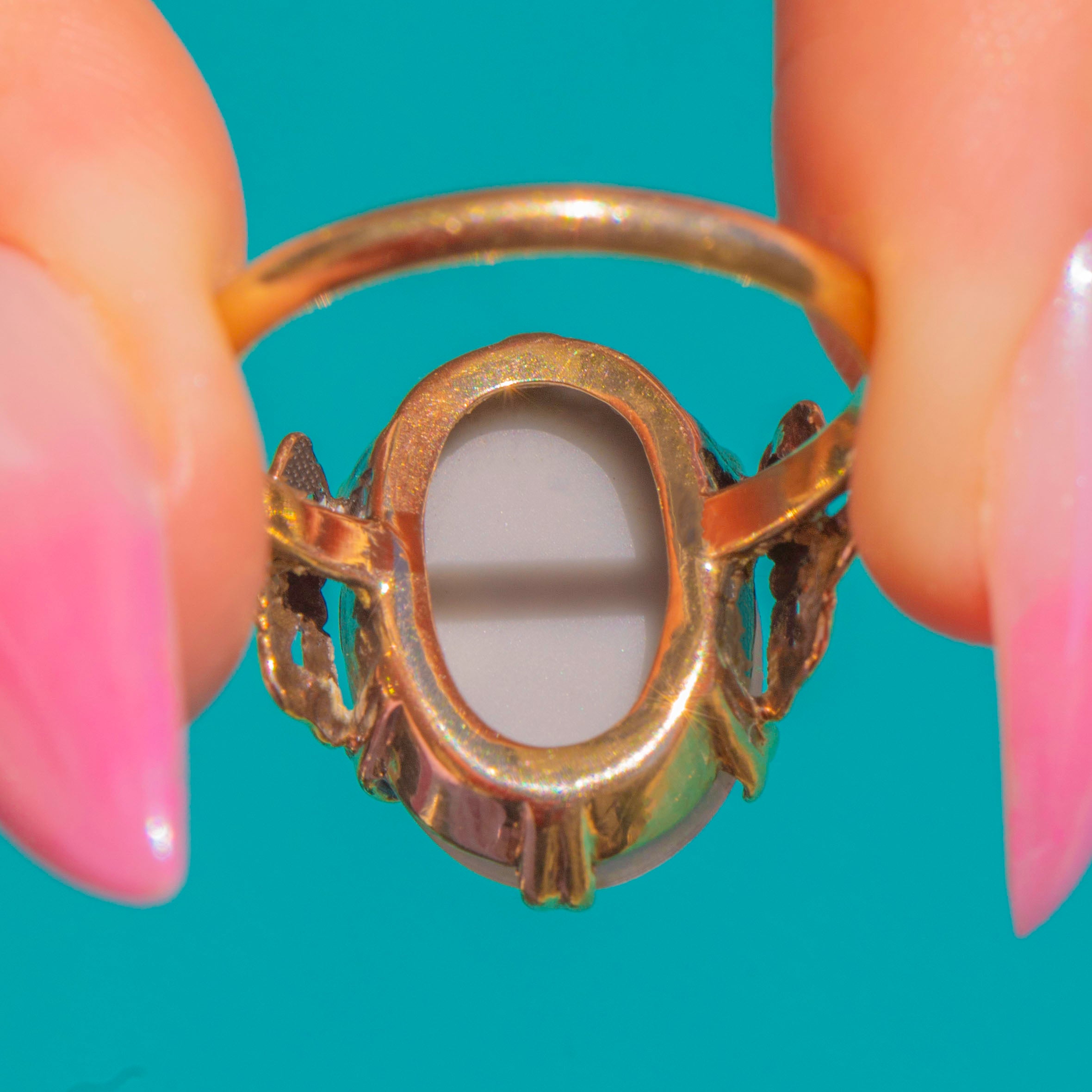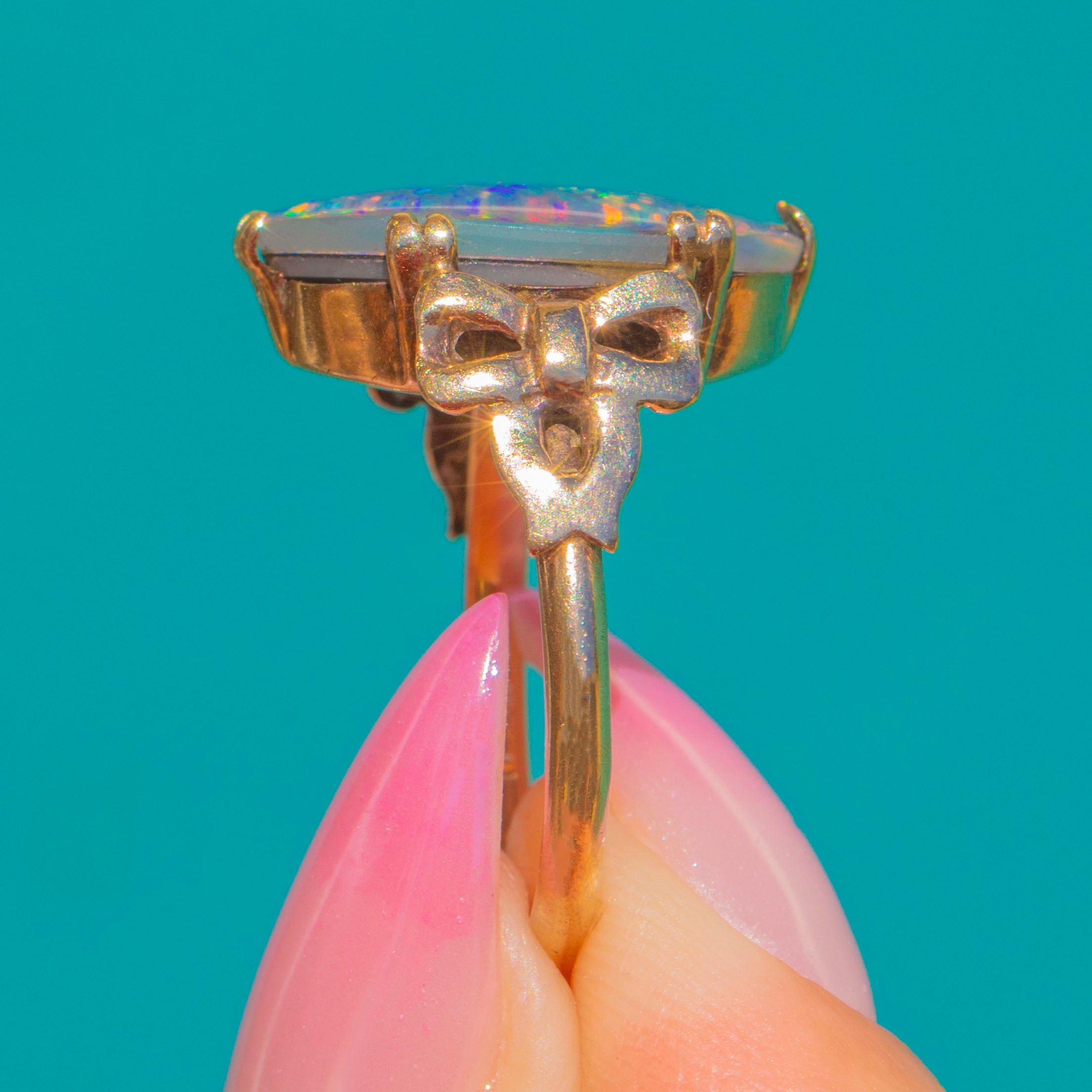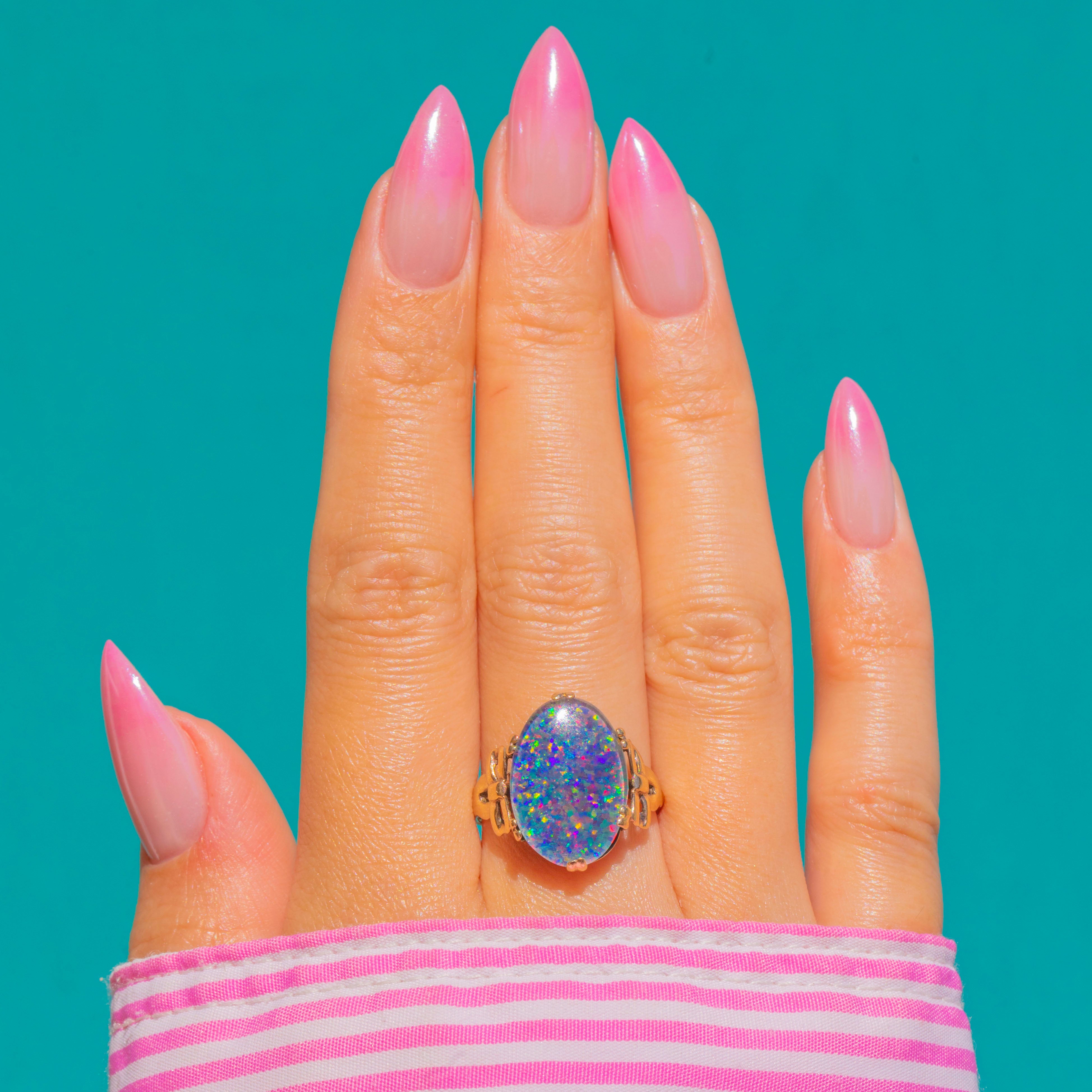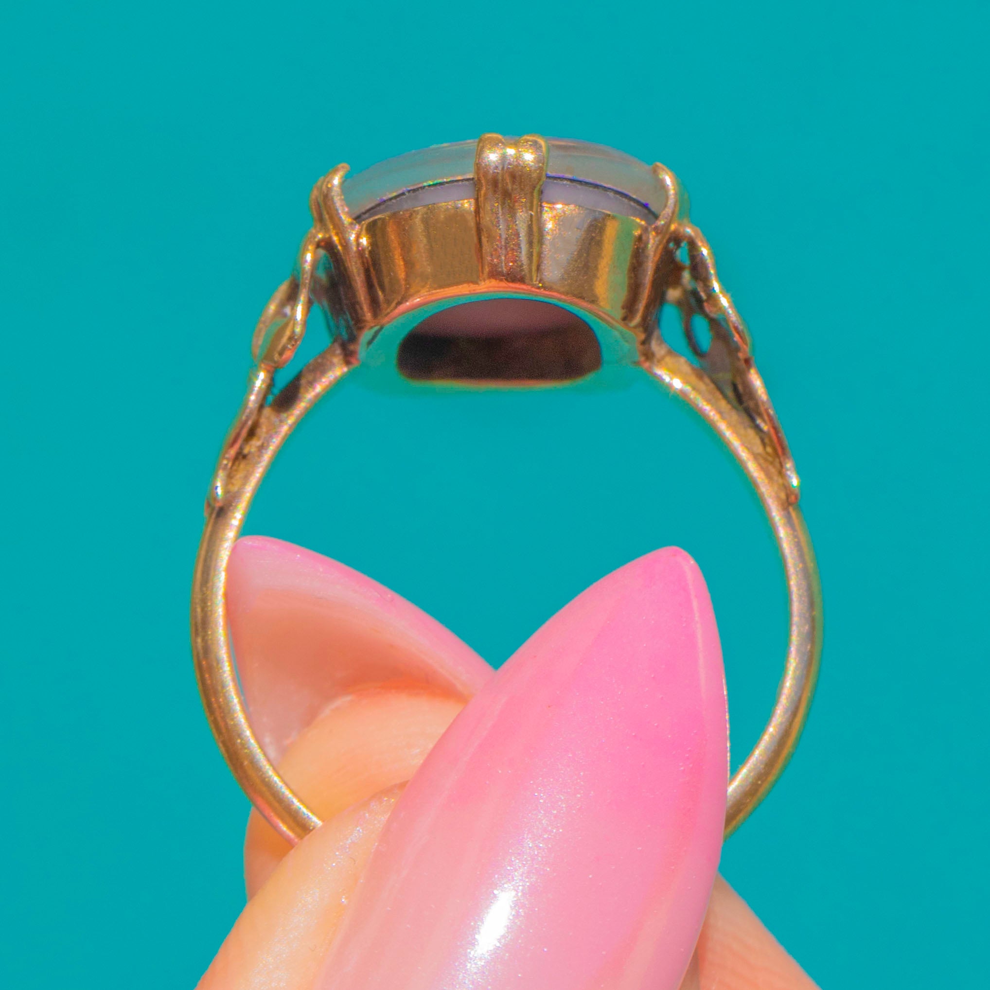 A shimmering statement of vintage glamour, this 9ct Gold dress ring showcases a high-domed Opal Triplet alive with electric blues and violets, flickering with greens, golds and fiery reds. The glossy cabochon is cradled by neat claws, its colour play elevated by the warm glow of Gold.