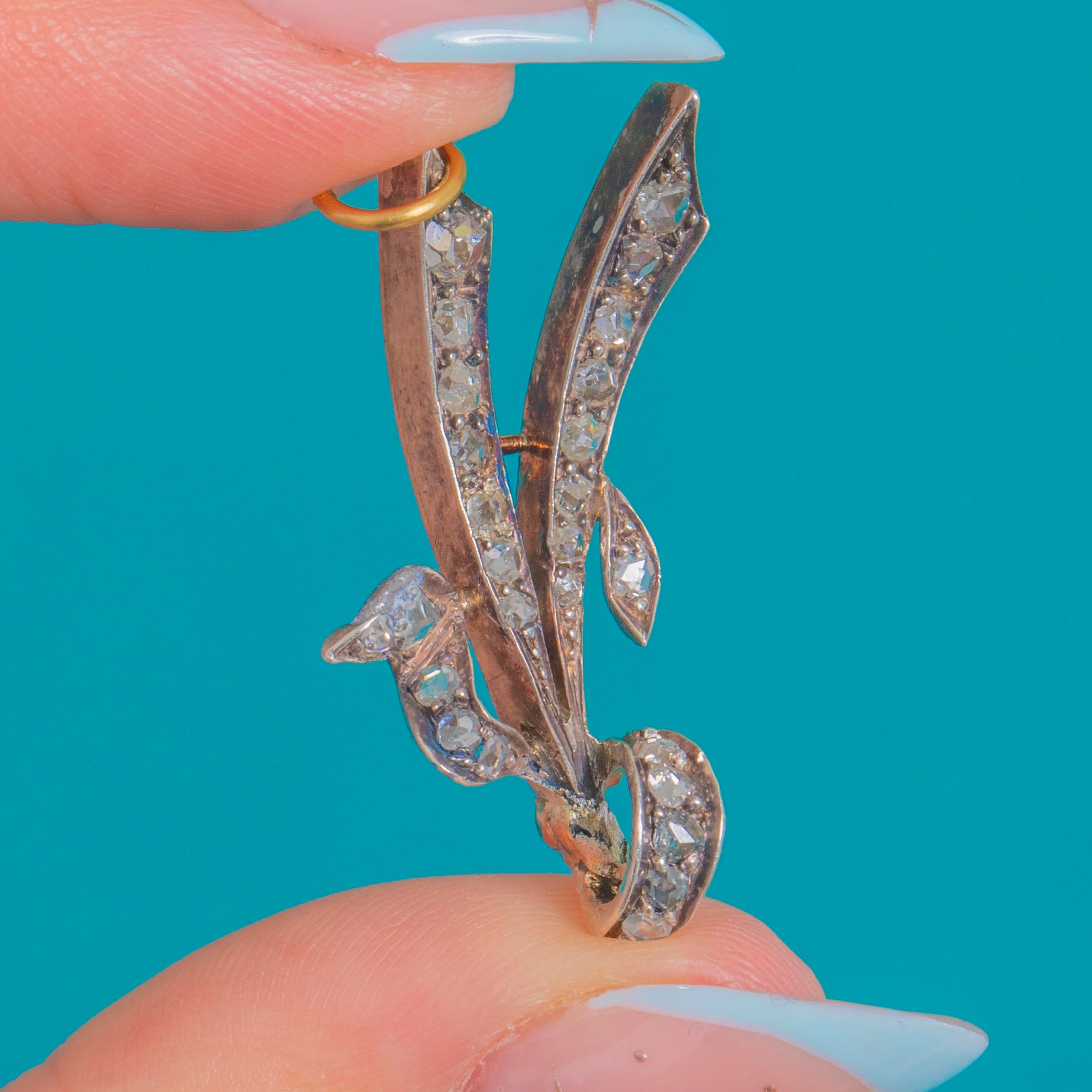 A lyrical Victorian foliate pendant composed as a curling ribbon and leafy sprig, dotted throughout with twinkling rose-cut Diamonds, the design alive with movement and delicate, naturalistic detail.