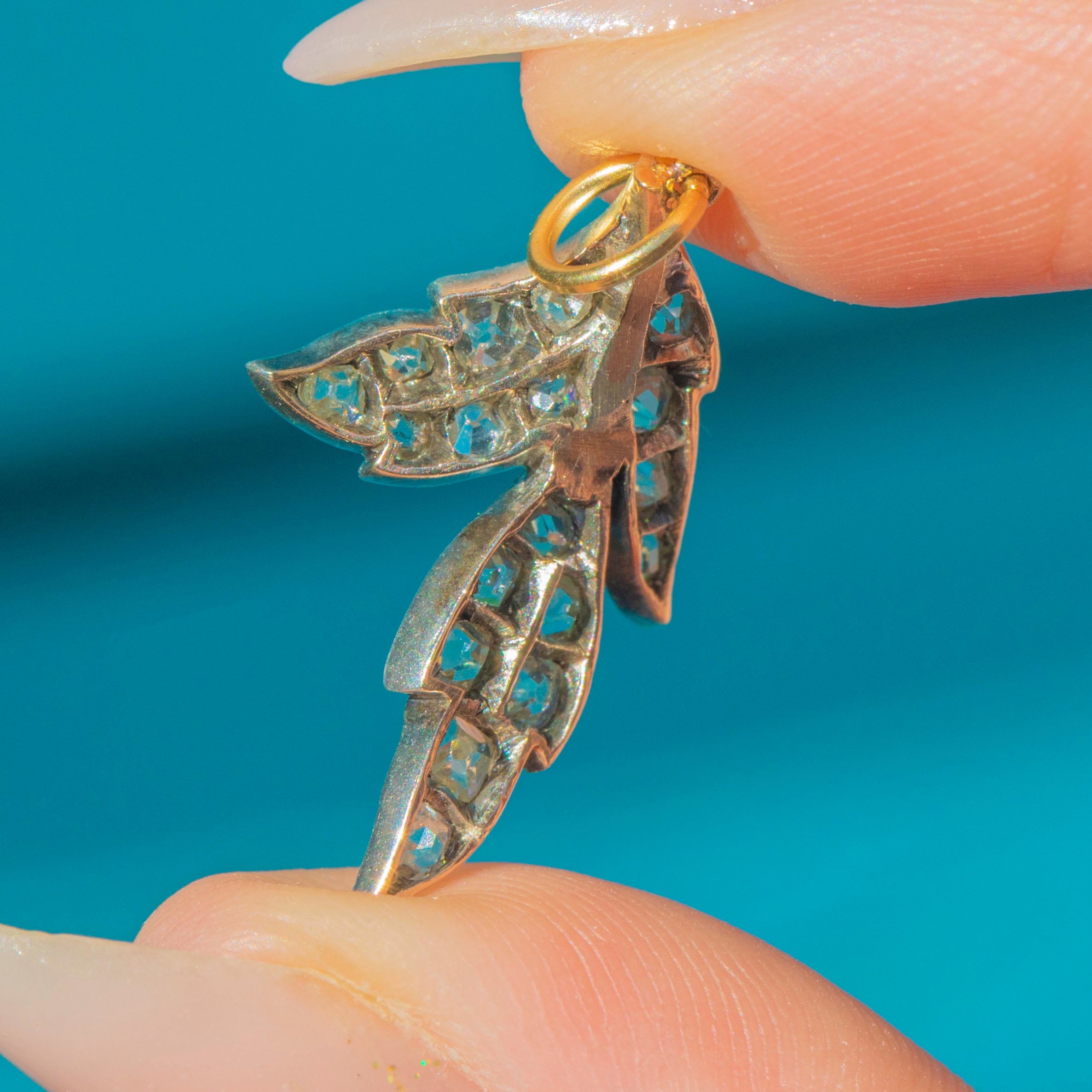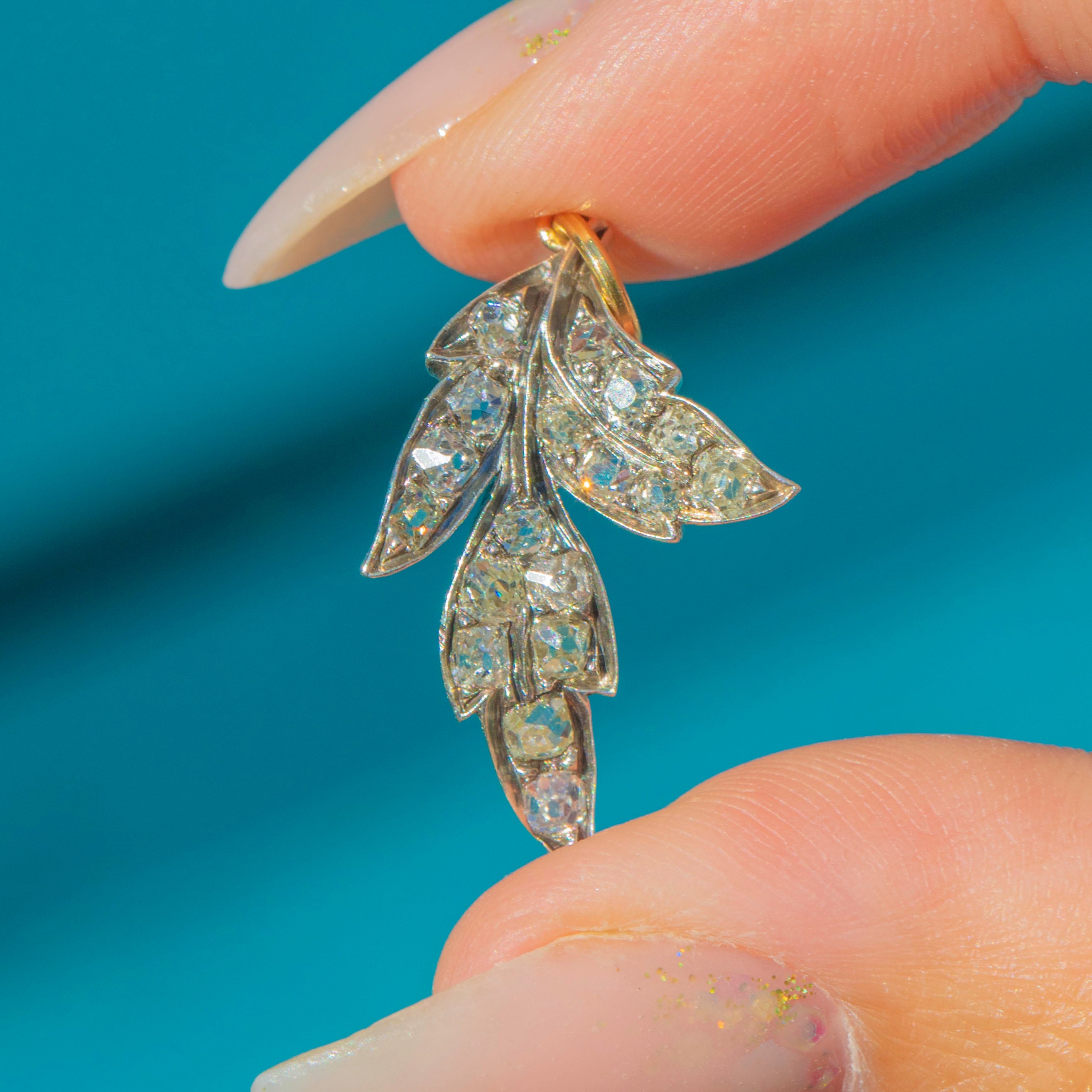 Large Antique 18ct & Silver Old Mine Cut Diamond Leaf Charm 0.70cts