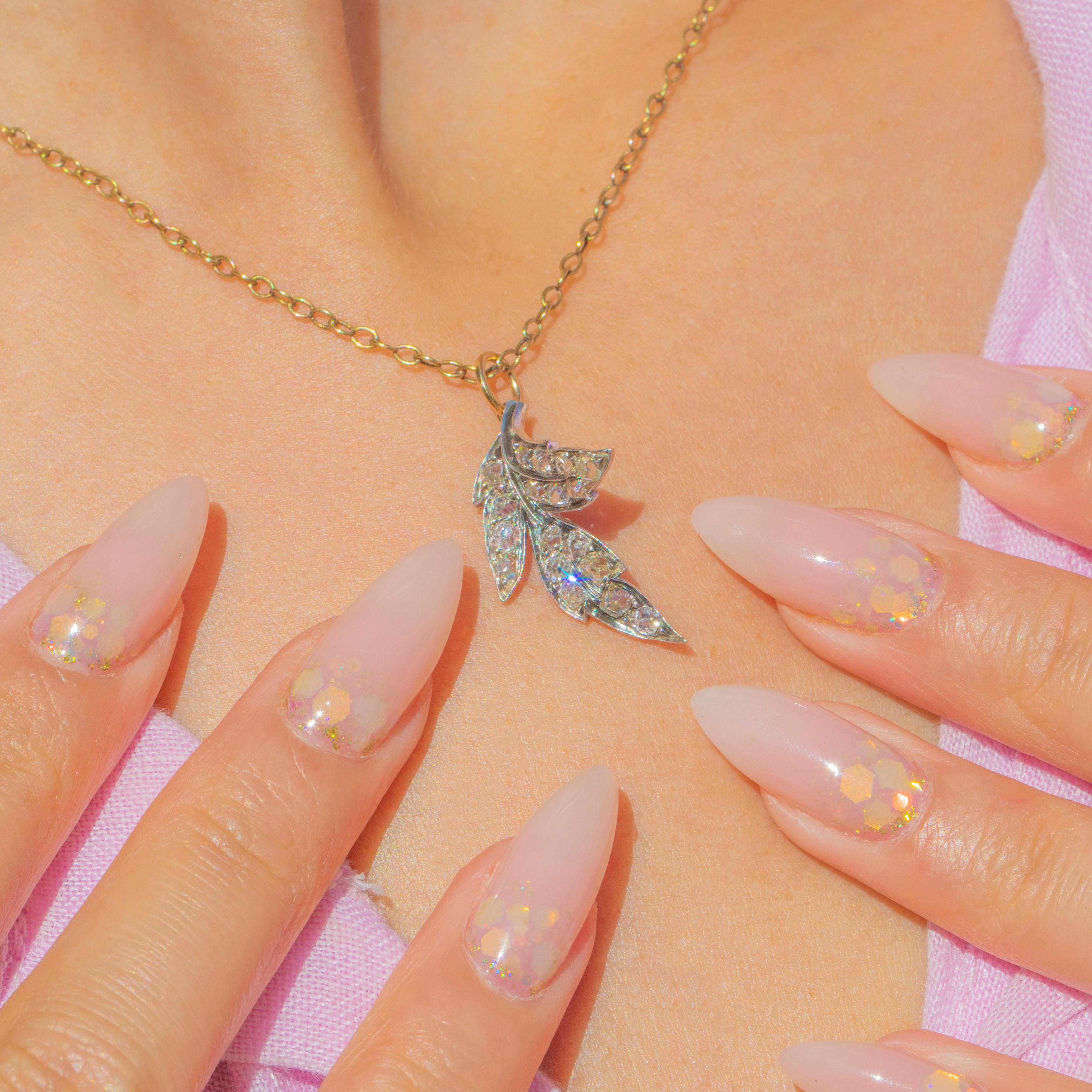 This large Victorian Diamond leaf charm is a striking jewel, beautifully capturing the naturalistic designs of the 19th century. Crafted in Sterling Silver with an 18ct Gold backing and jump ring, it is set with a sparkling array of 18 old mine-cut Diamonds.