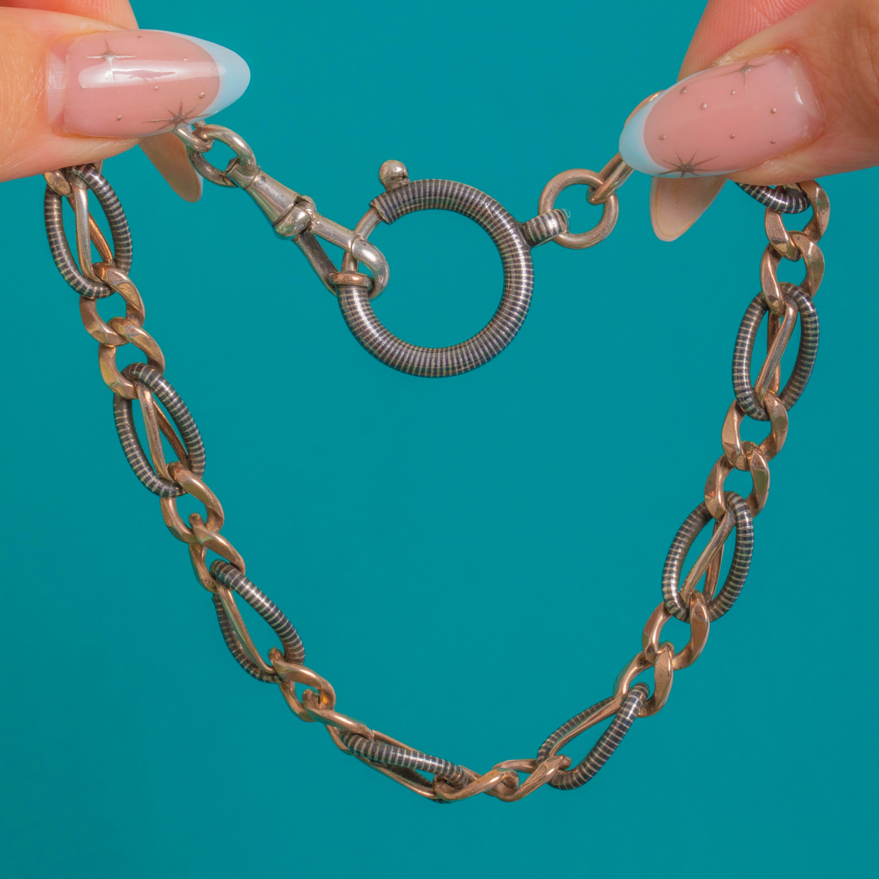 Crafted from 800 Silver with Gold gilding and classic Niello detailing, this piece is both functional and stylish—perfect for extending an Albert chain, curating a charm stack, or styling as a bracelet. The dark, glossy Niello set against the gilded links gives a sumptuous, moody glow that’s effortless to wear.
