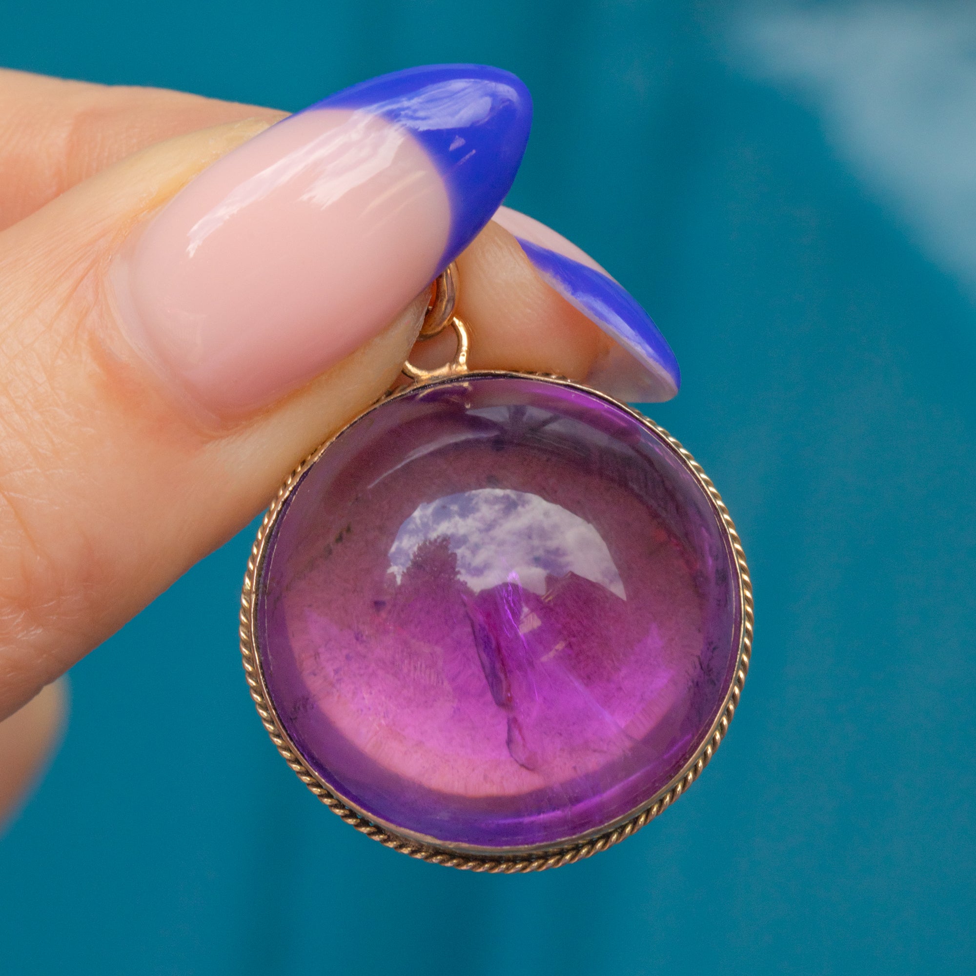 If you're a lover of Amethysts, this large Victorian 9ct Gold Amethyst cabochon pendant will definitely tickle your fancy! An unmissable 34.50ct Amethyst cabochon, akin to a mystical orb, takes centre stage embraced by a 9ct Gold bezel setting.
