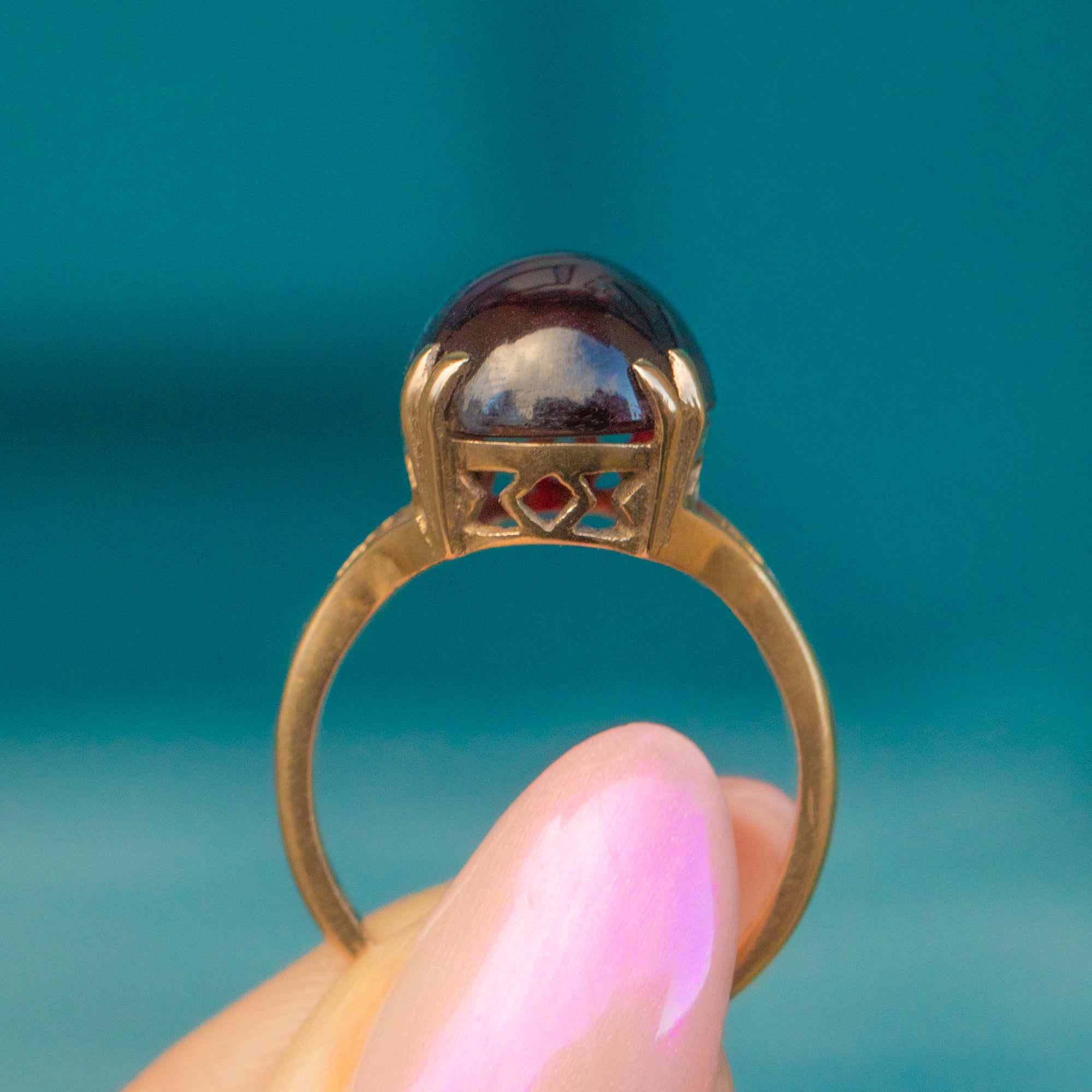 EXCELLENT. This 9ct Gold Ruby cabochon ring is in excellent condition. The ring has a lovely synthetic Ruby in its centre, which secure and smooth with no surface wear to note. There is one shallow inclusion on one side of the Ruby, which can be admired up close. The Gold is buttery and the band comes complete with a full set of English hallmarks inside the band.