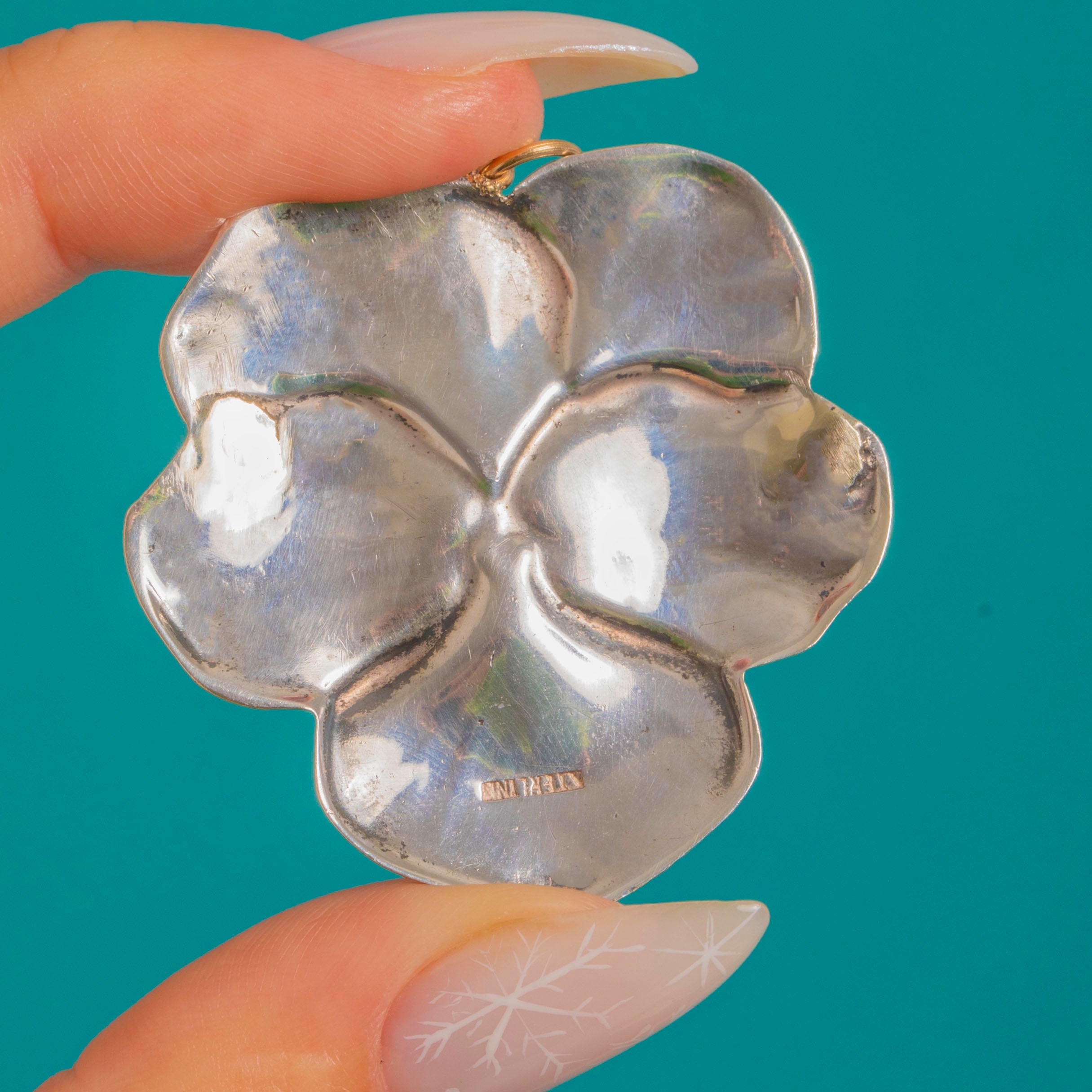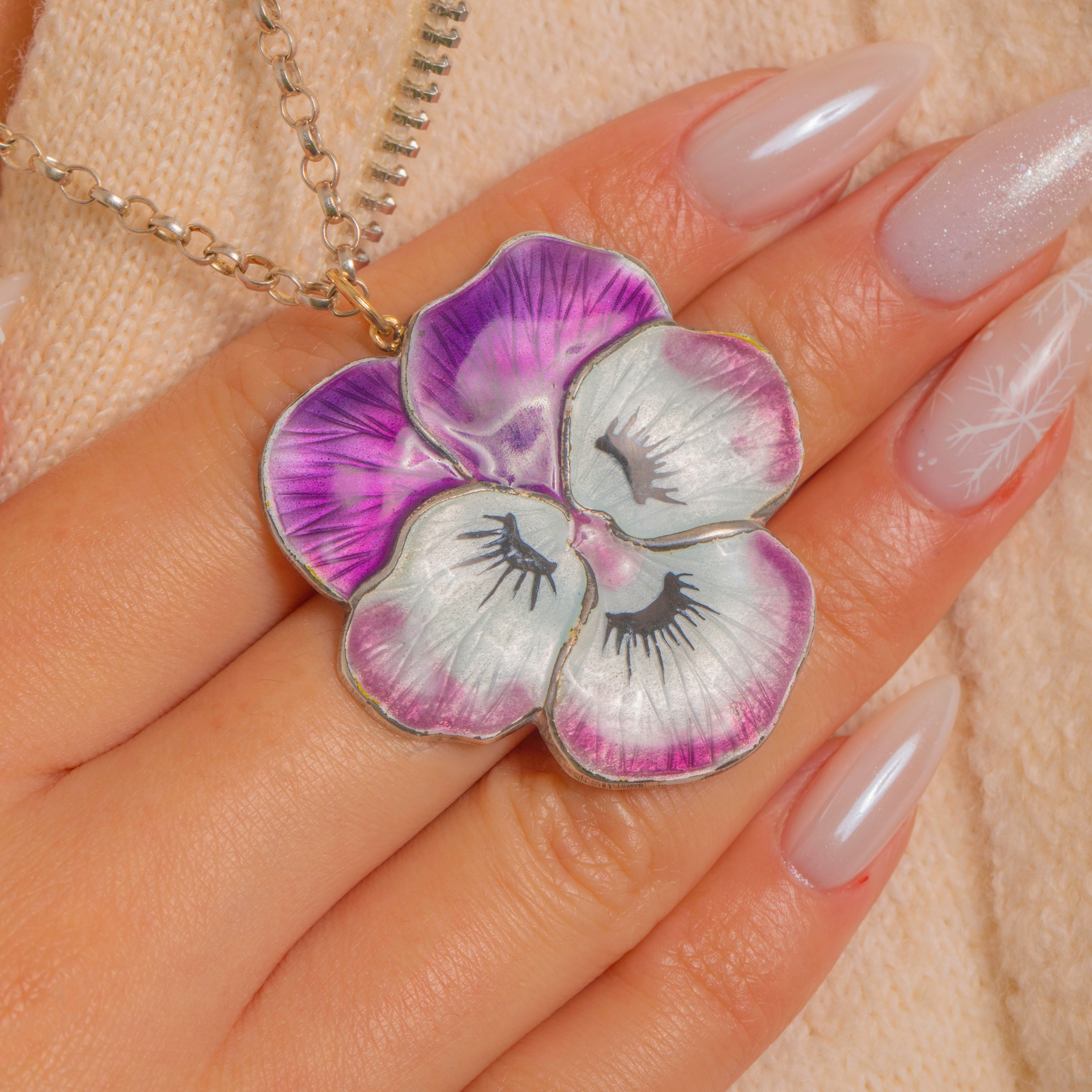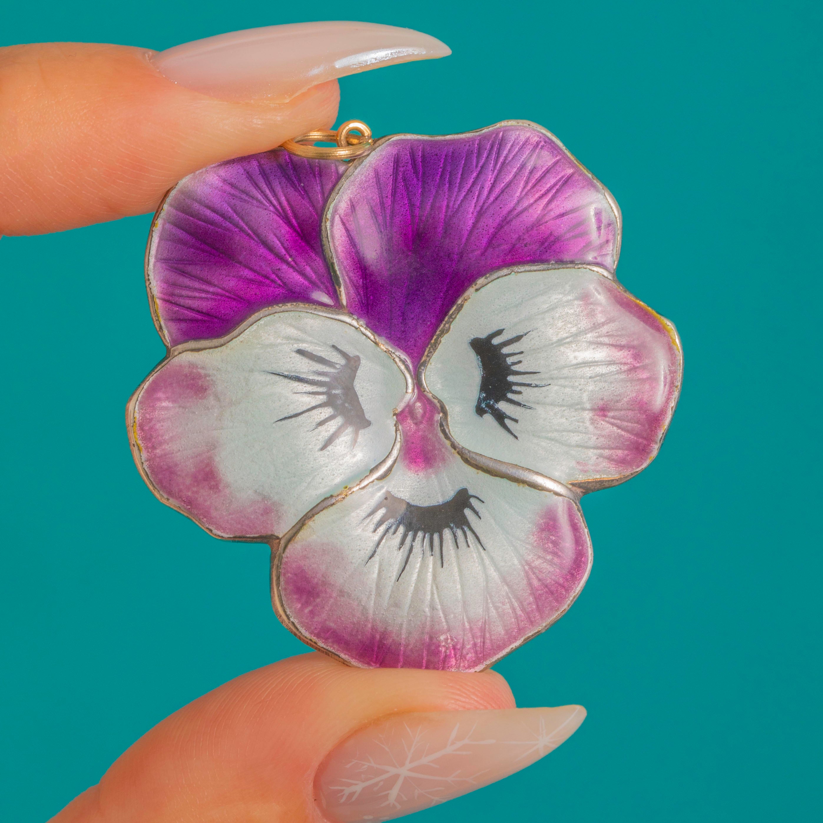 A joyful mid-century take on the beloved pansy, this Vintage Sterling Silver pendant is ablaze with shaded Enamel graduating from deep violet through lilac to white. Delicate black painted details define the petals at the flower’s heart.