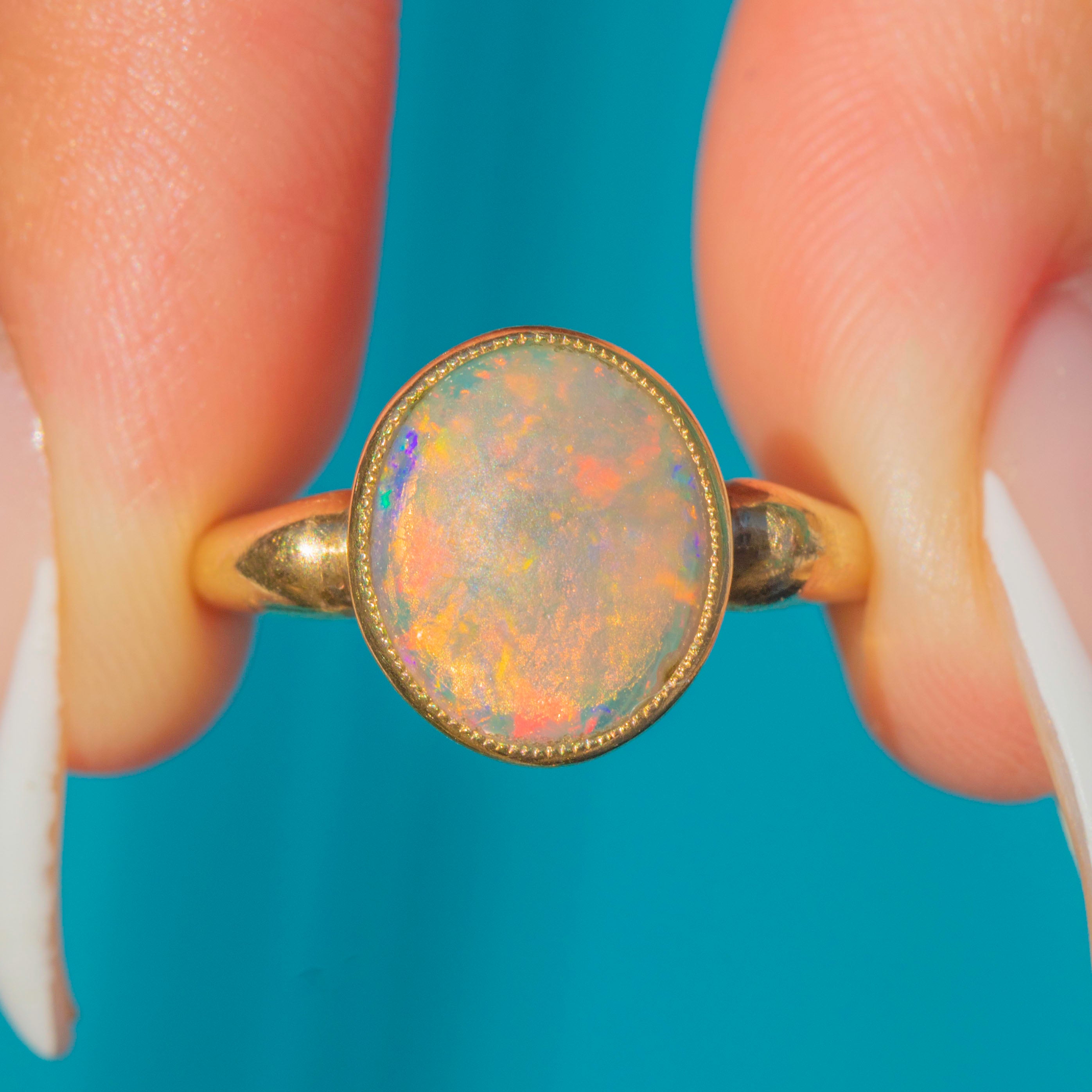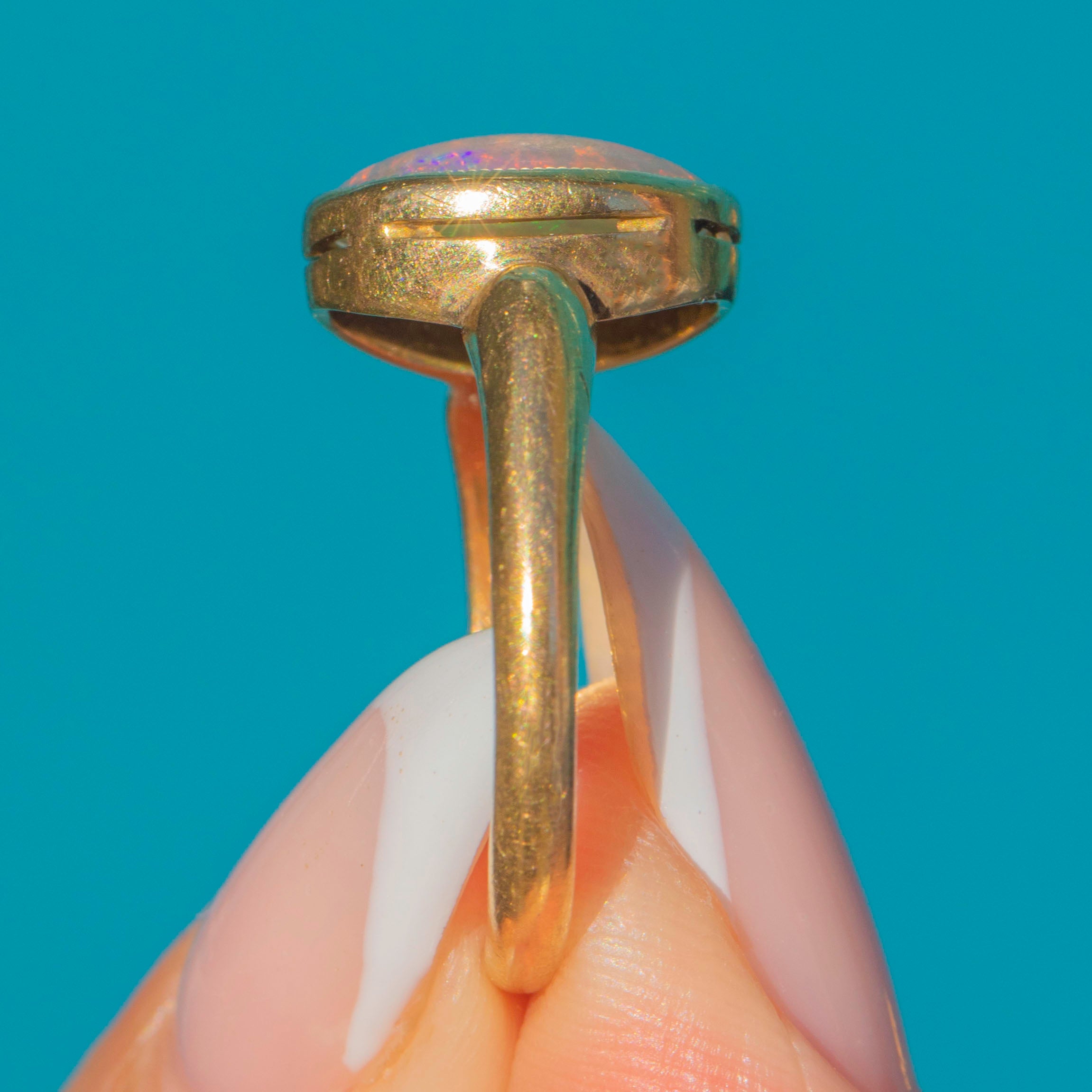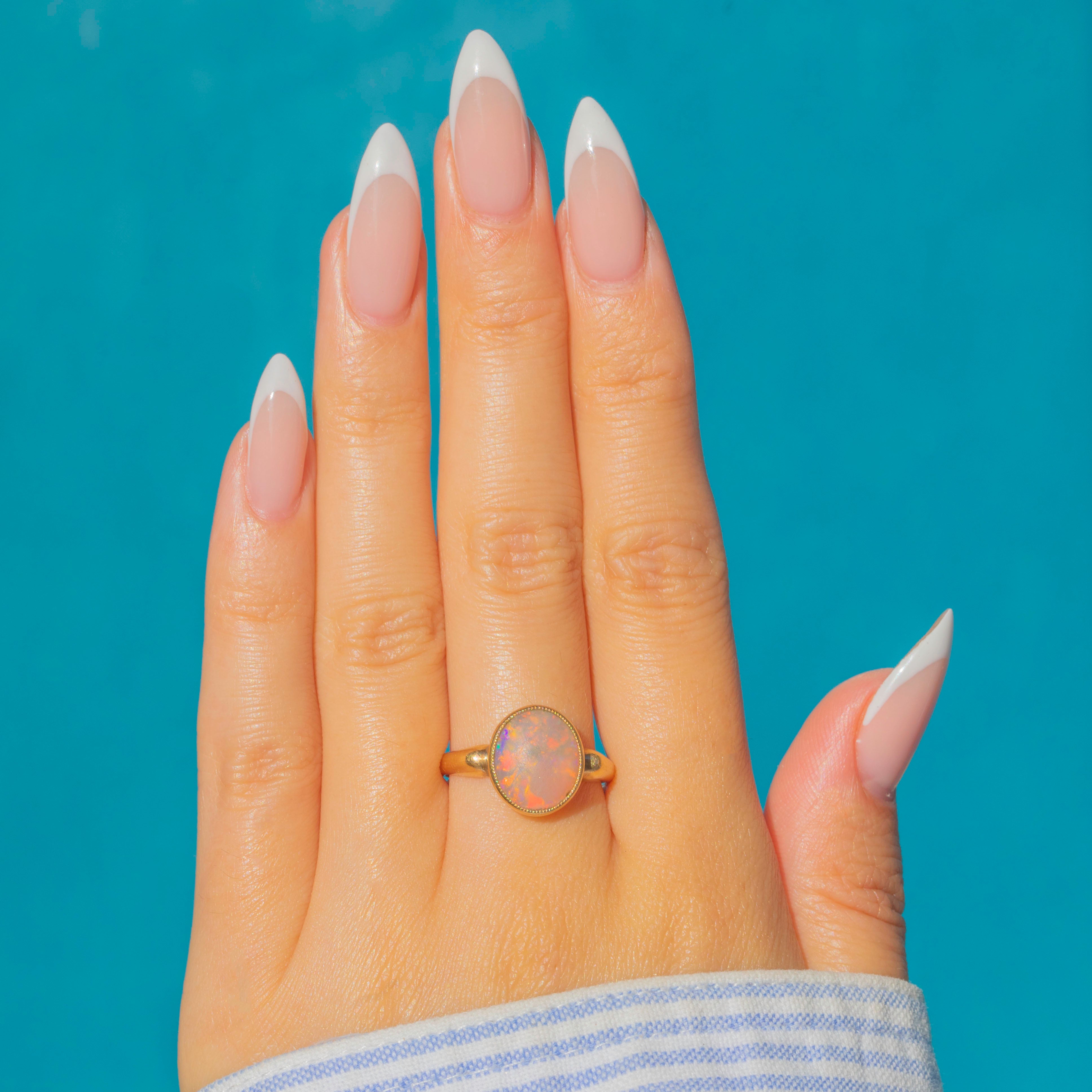 Measuring 10 x 11.5mm, the Opal displays a low dome profile with a moody, shifting play of colour. Flashes of orange, green, and purple dance across the surface as it catches the light.