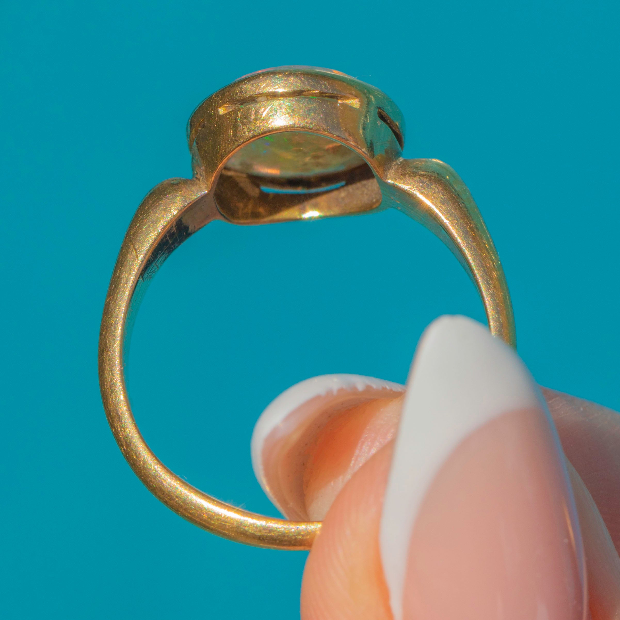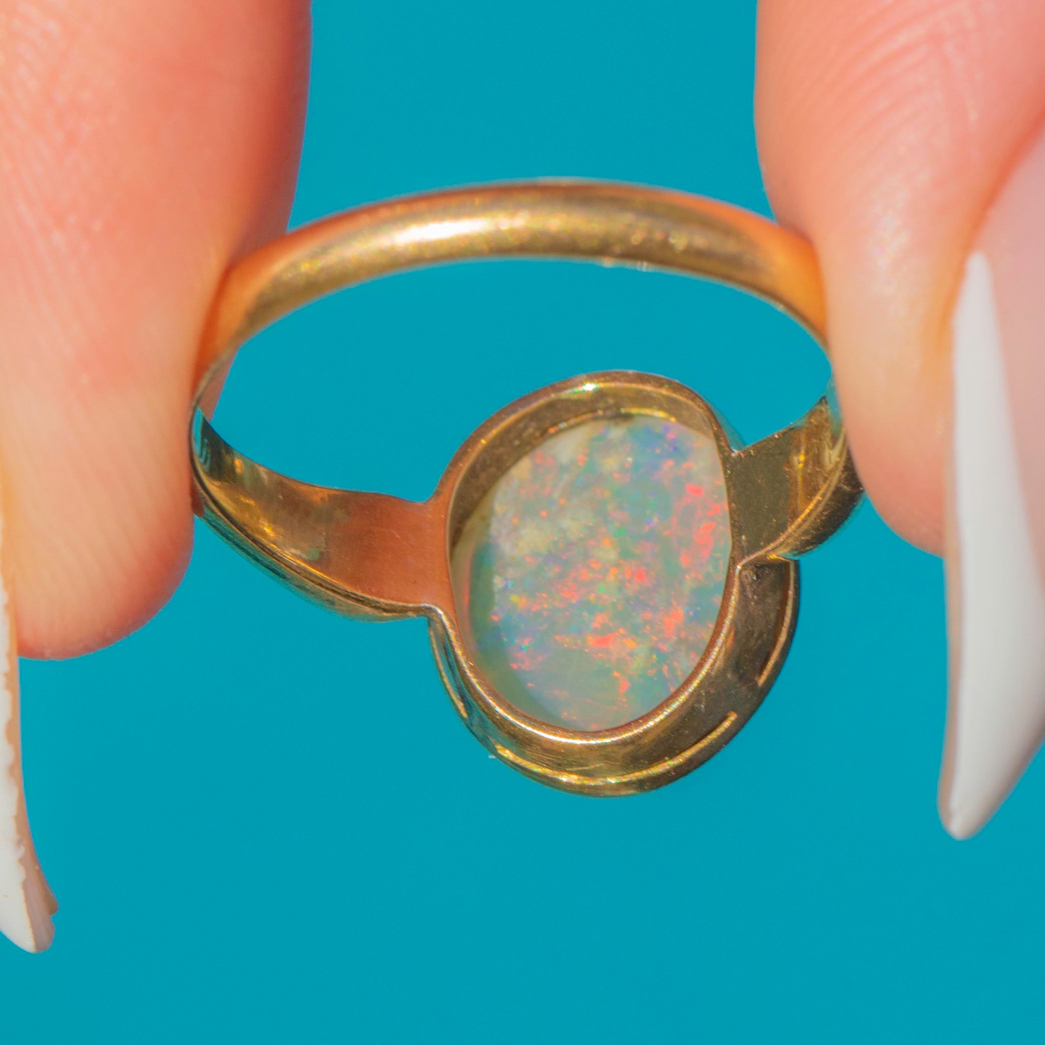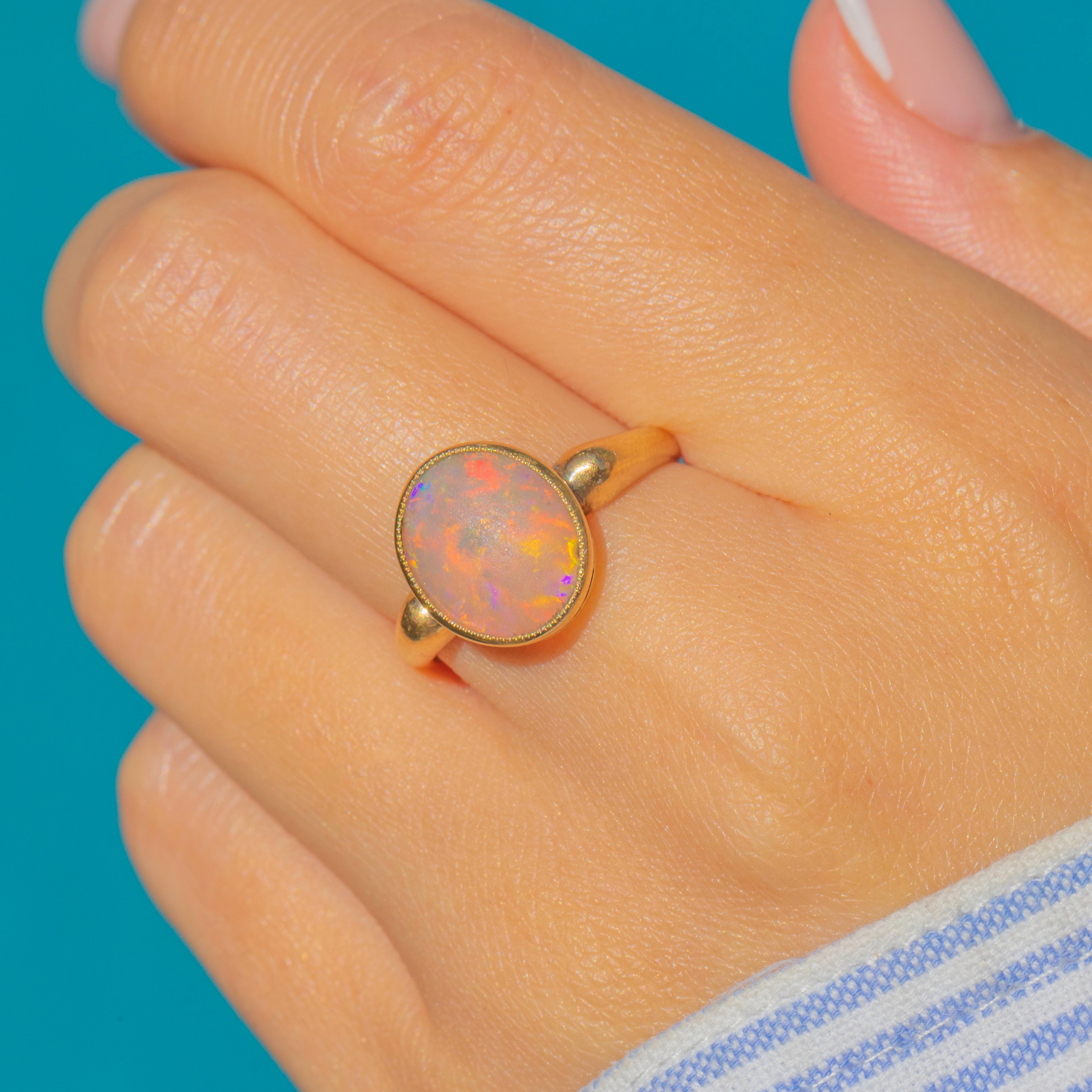 VERY GOOD: The Opal shows moderate surface wear consistent with age, but its play of colour remains vivid. Band and setting are secure and well-preserved.
