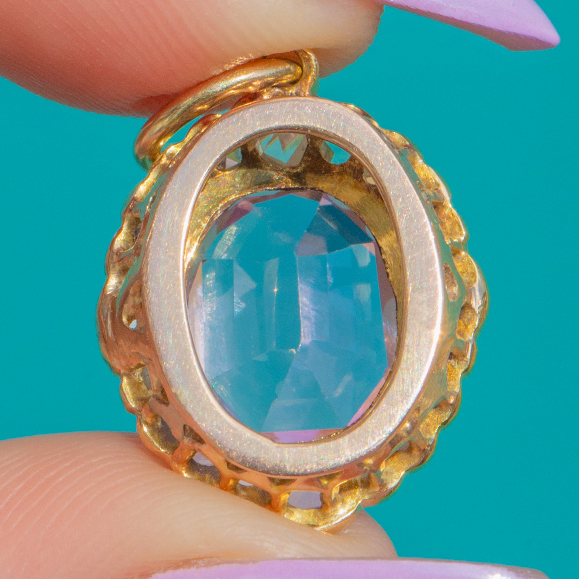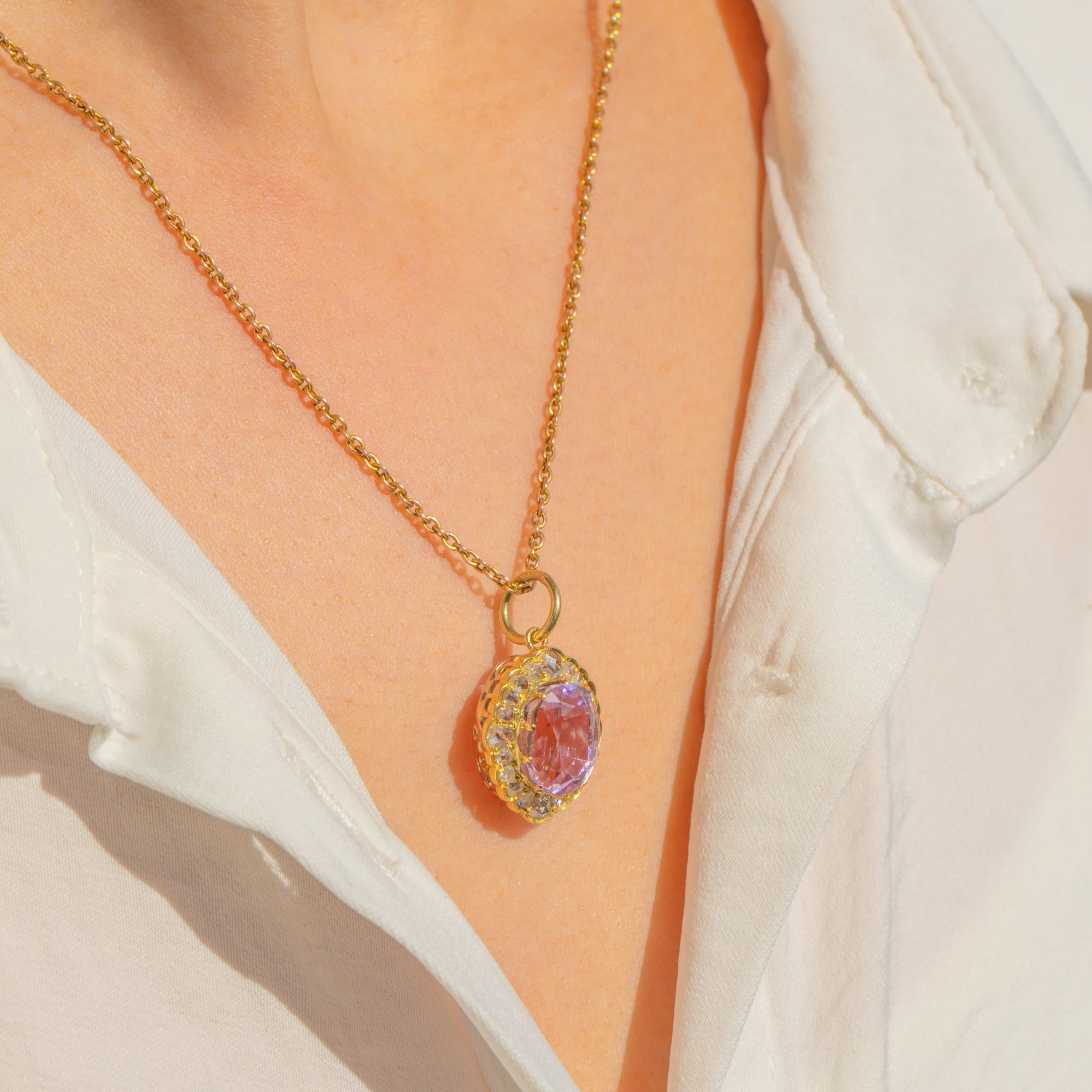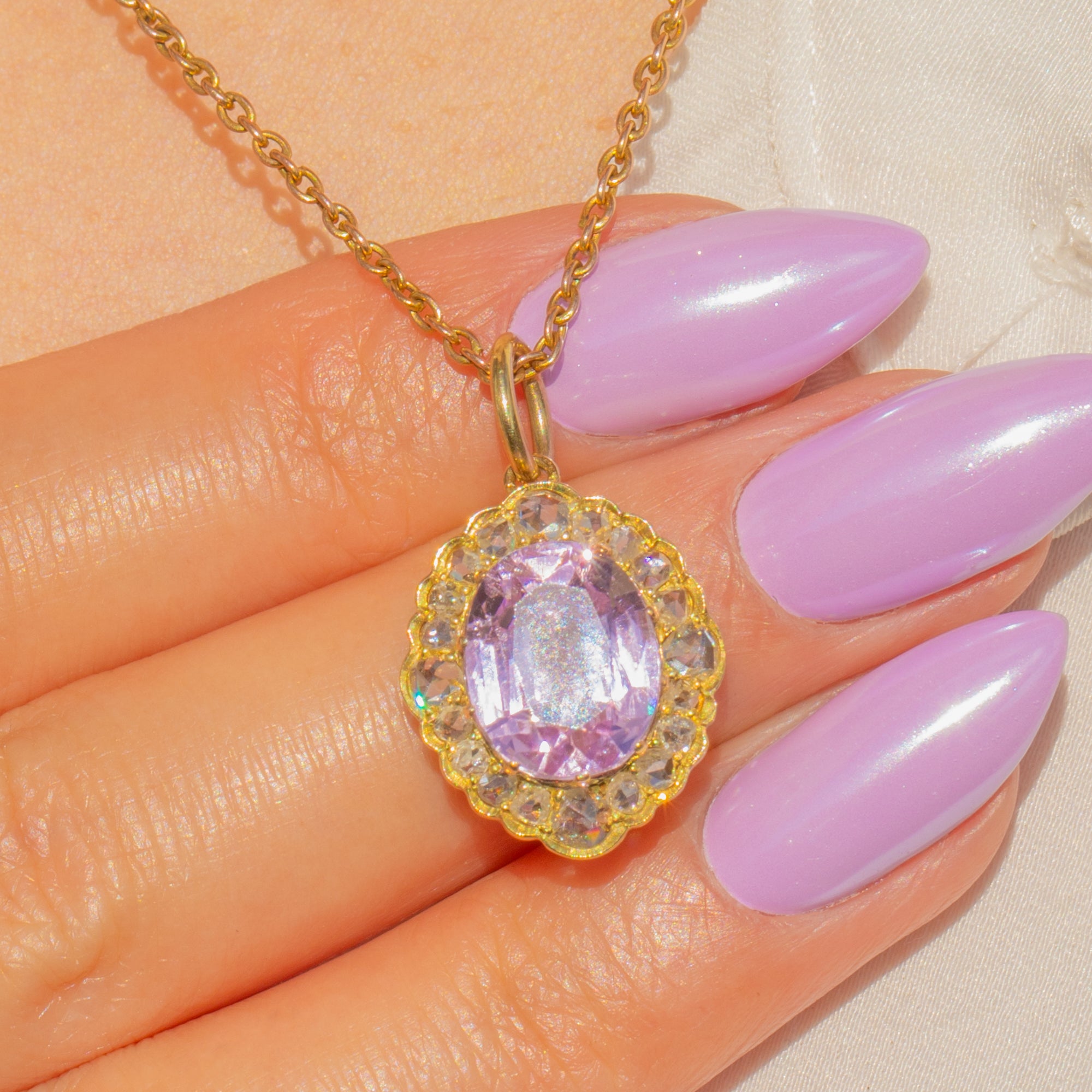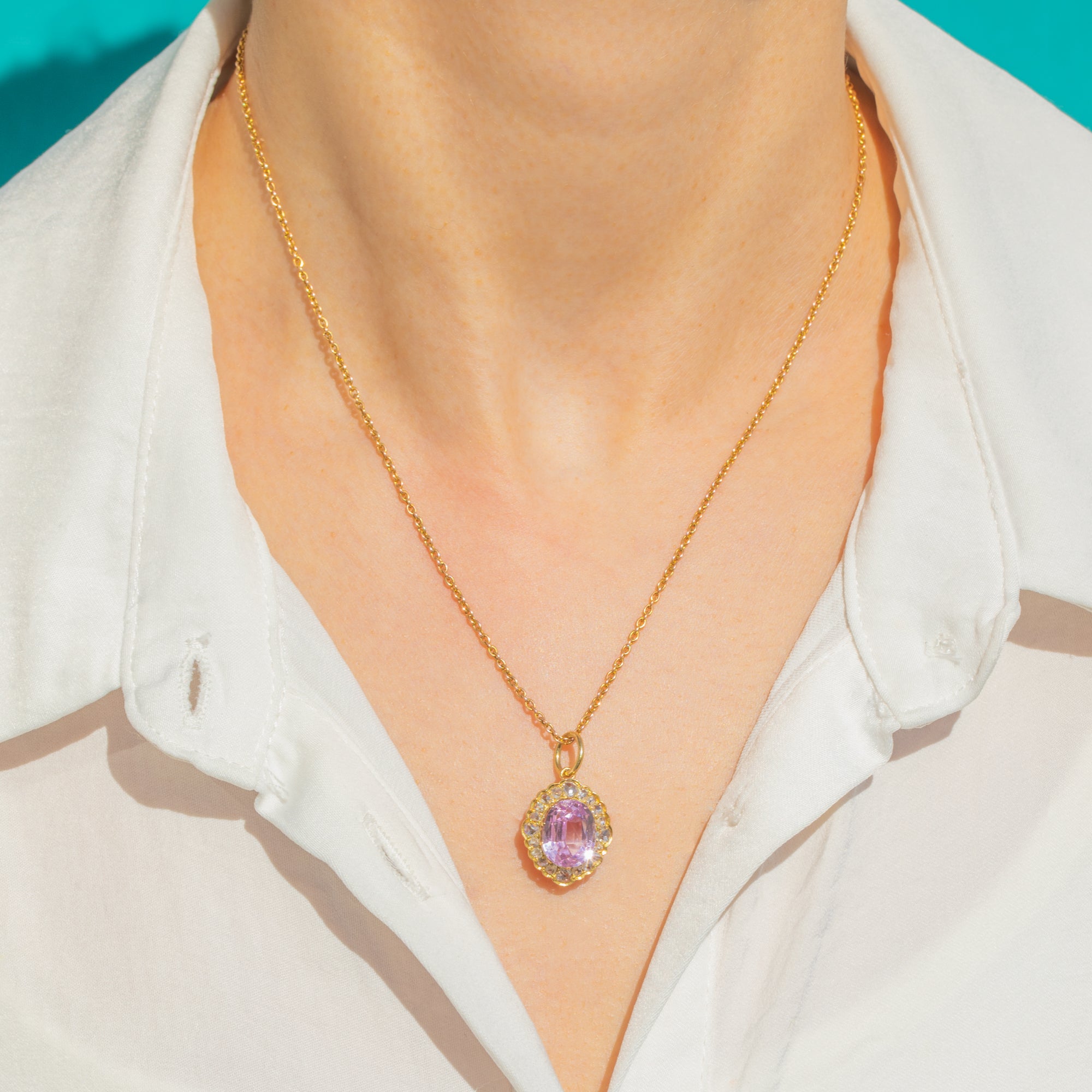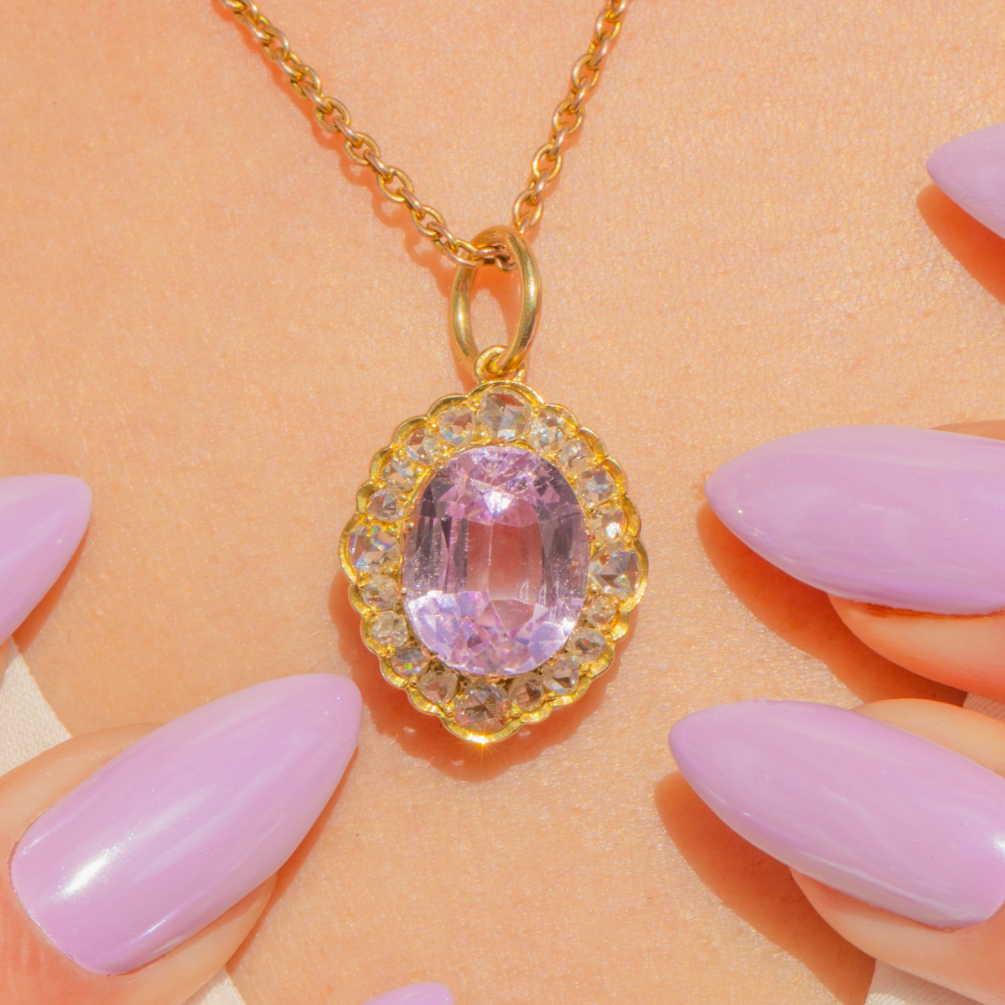A luminous 3.80ct Natural Kunzite in romantic pink-lilac takes centre stage, framed by a 0.40ct halo of twinkling rose-cut Diamonds in warm 15ct Gold. The scalloped cluster silhouette and delicate openwork feel speak to the refined elegance of the Late Victorian to Edwardian era, while the pastel glow of Kunzite brings a soft, ethereal allure. As with all Rose cuts, their irregular facet patterns make precise carat estimates challenging; the Diamond weight given is our best assessment while the stones remain mounted.
