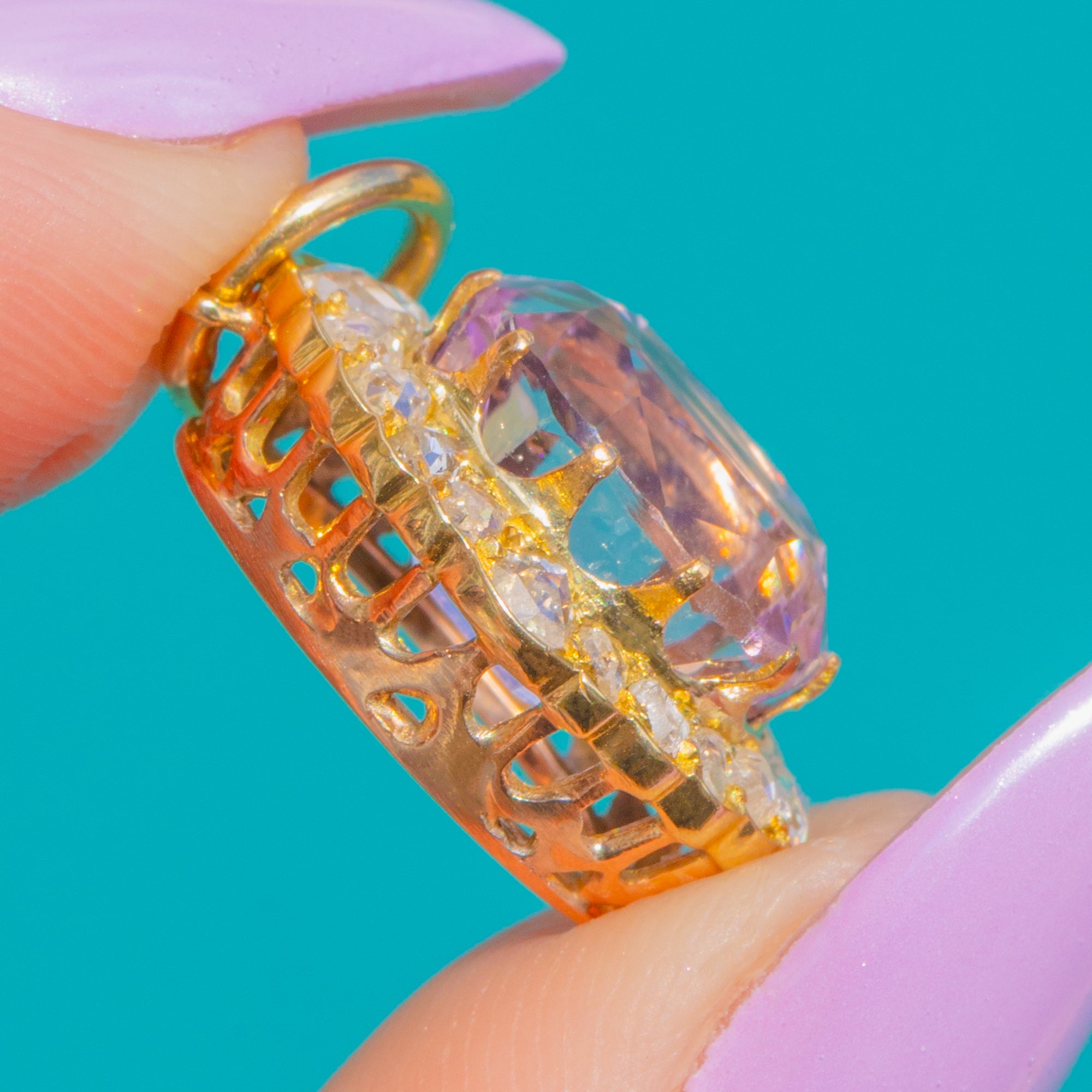 EXCELLENT: The Kunzite is bright and lively with no obvious chips or significant abrasions visible to the naked eye, and the Rose-cut Diamonds present beautifully. The 15ct Gold settings are clean and secure with minimal surface wear commensurate with age. No signs of later repairs observed.