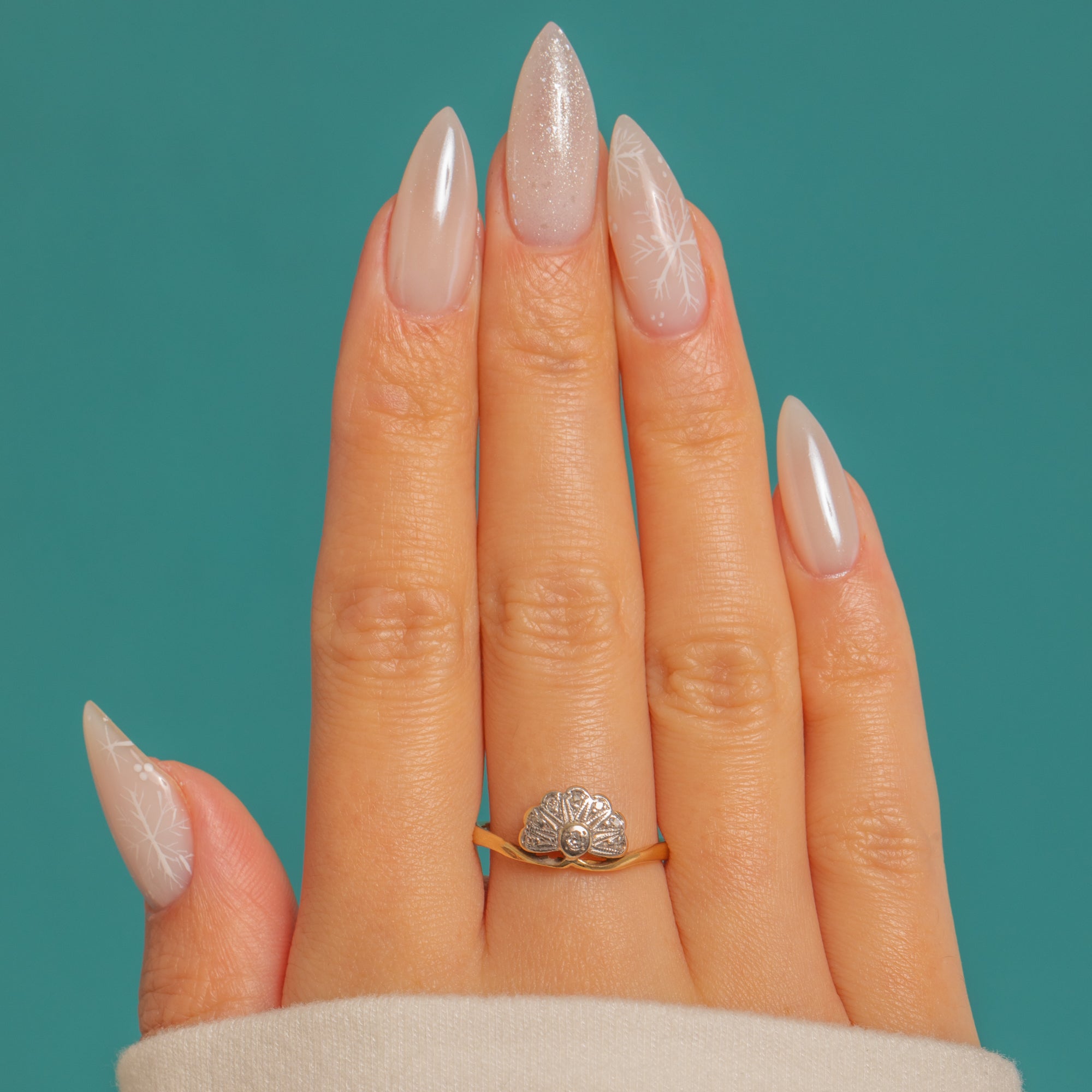 This delicate Art Deco treasure pairs a slender 18ct Gold shank with a Platinum-topped head. The scalloped fan motif is finely worked with milgrain and engraved radiating panels, centring on a small round Diamond and dotted with tiny round Diamond accents for a refined sparkle.