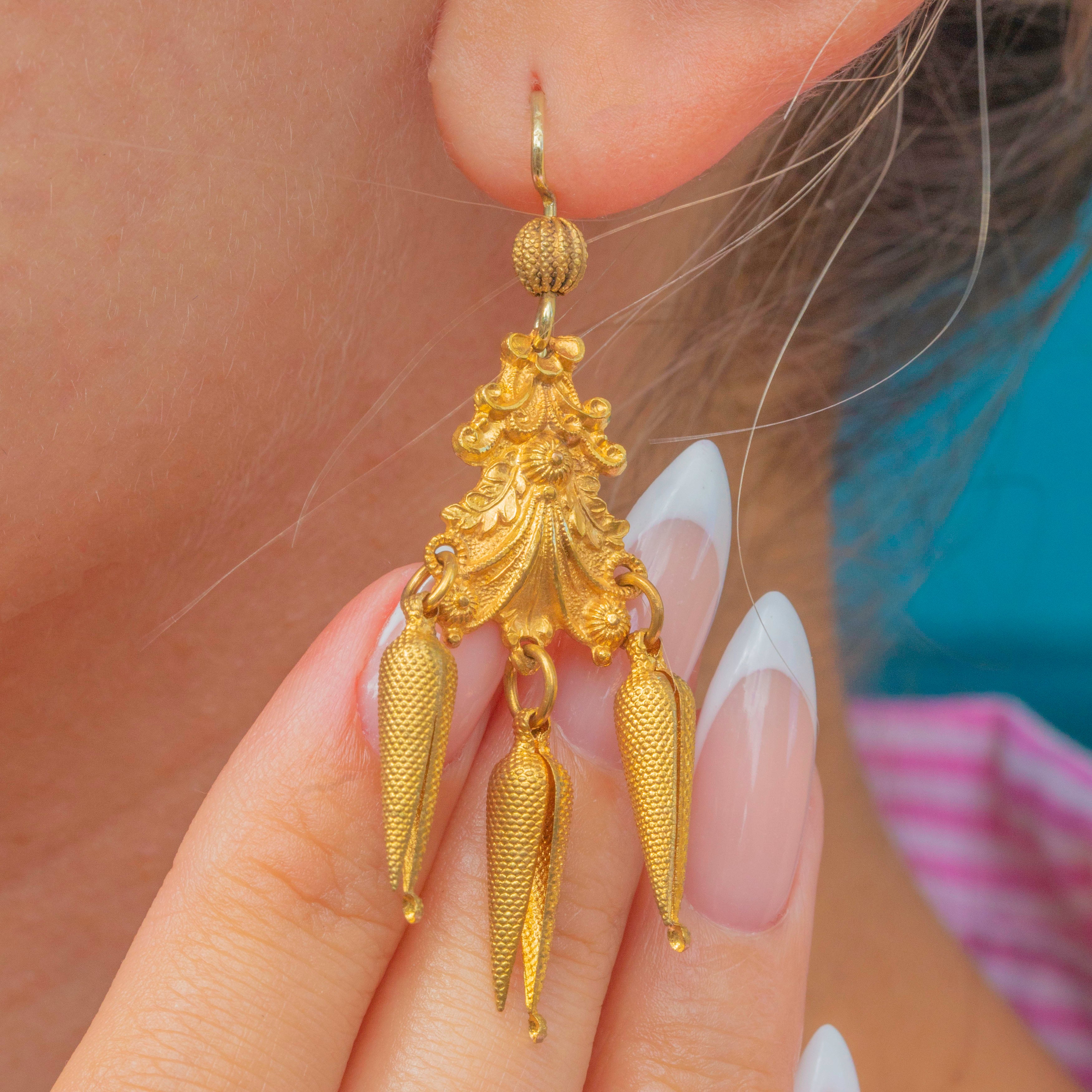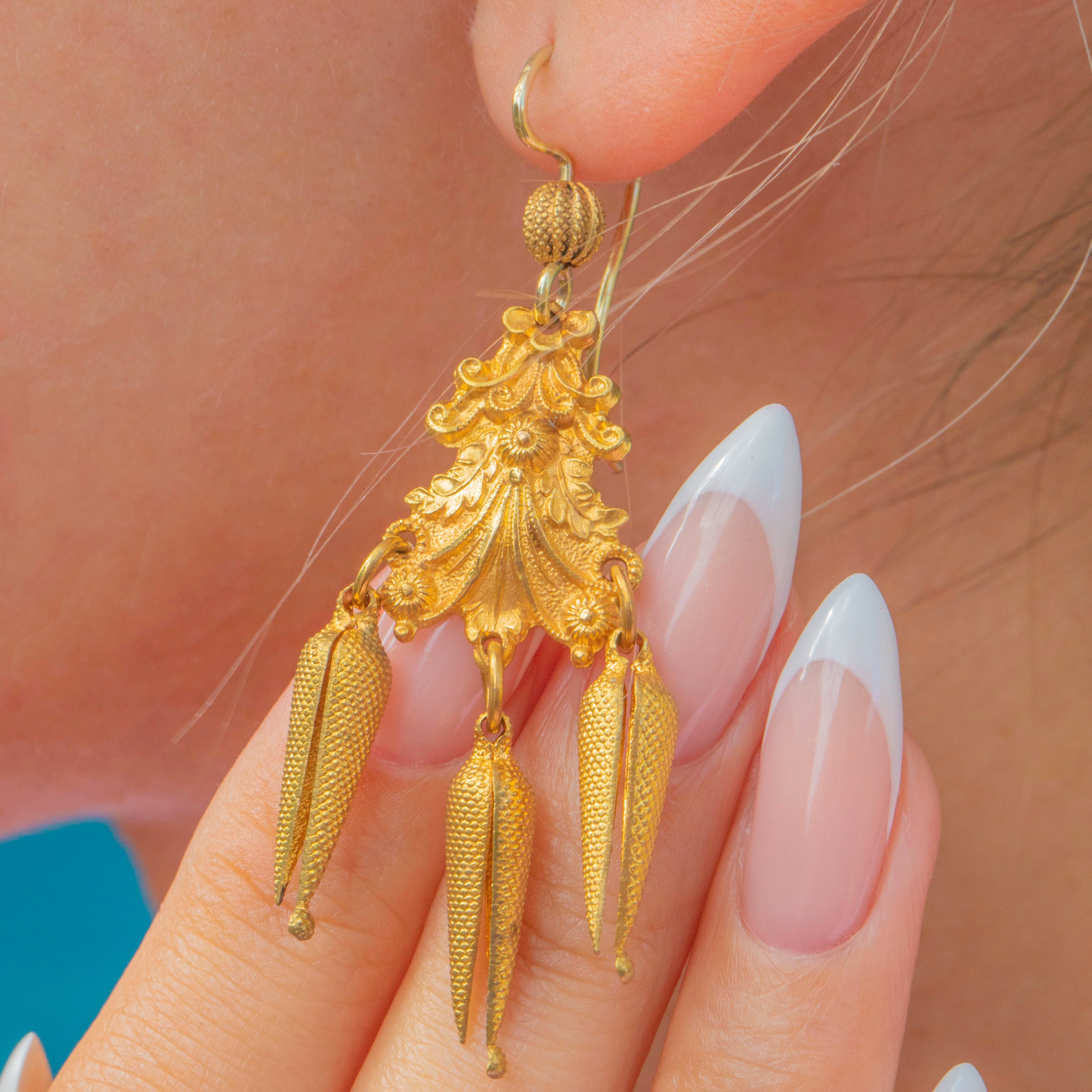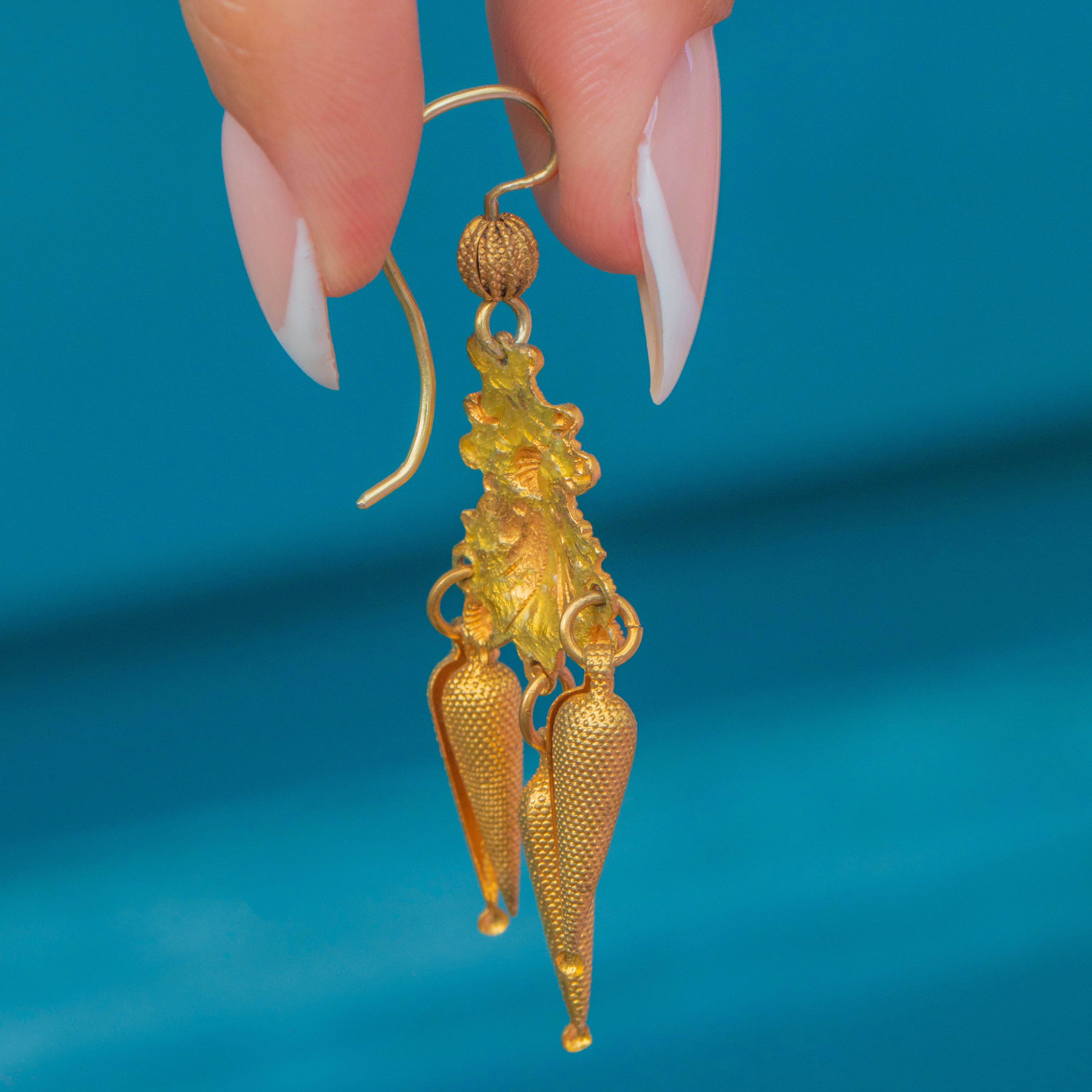 A rare and beautiful pair of early 19th-century Georgian Girandole earrings crafted in Pinchbeck. These earrings feature ornate foliate tops with three articulated drops, all finely textured and beautifully detailed. Their warm golden hue is bright and lustrous, a testament to the enduring quality of Pinchbeck jewellery of the era.