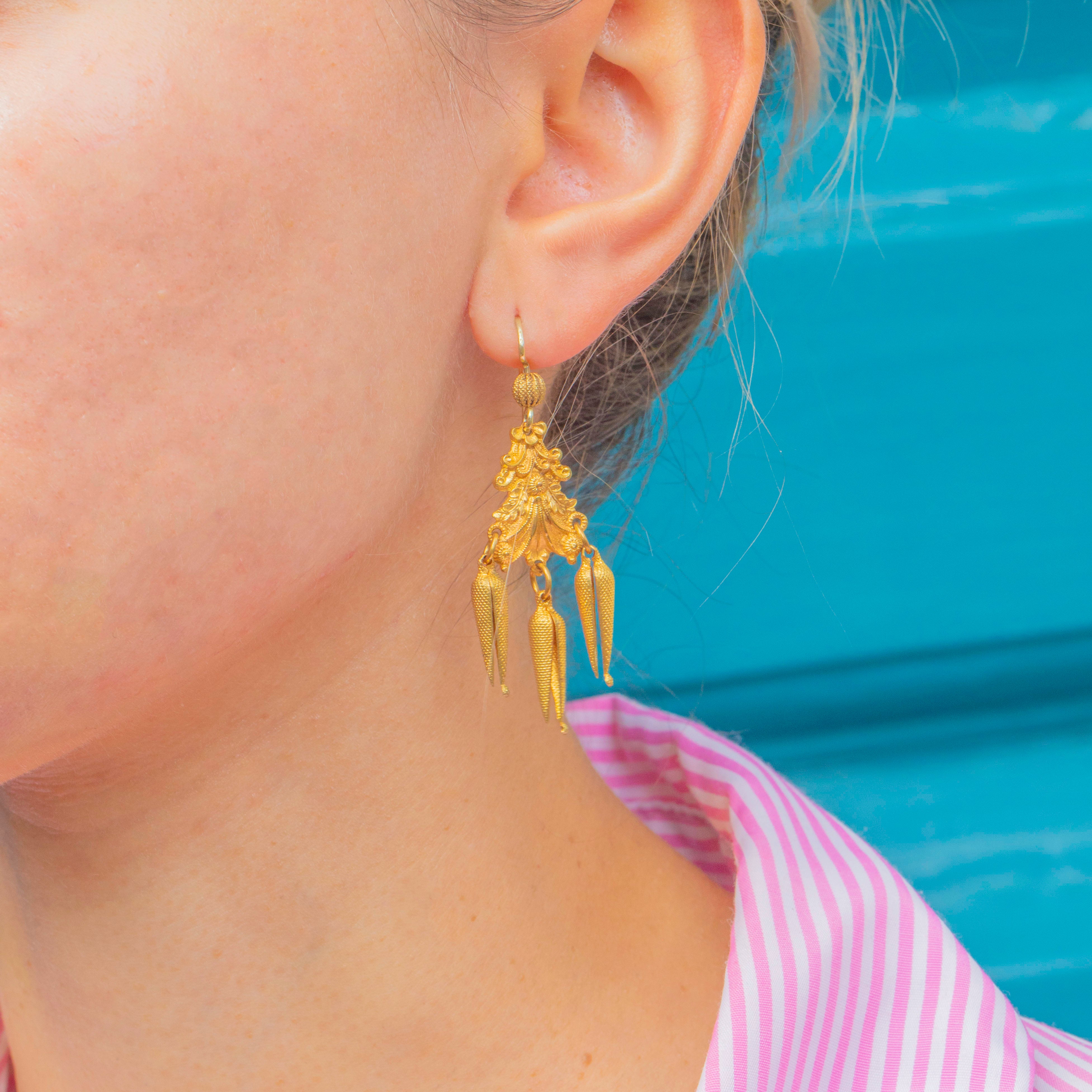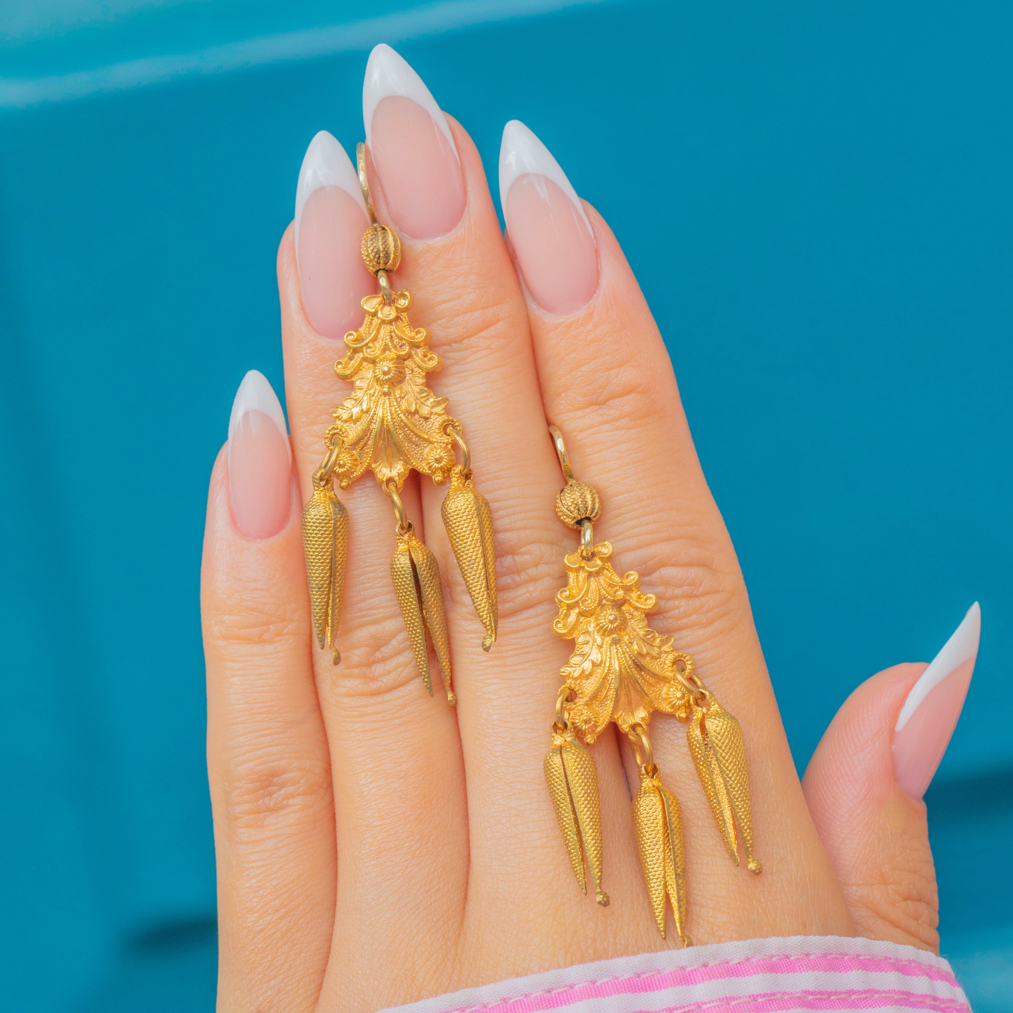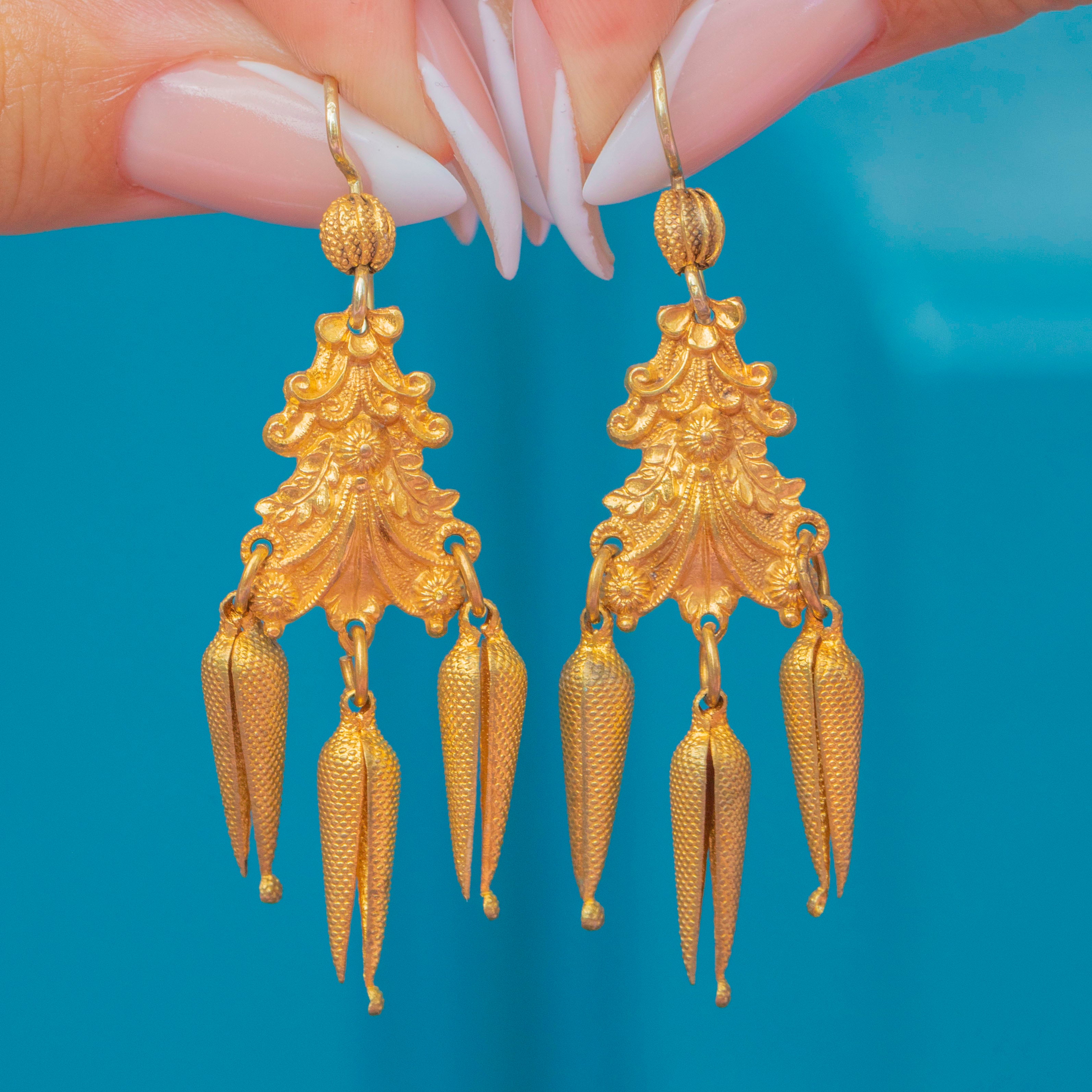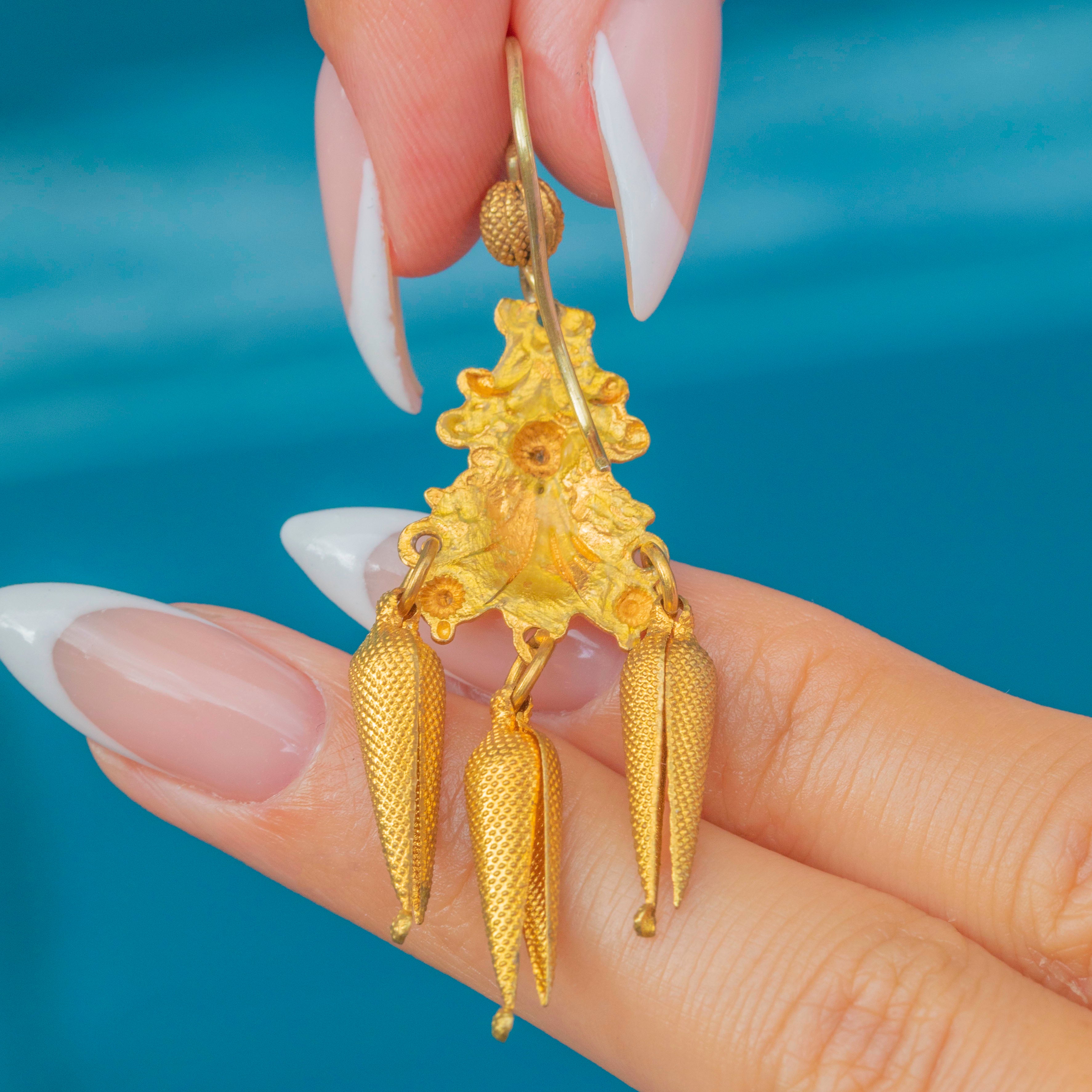 A rare and beautiful pair of early 19th-century Georgian Girandole earrings crafted in Pinchbeck. These earrings feature ornate foliate tops with three articulated drops, all finely textured and beautifully detailed. Their warm golden hue is bright and lustrous, a testament to the enduring quality of Pinchbeck jewellery of the era.