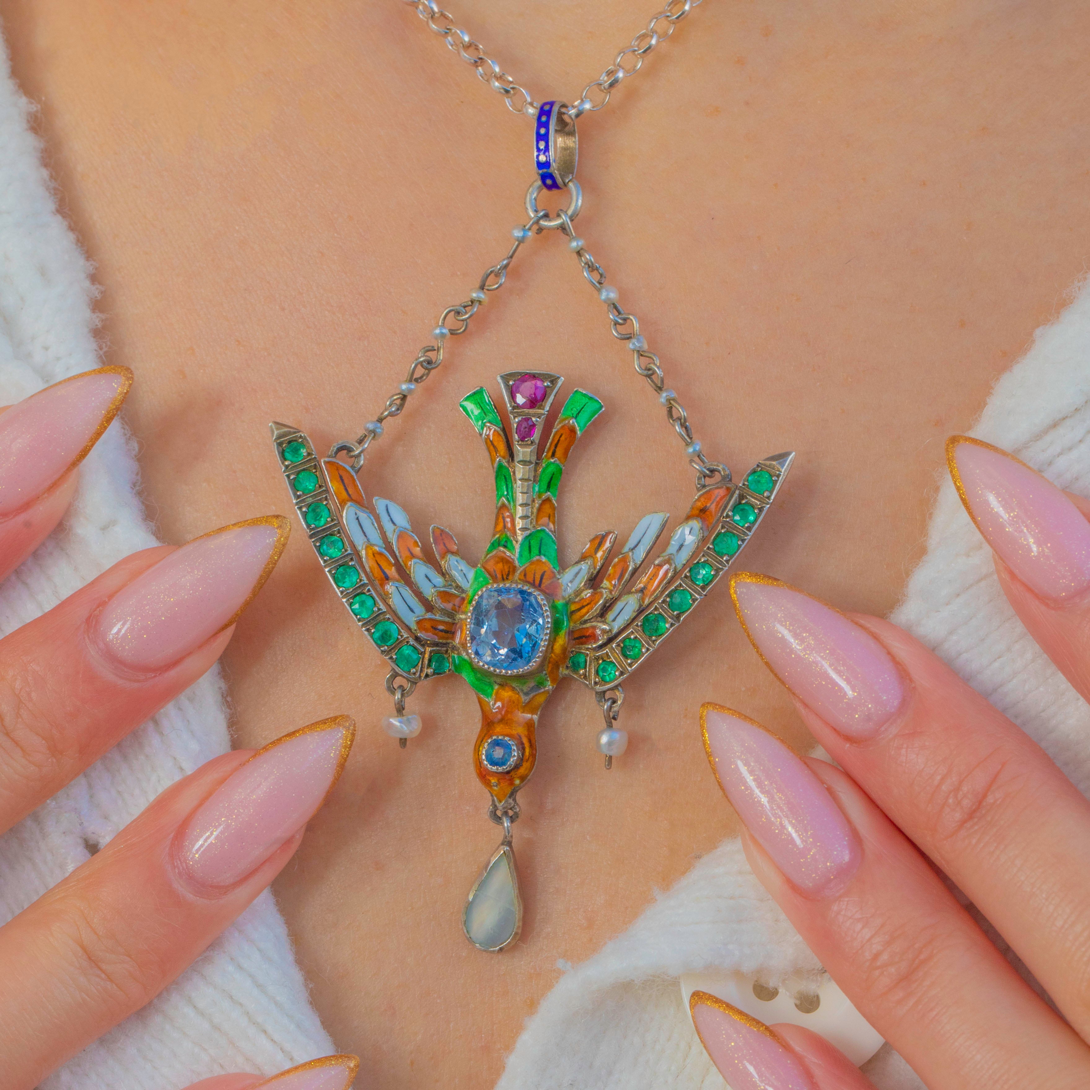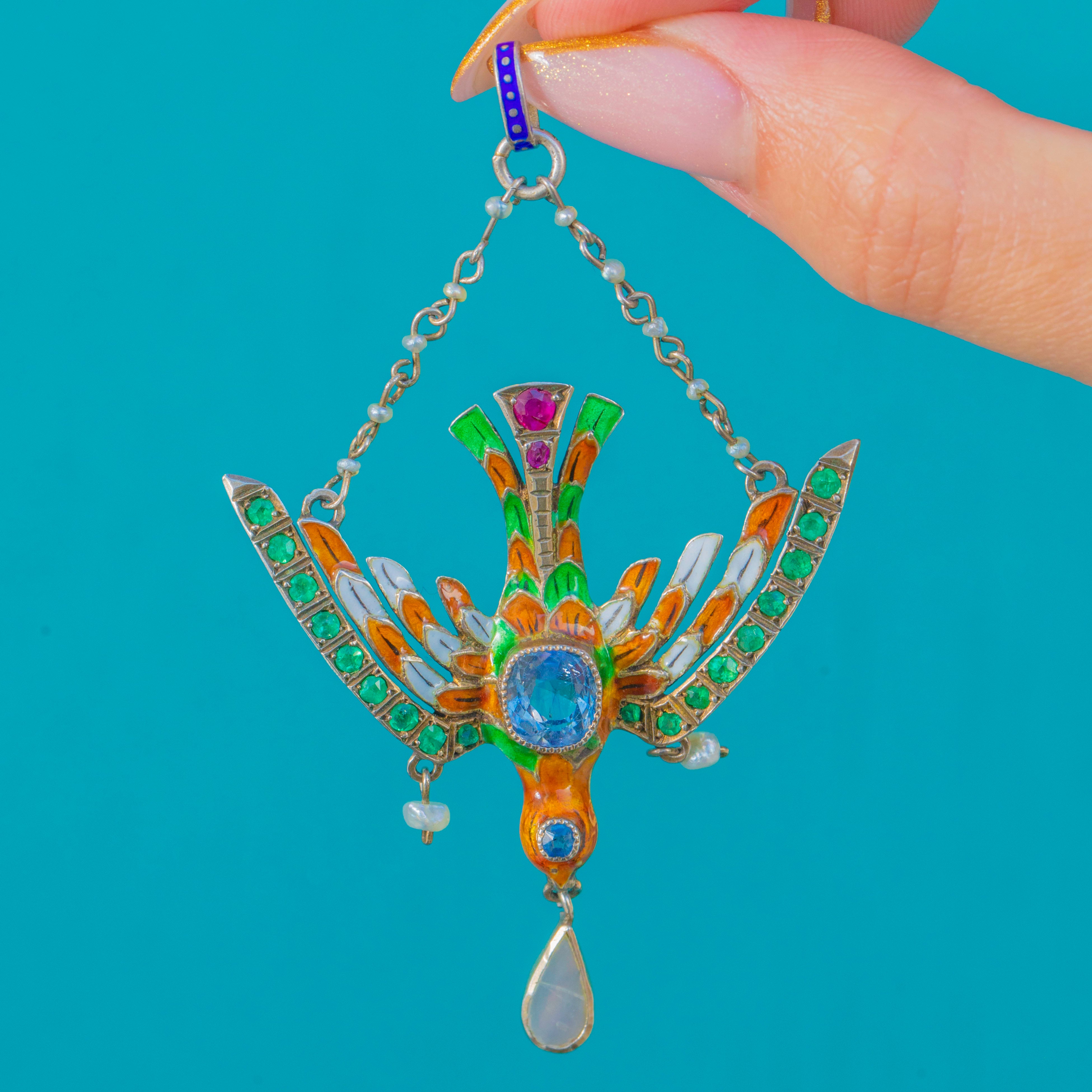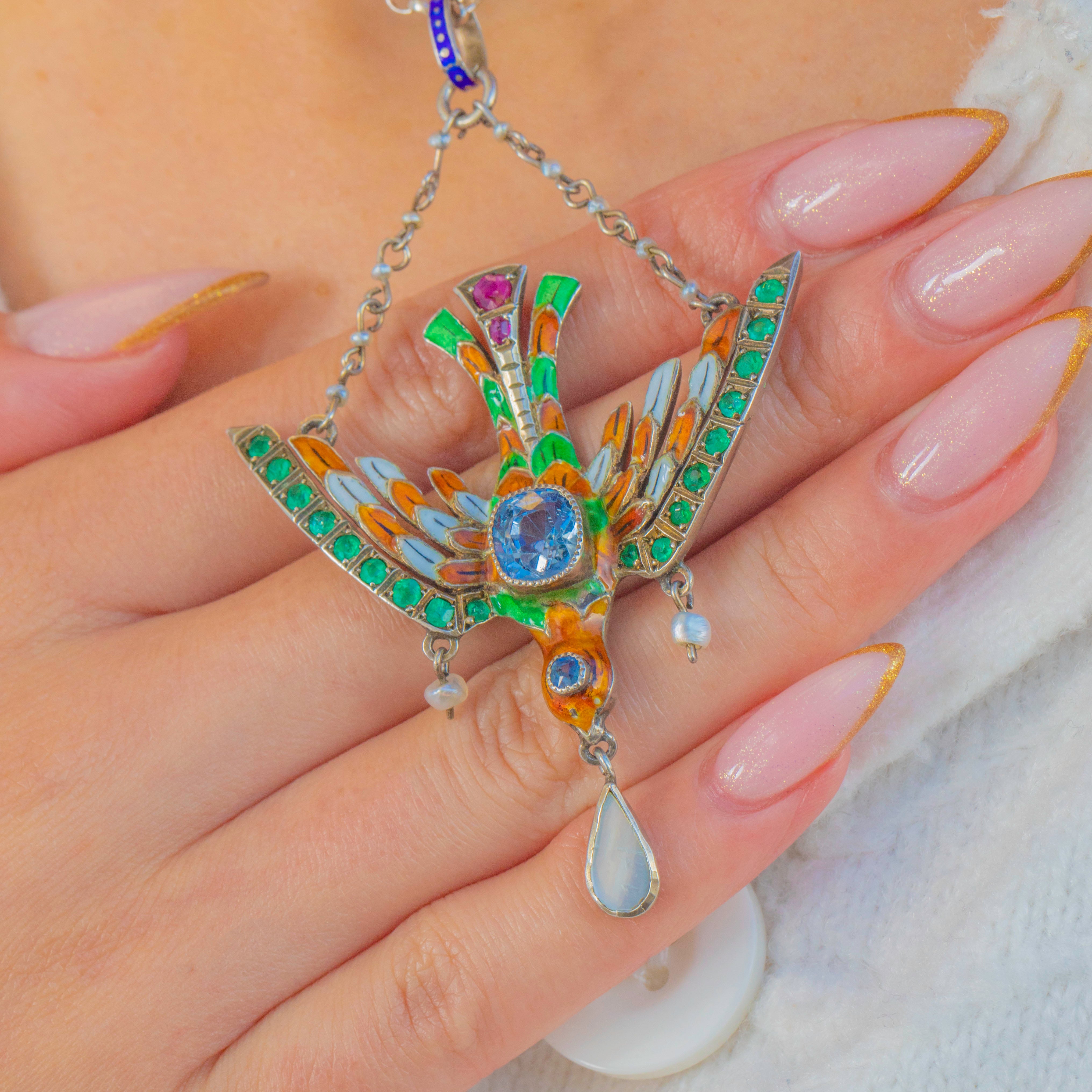 The colour palette is exquisite: white, green and orange Enamel, a playful blue-and-white polka-dot Enamel bale, sparkling natural Sapphires and Rubies, and soft, lustrous natural Pearls. A Mother-of-Pearl teardrop suspends from a delicate Pearl chain, finishing the piece with a romantic, devotional flourish. Spectacular, deeply symbolic and highly collectable, this pendant would be the star of any antique jewellery collection.