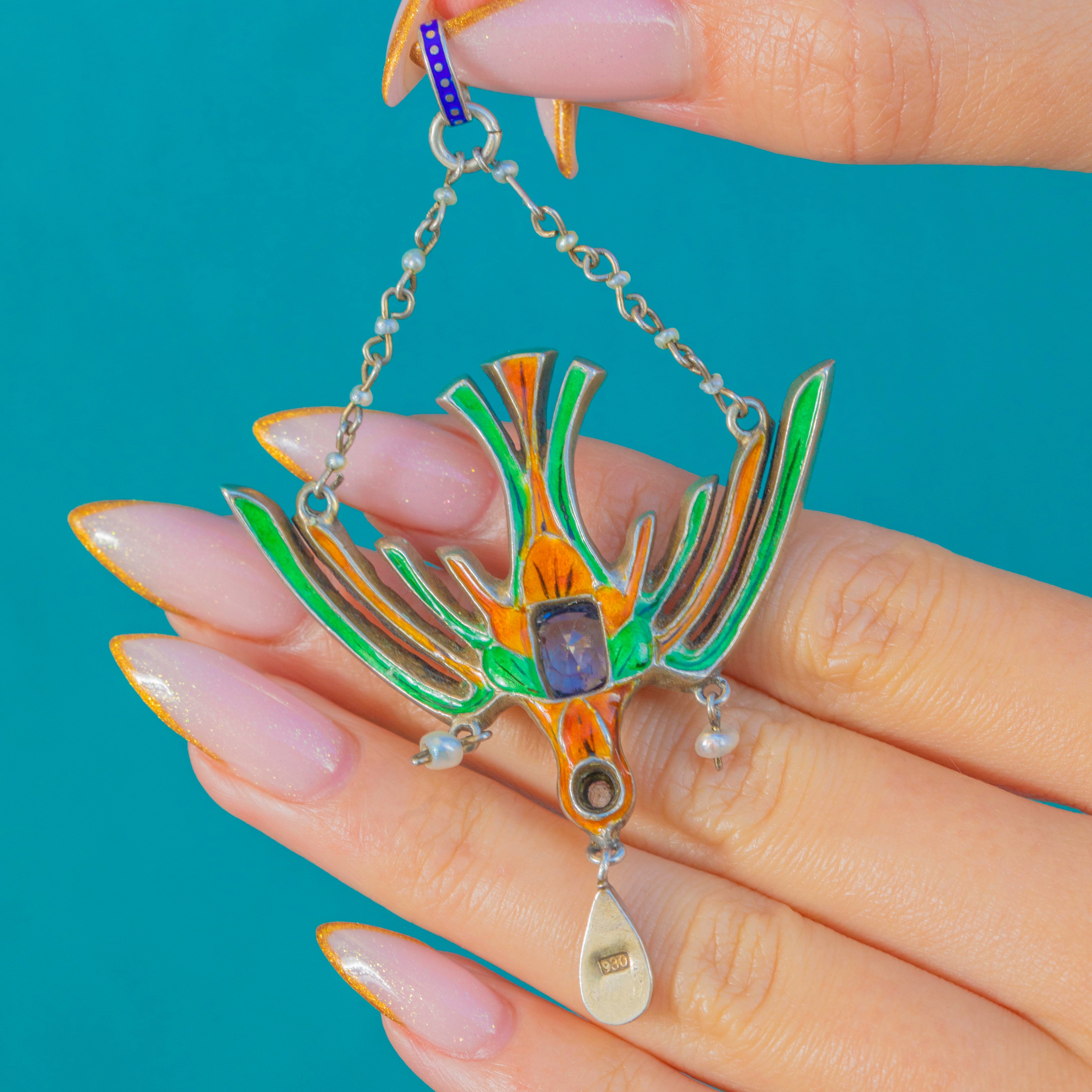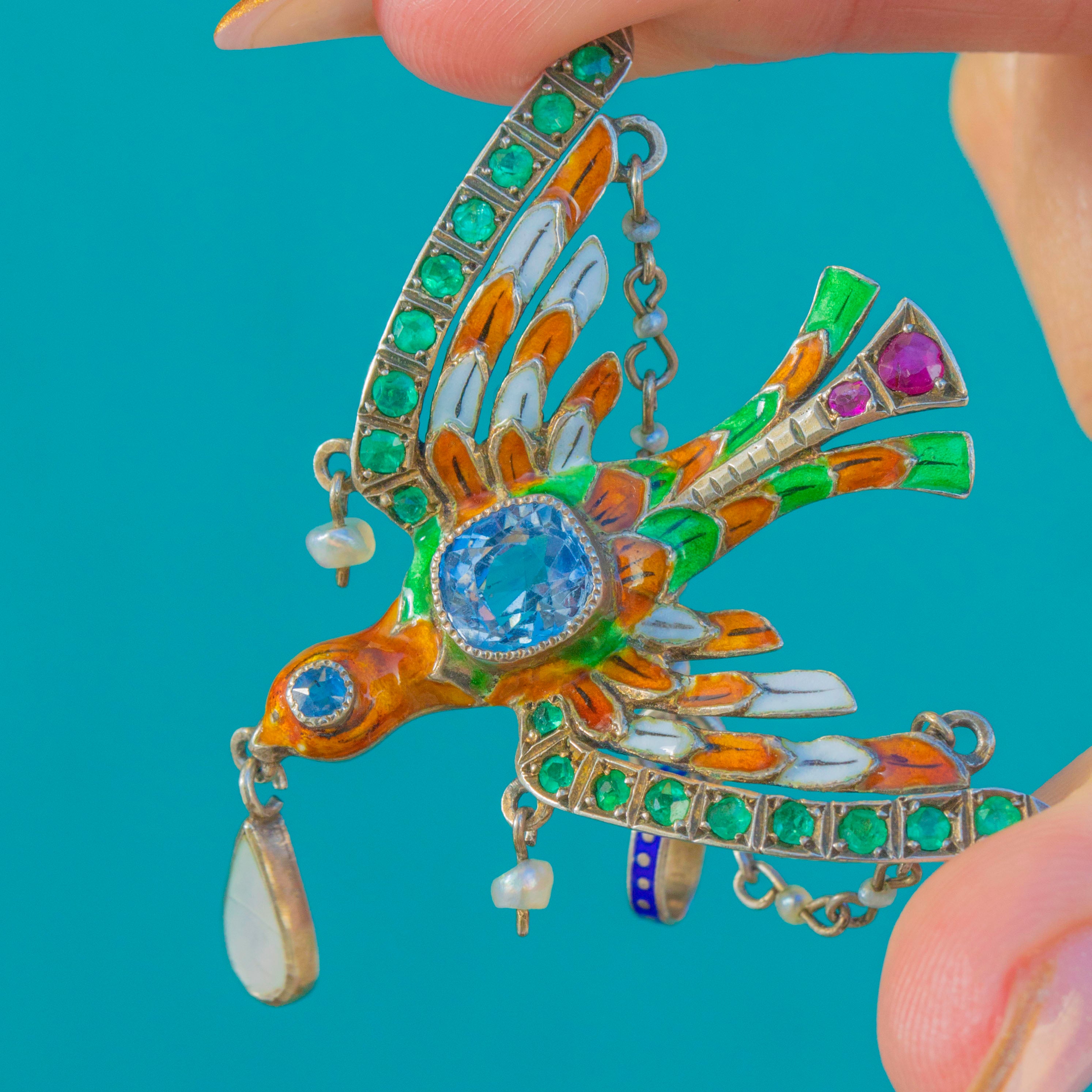 EXCELLENT: The Sapphires, Emeralds, Rubies and Pearls are all well-set with bright colour and only natural inclusions visible under magnification, including characteristic inclusions to the Rubies. The Enamel is crisp and vibrant with minimal surface wear. There is a visible split across the Mother-of-Pearl drop, but it remains securely set and stable. The Gilded Sterling Silver framework and chains are strong, with only gentle antique patina.