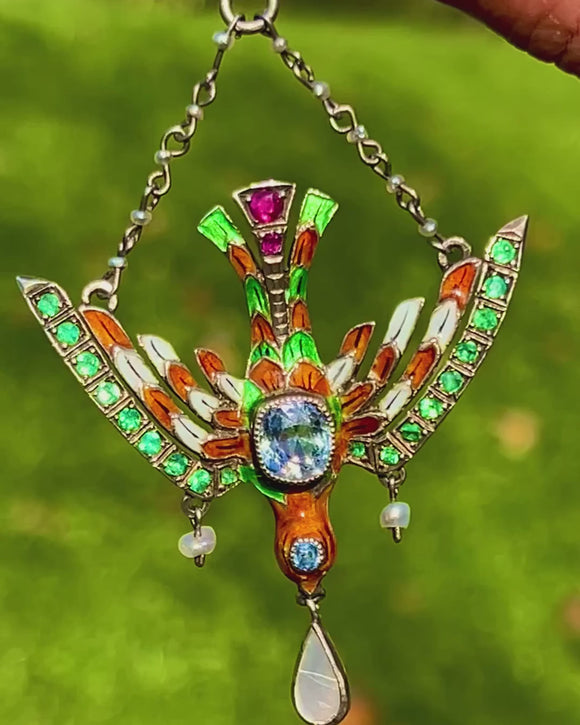 This rare Antique St Esprit pendant is an extraordinary survivor of the Victorian / Austro-Hungarian era, richly detailed in Gilded Sterling Silver, glowing Enamel and vibrant gemstones. The Holy Spirit dove is beautifully rendered in crisp white Enamel with a halo of vivid green Emeralds, red Ruby tail feathers and a glorious old cushion-cut Sapphire at its heart.
