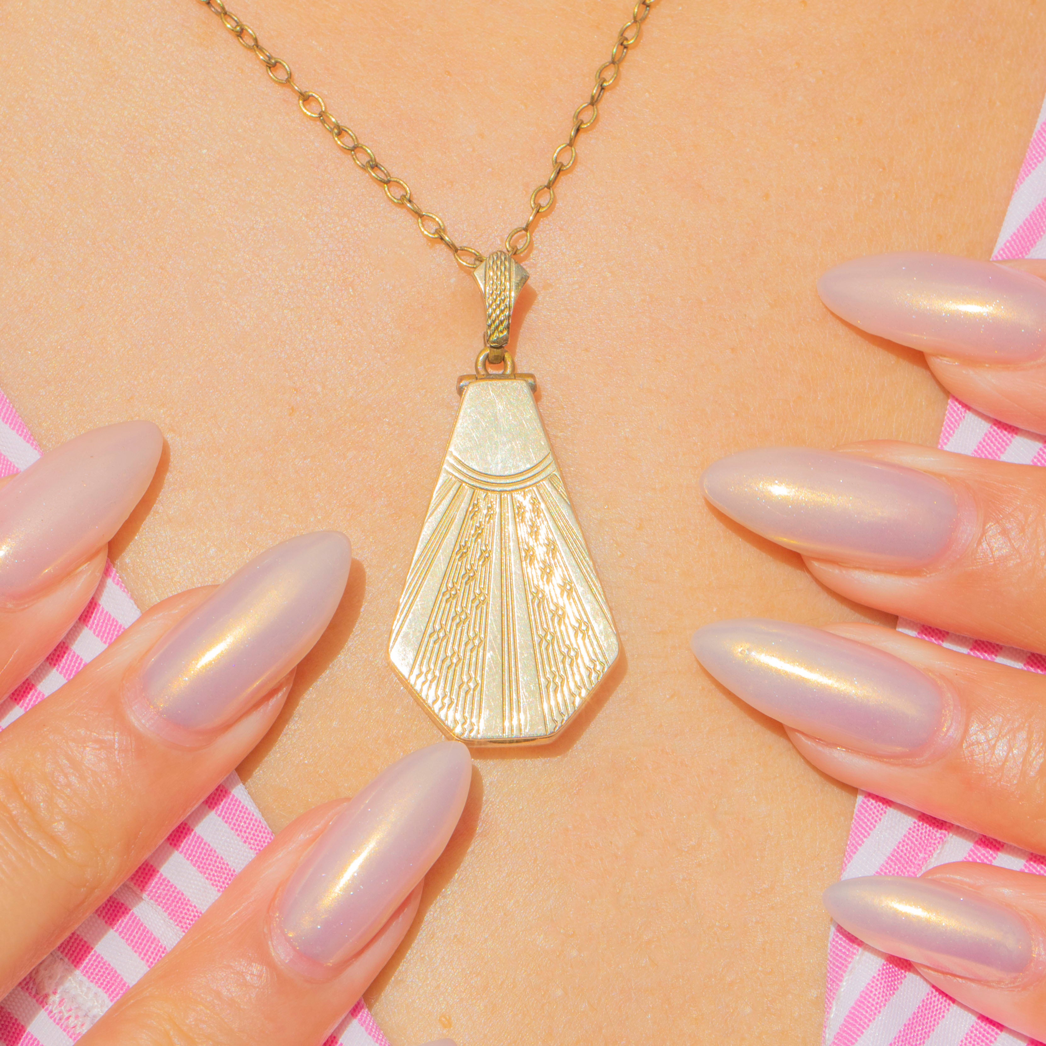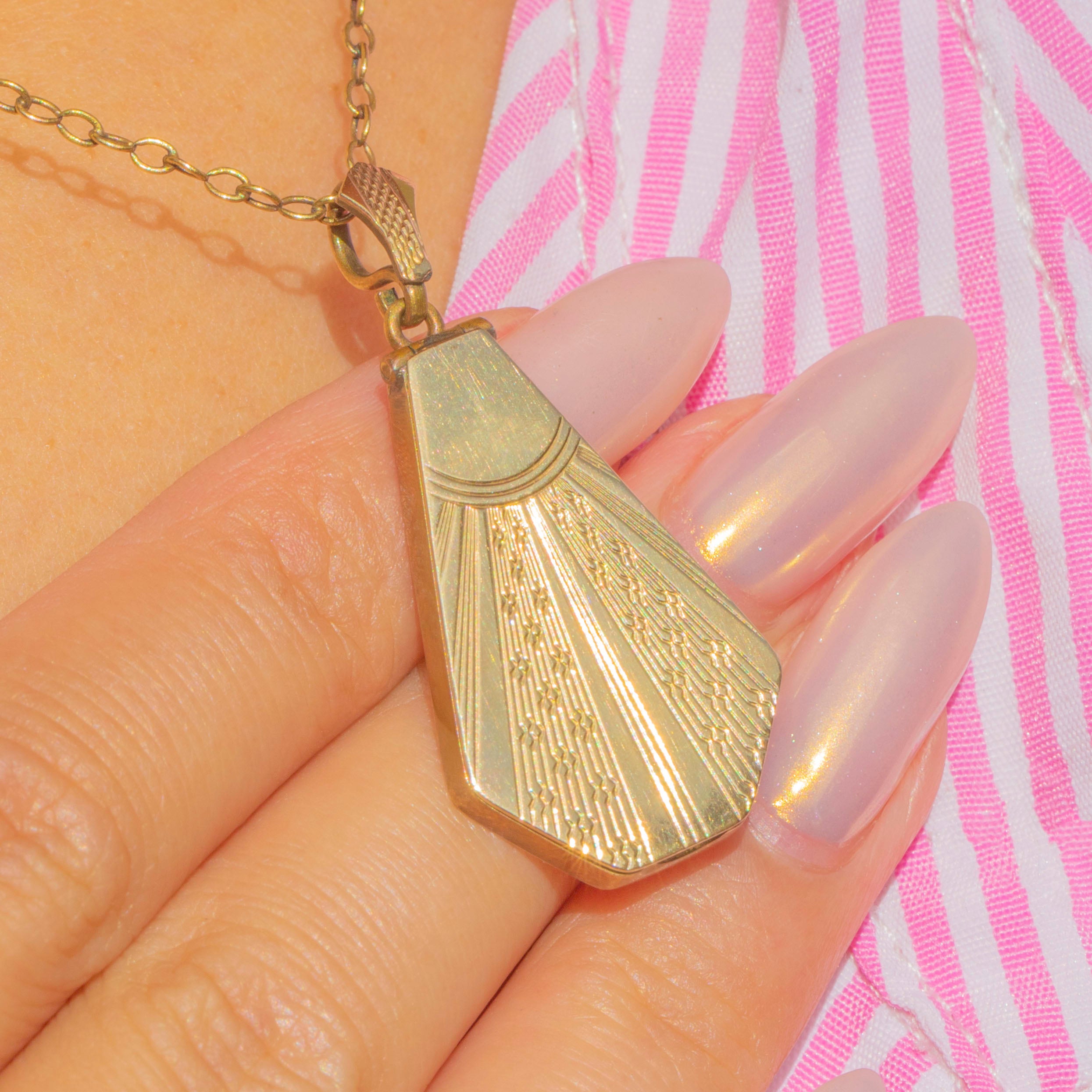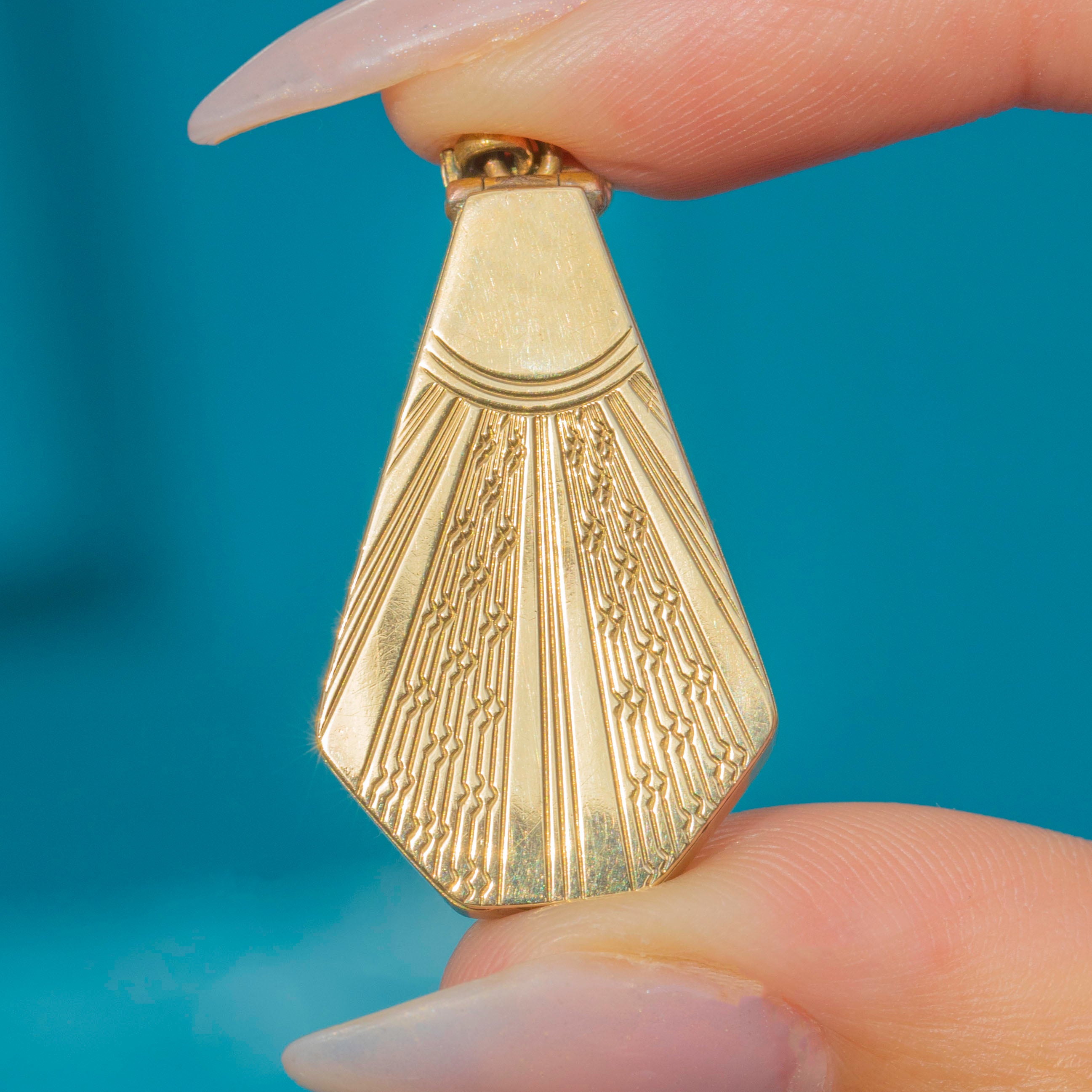 A rare Art Deco fan-shaped locket, c.1920, decorated with striking stylised sun-ray engravings. Its highly polished front glitters with light, perfectly embodying the glamour and bold geometry of the Jazz Age.