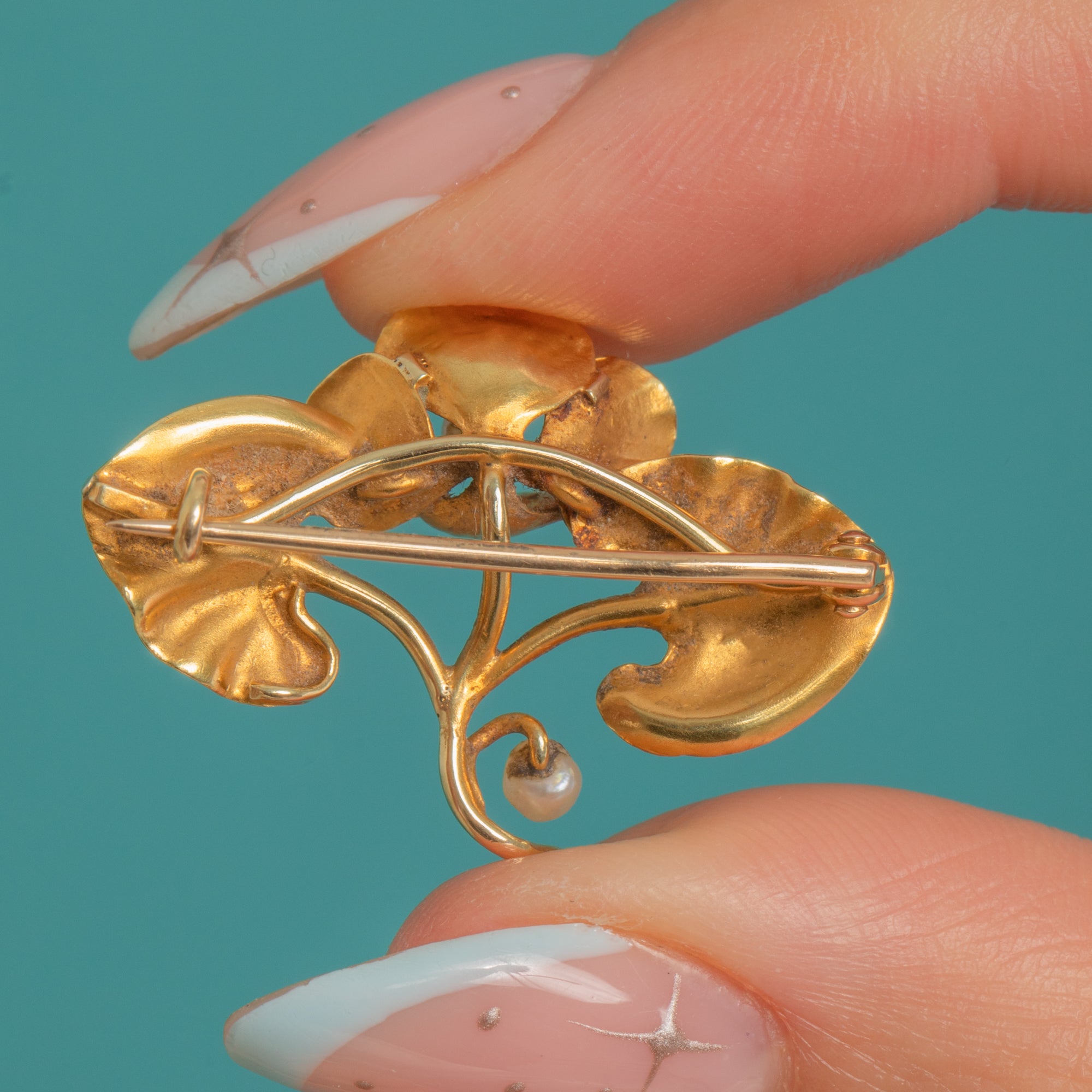 VERY GOOD: The Enamel is bright and lustrous with only slight wear on one leaf and minor high-point rubs, not detracting from the beauty of the piece. Pearls are securely set with no obvious damage, and the Gold metalwork shows a gentle, even patina. The pin is straight and the hinge and C-catch function well.