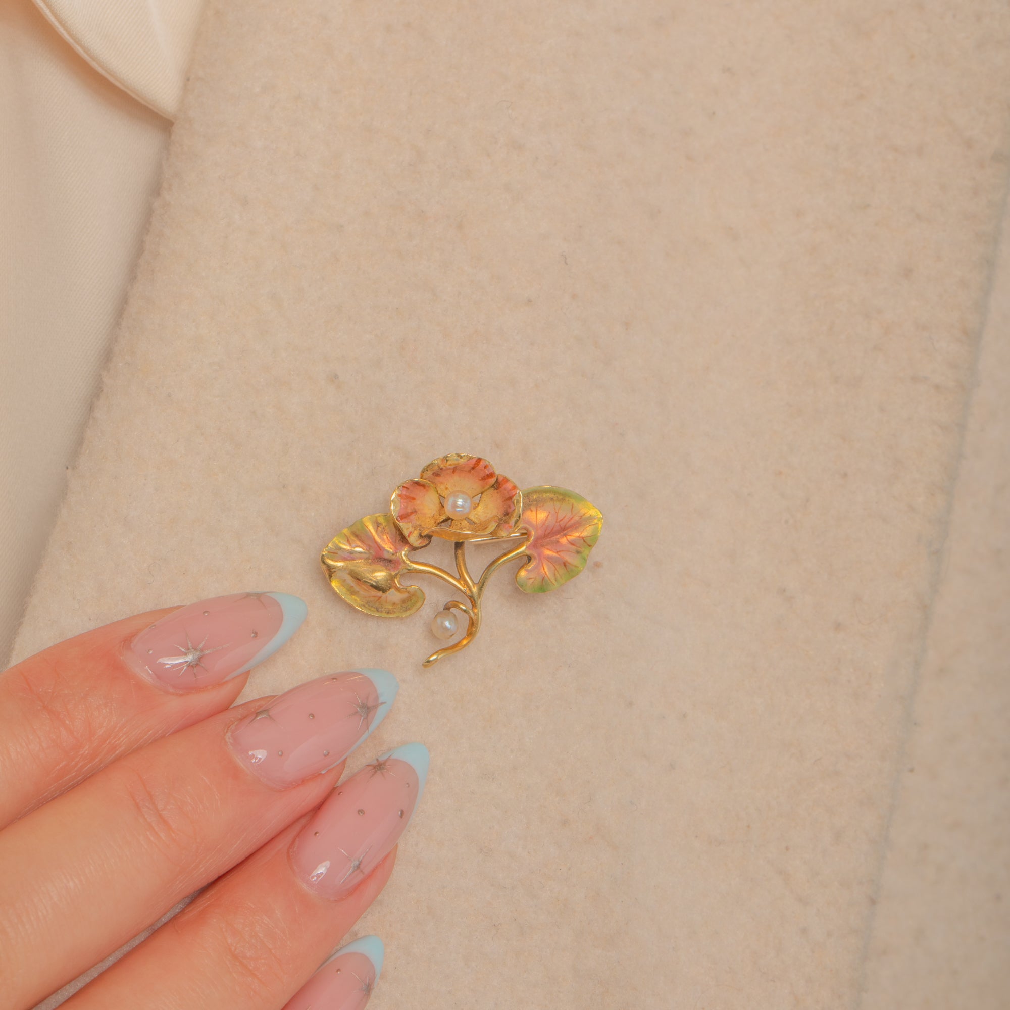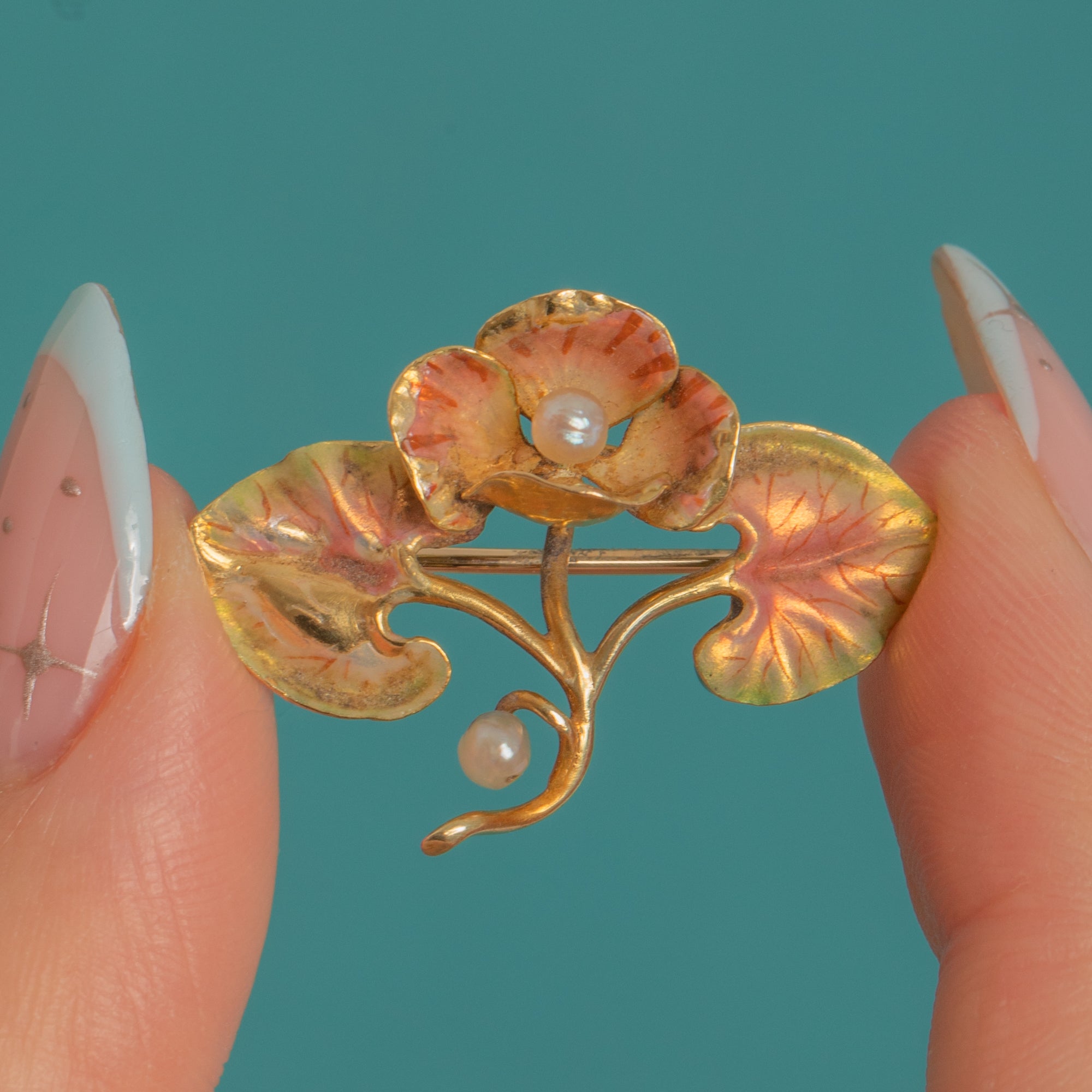 Petite yet enchanting, this Art Nouveau flower brooch blossoms in iridescent Enamel, its colours shading from peach and coral through sunlit yellow to fresh green. A naturalistic ruffled bloom is flanked by two softly veined leaves, all framed by a graceful whiplash stem that captures the movement and poetry of the period.