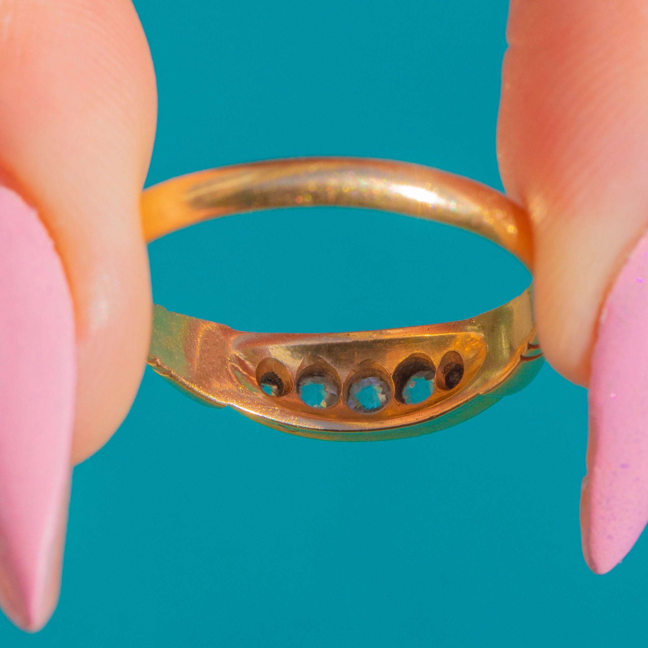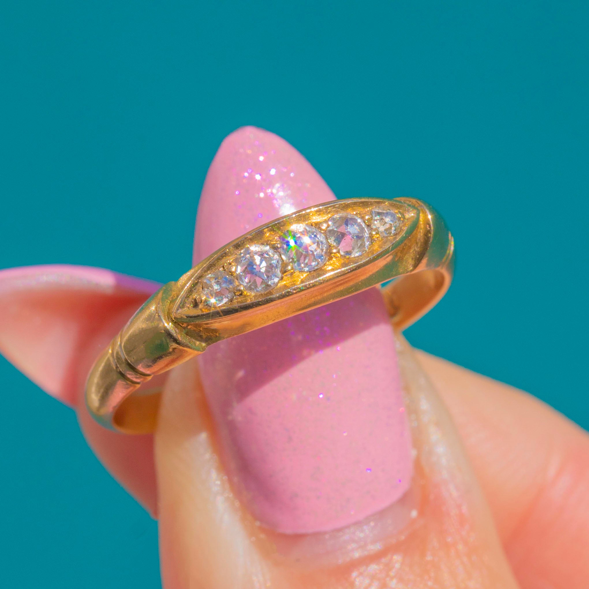 A charming Victorian five-stone “boat” ring, rendered in rich 18ct Gold and set with old mine-cut Diamonds that shimmer in a refined, linear row. Hallmarked at Chester 1897, this elegant navette plaque design captures the quiet romance of the era in a sleek, low-profile silhouette perfect for everyday wear.