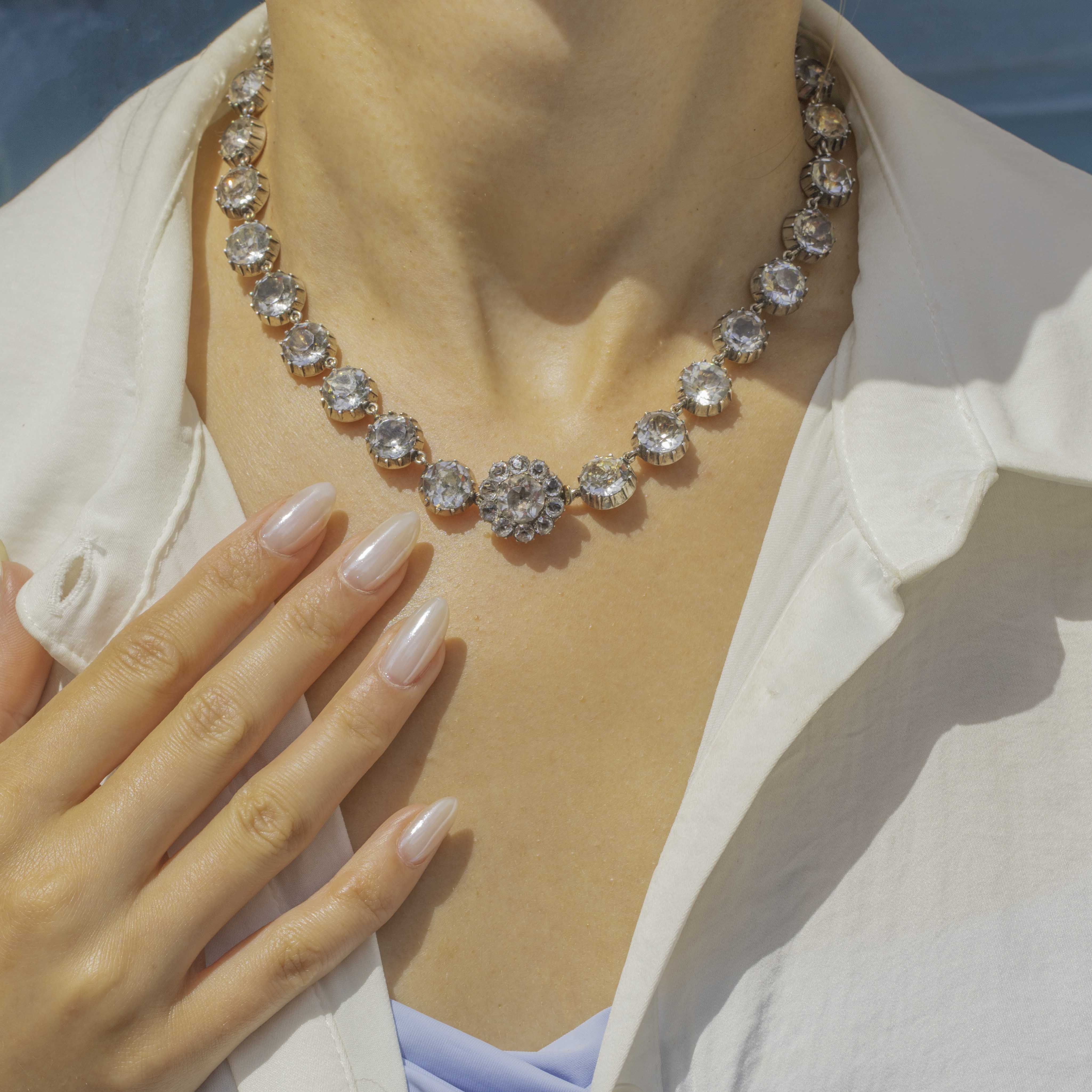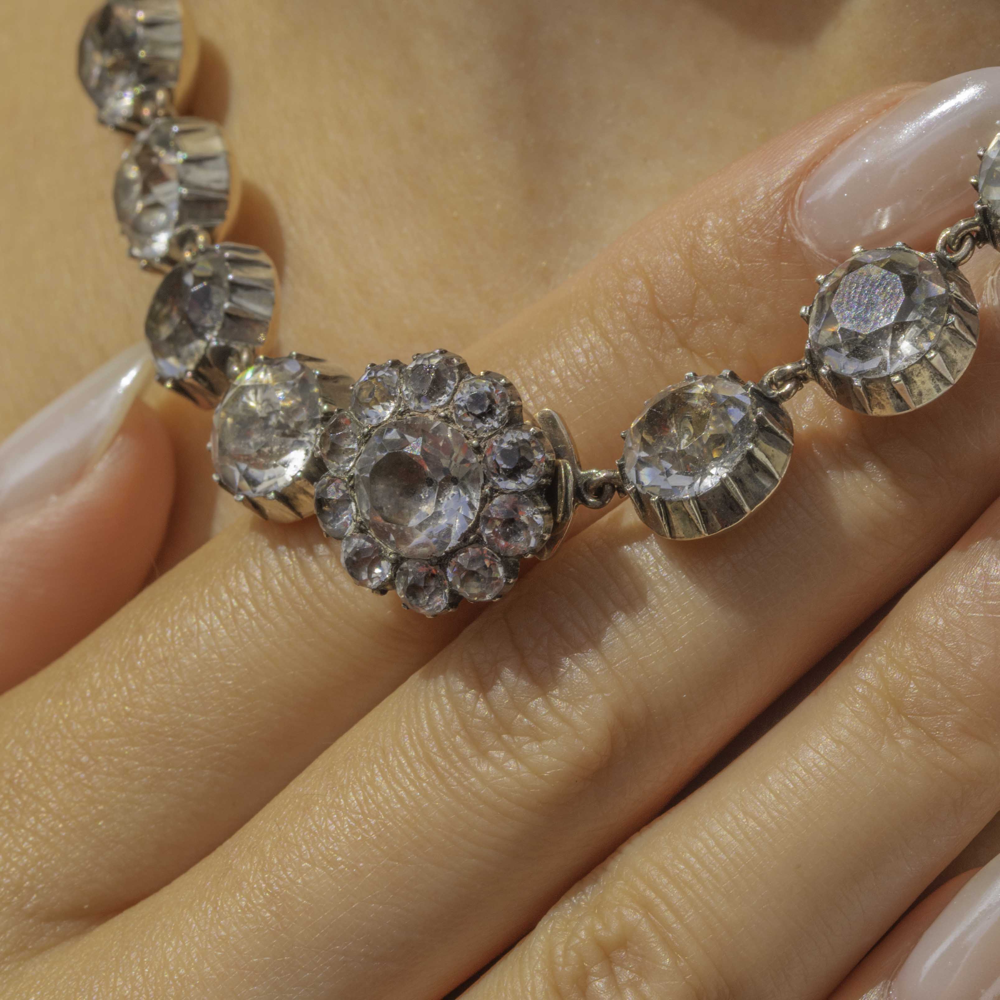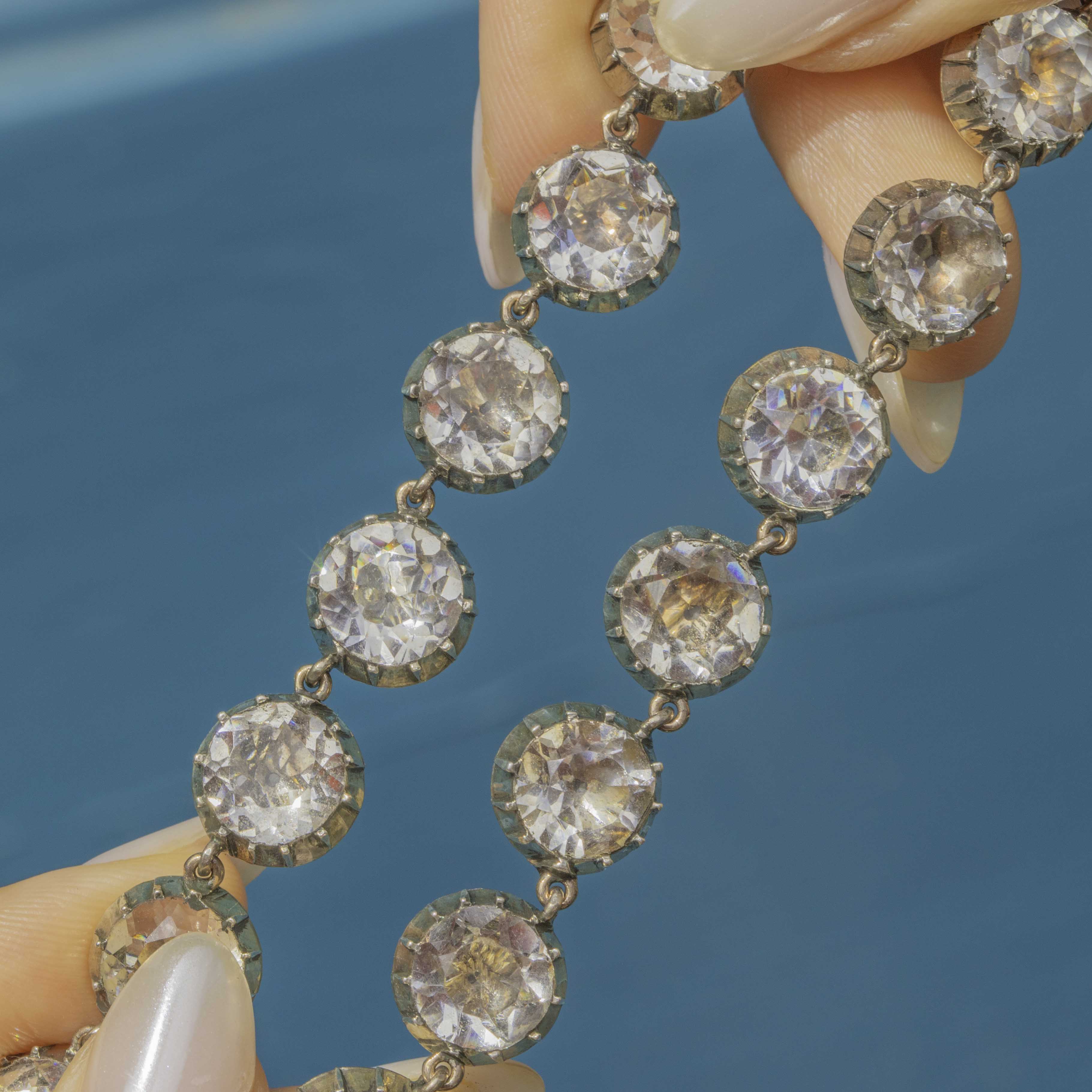 VERY GOOD-EXCELLENT. Each of the Paste gemstones is secure in its traditional piecrust setting, complete with 9ct Gold domed backs for comfortable wear. There is some slight variation in colour to the foils behind a few of the Paste gemstones and a few surface marks on some of the facets, but this is only noticeable under close inspection. The Silver has a lovely lustre, and her piecrust settings have accrued an admirable patina for a dramatic finish, enhancing the sparkle of the gemstones! The tongue clasp is in perfect working order, allowing you to wear her confidently, whatever the occasion. Over 200 years old, we can't quite believe the incredible condition this Georgian necklace is in, a rare find for sure!