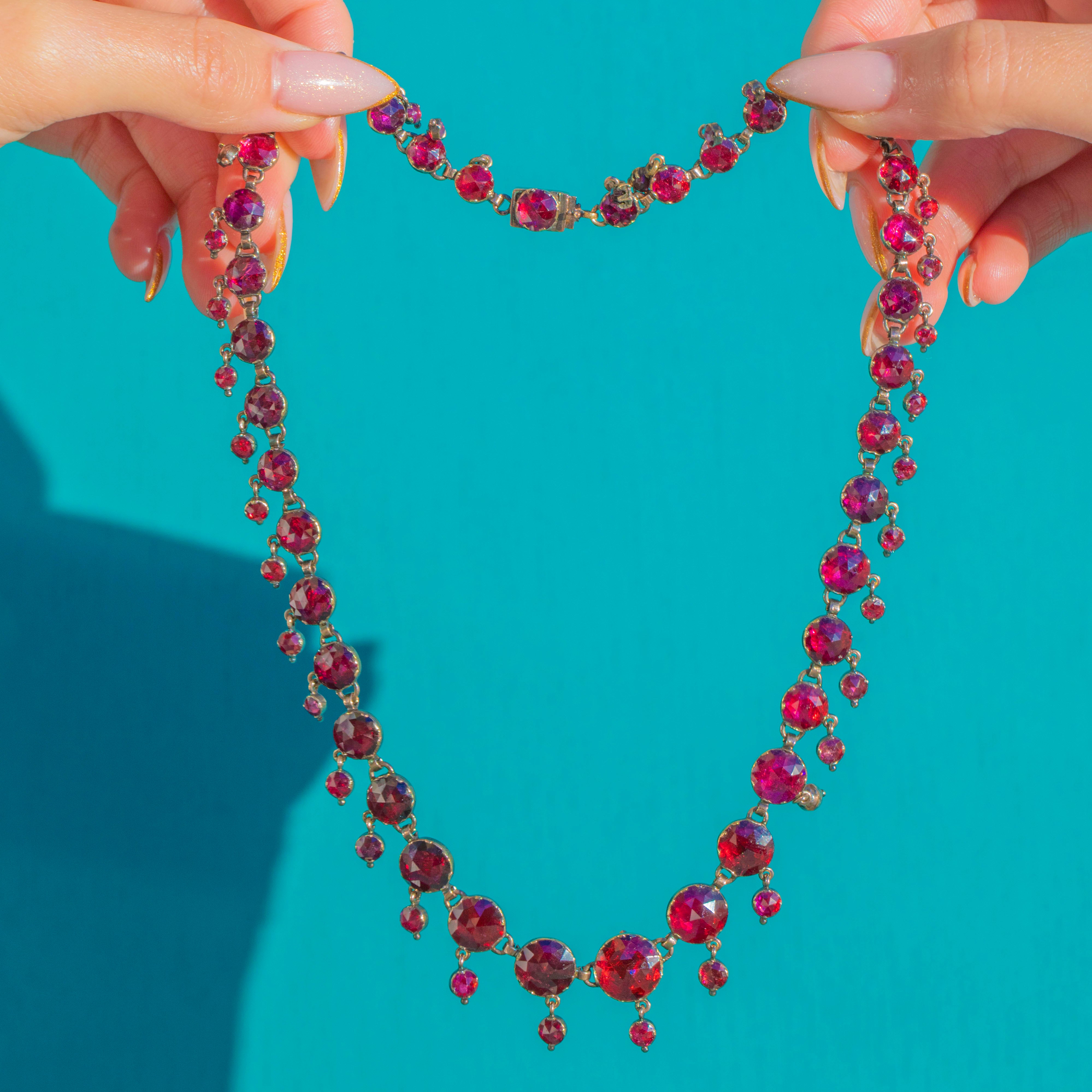 This exquisite French necklace from c.1850 is set with glowing Perpignan Garnets—rare, unmistakable and cherished for their vivid “raspberry cordial” hue. These Garnets were traditionally hand-cut and foil-backed in Perpignan, a city in southern France near the Spanish border. Their colour and light are unlike any other Garnet type: bright, juicy and almost holographic, with deep berry tones that flash as you move. Today, authentic antique Perpignan Garnets are highly sought after, as production was local, small-scale, and ceased over a century ago.