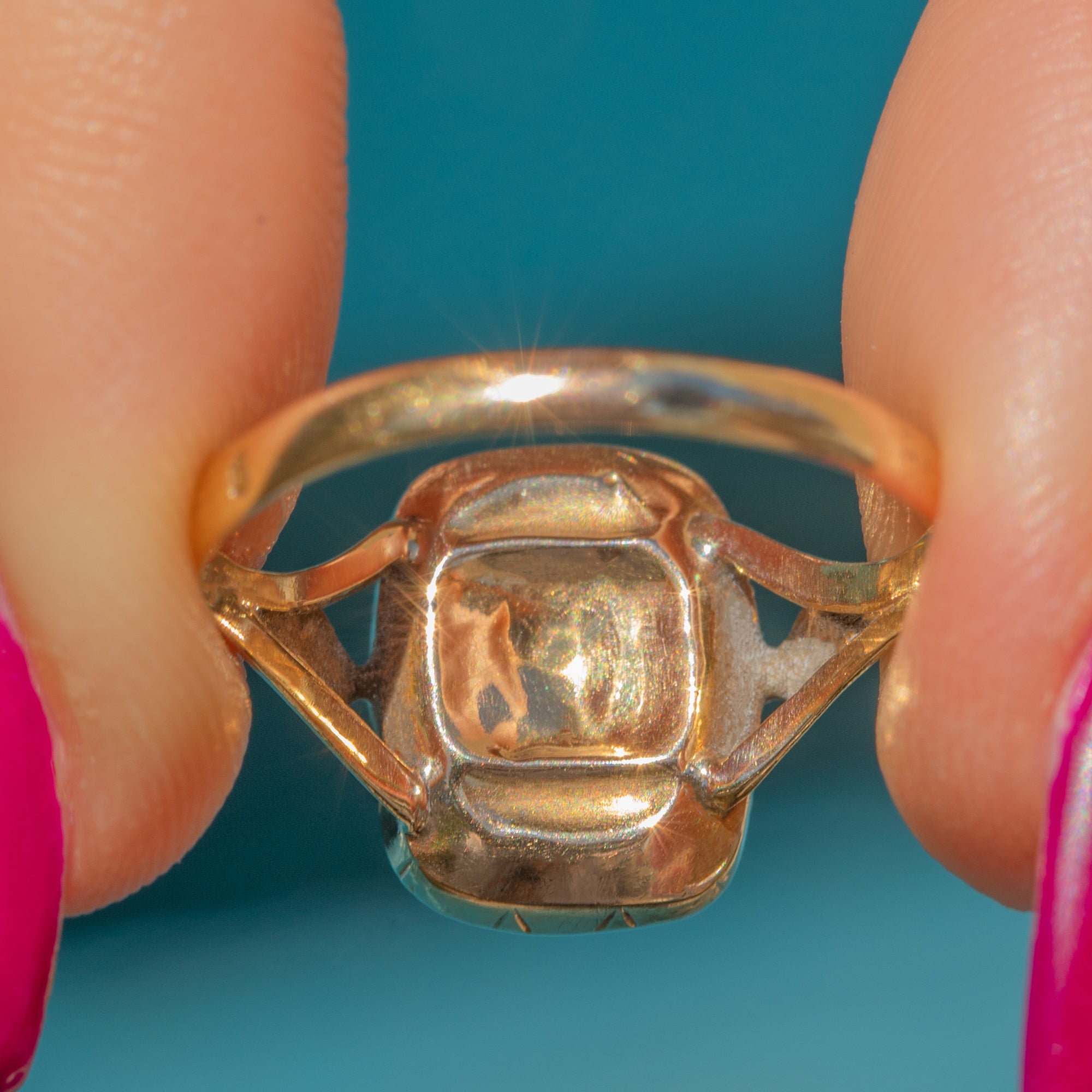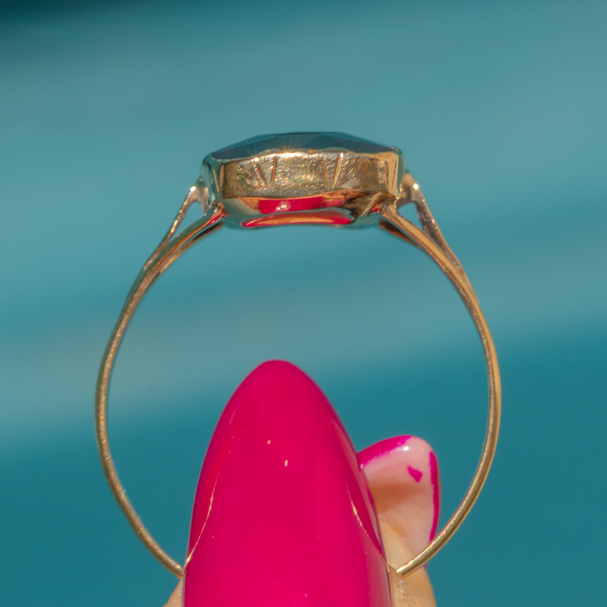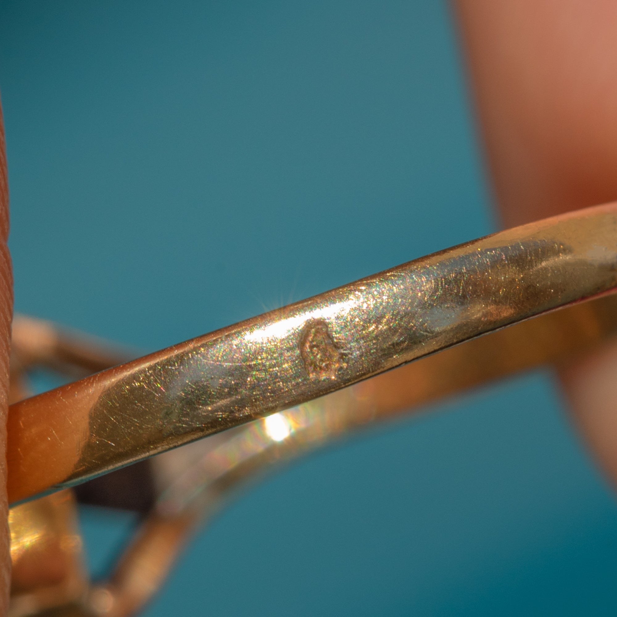 VERY GOOD: The Perpignan Garnet has a gorgeous deep red hue and is in excellent condition with no chips, cracks or damage whatsoever. The foil is intact, as are the typical Georgian settings. The shank is French 18ct Gold and has clear French stamps (the eagle's head and a French maker's mark), although there is a re-size mark visible. The domed back has unfortunately been squashed somewhat, no doubt from an unscrupulous jeweller's previous sizing, which is a shame, but the gem still shines perfectly and none of these minor flaws can be seen whilst wearing the ring.