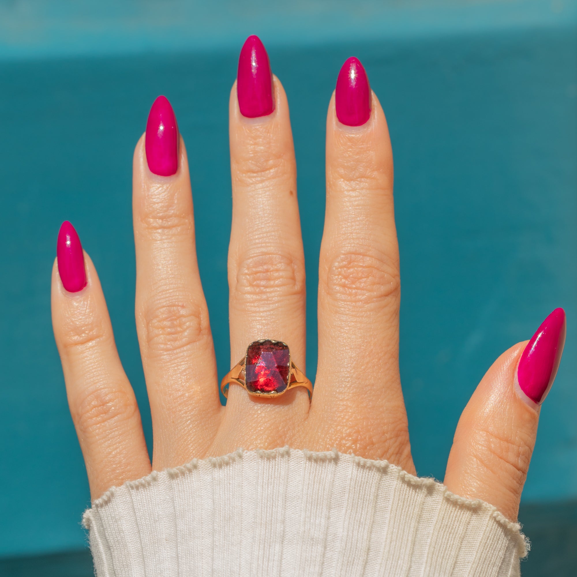 The Garnet has a delicious deep merlot hue, revealing flashes of seductive crimson as its foiled back catches the light. Set in saturated 18ct Gold and providing impressive finger coverage, this Georgian ring will make a bold impact adorning your hand!