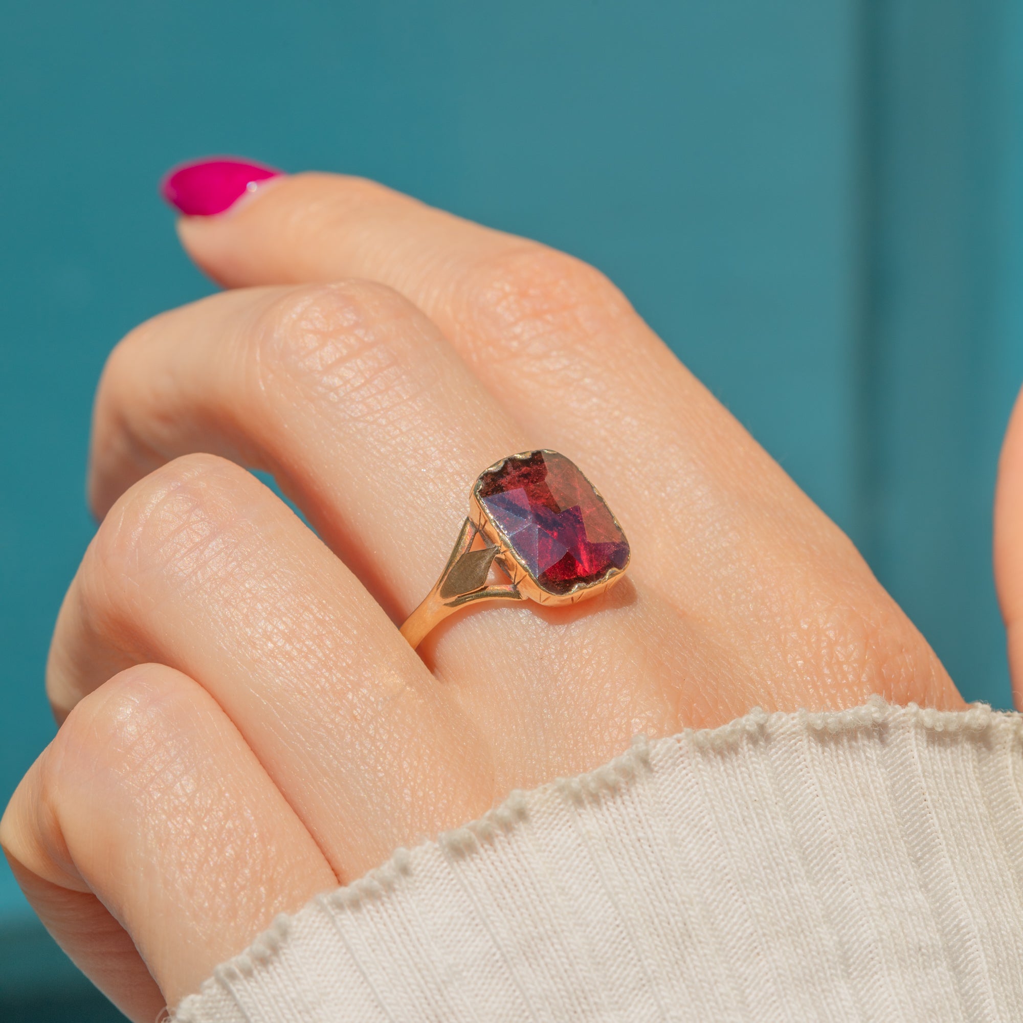 This Georgian Perpignan Garnet ring is a rare and highly collectible treasure! The ring boasts a gorgeously faceted Garnet from the Perpignan region in France, which is no longer mined, making it a sought-after gemstone.