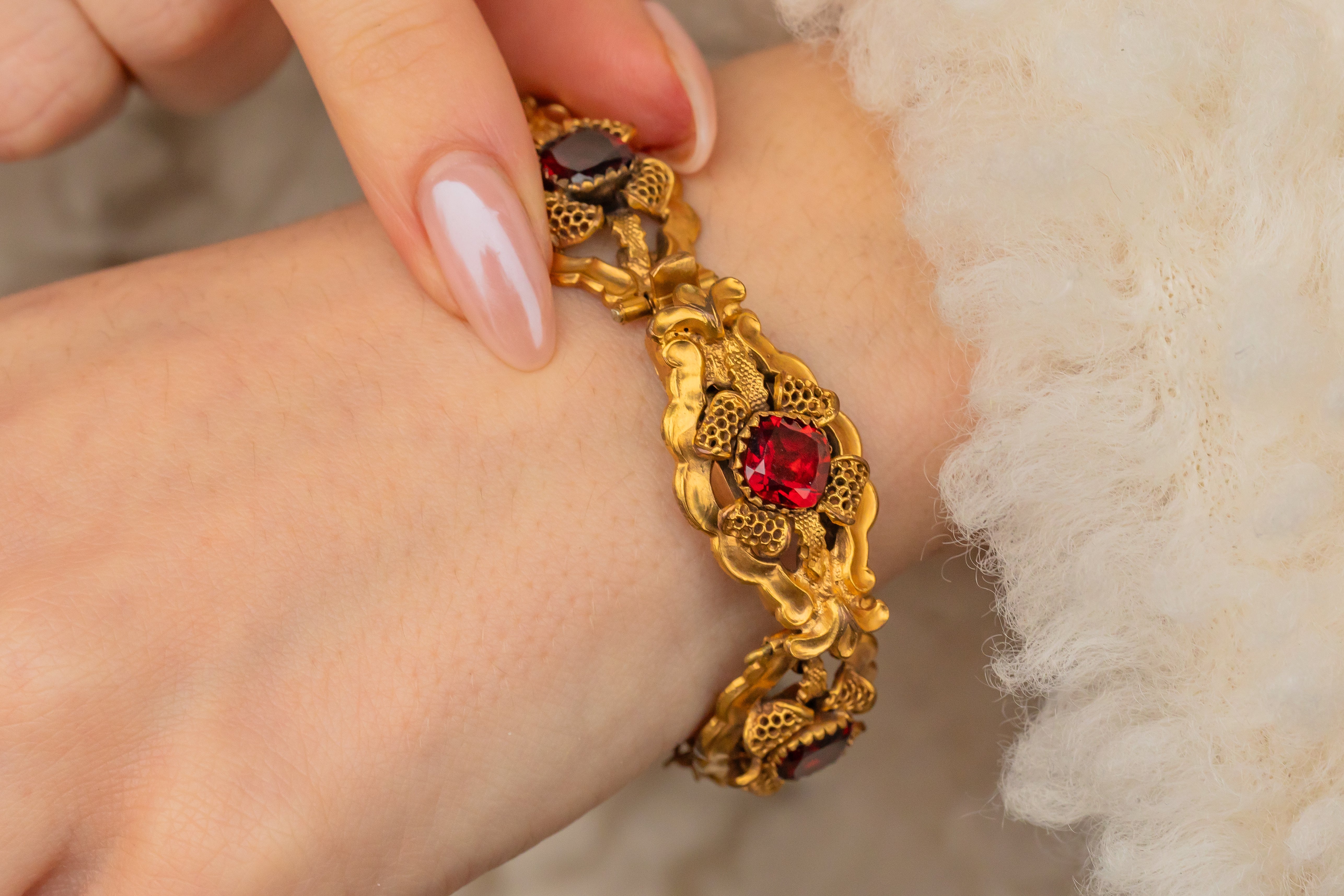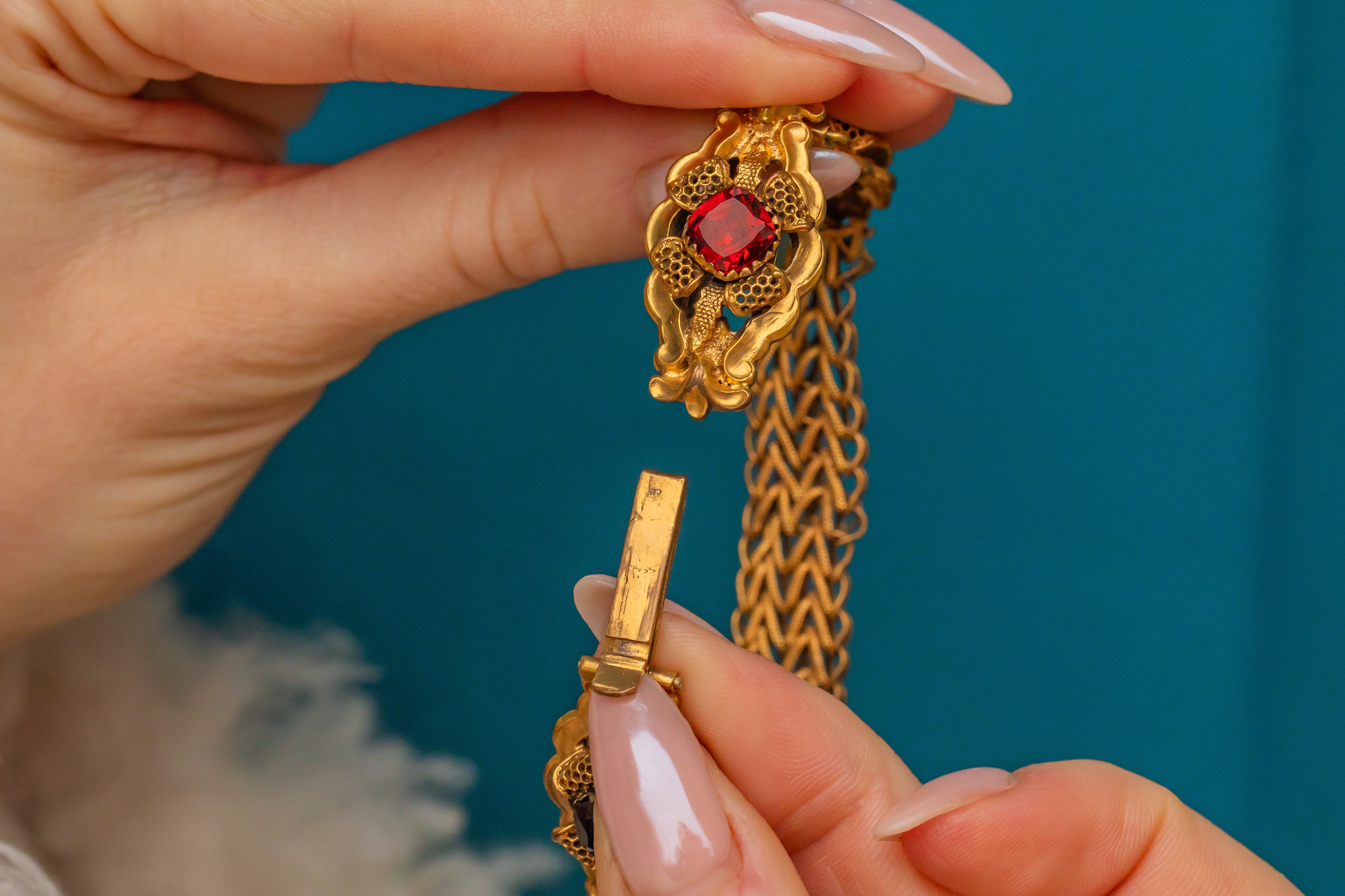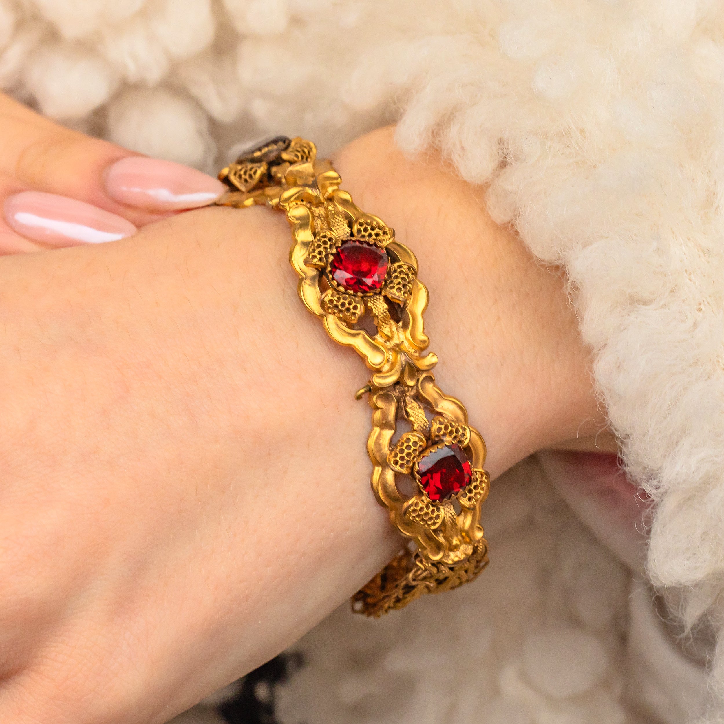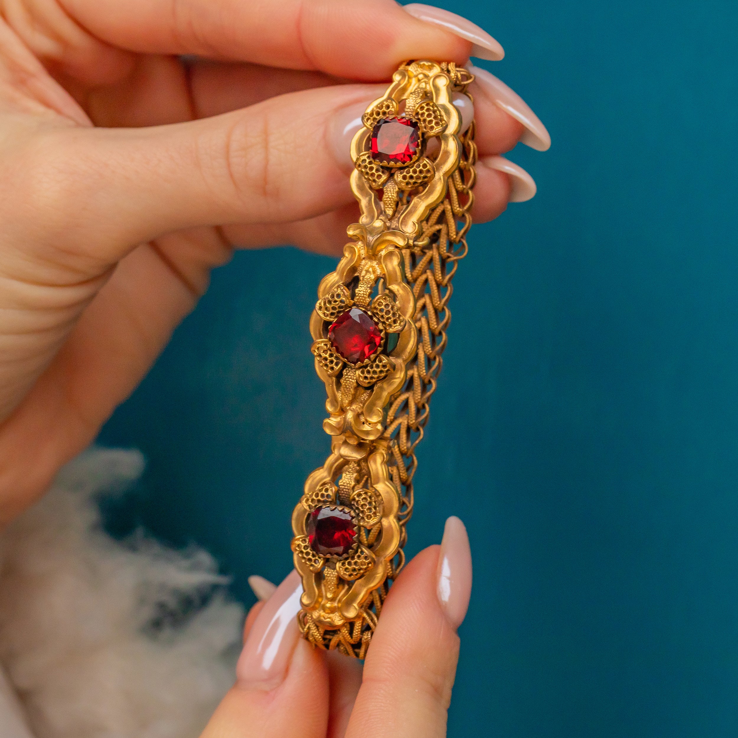 From the ornate links homing glistening Garnet Paste surrounded by fine engravings and delicate detailing, to the intricately woven chain that effortlessly caresses your wrist, every inch is adorned with exquisite Georgian craftsmanship!
