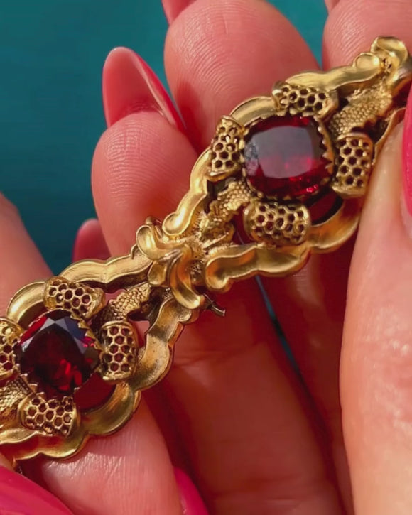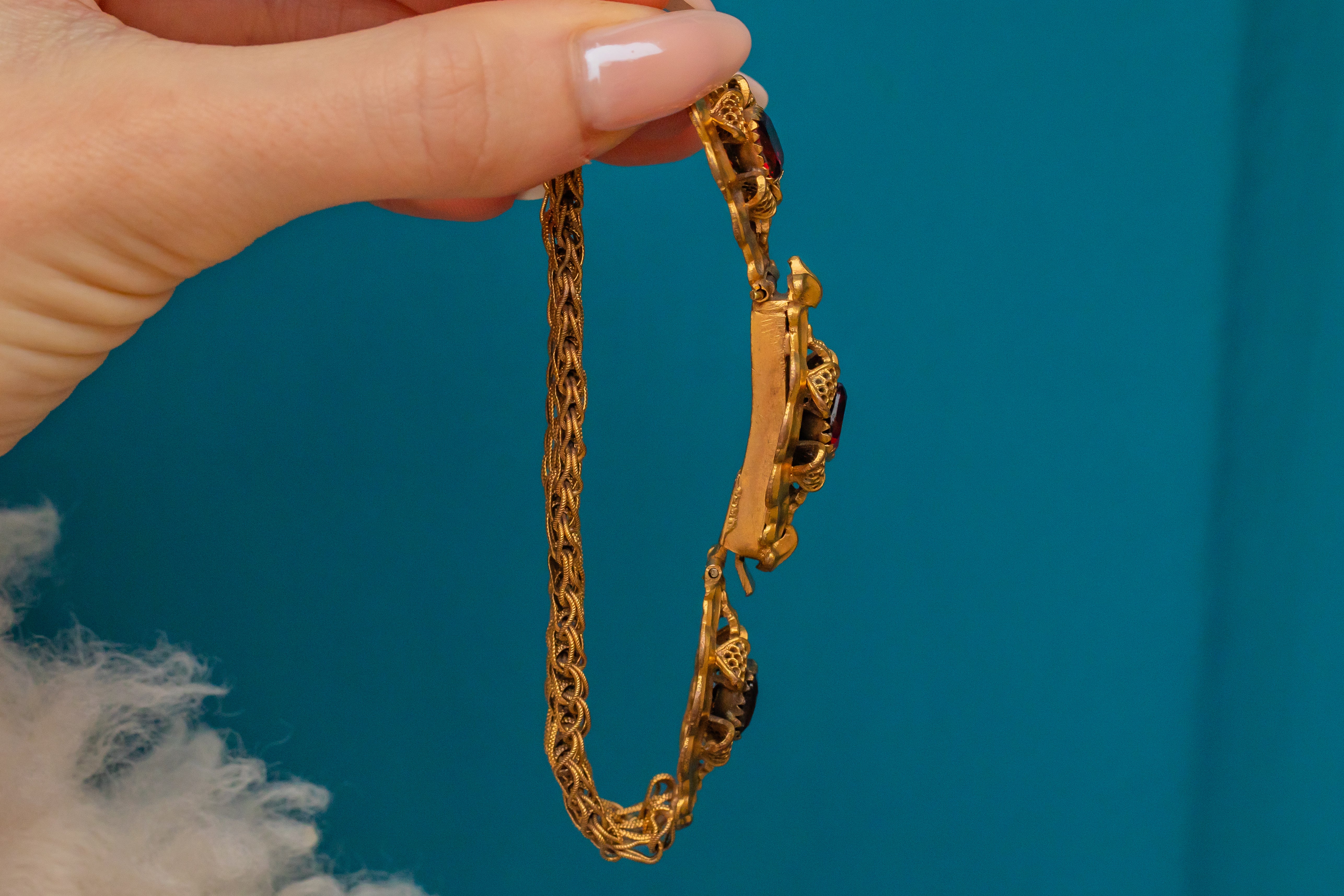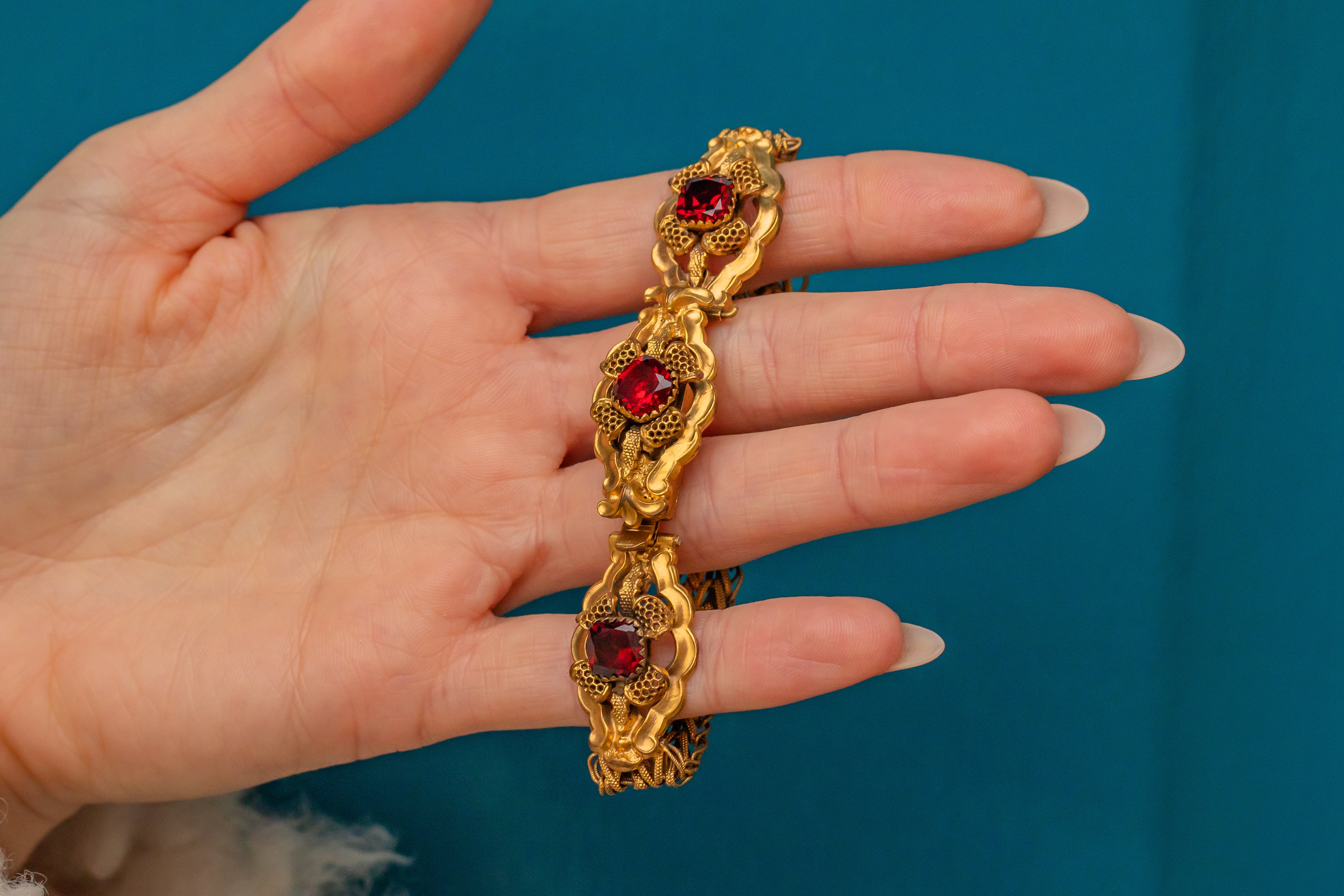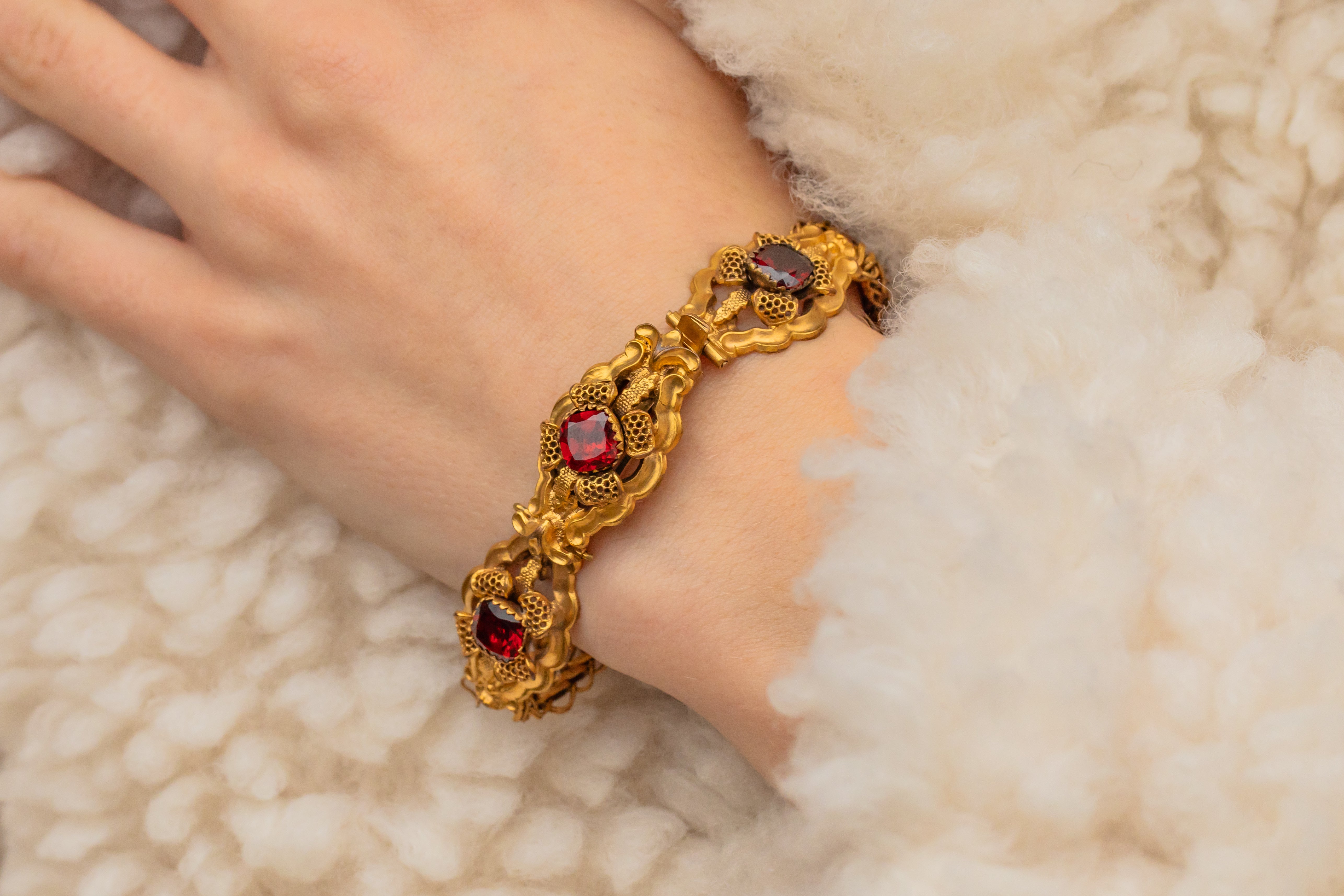 From the ornate links homing glistening Garnet Paste surrounded by fine engravings and delicate detailing, to the intricately woven chain that effortlessly caresses your wrist, every inch is adorned with exquisite Georgian craftsmanship!