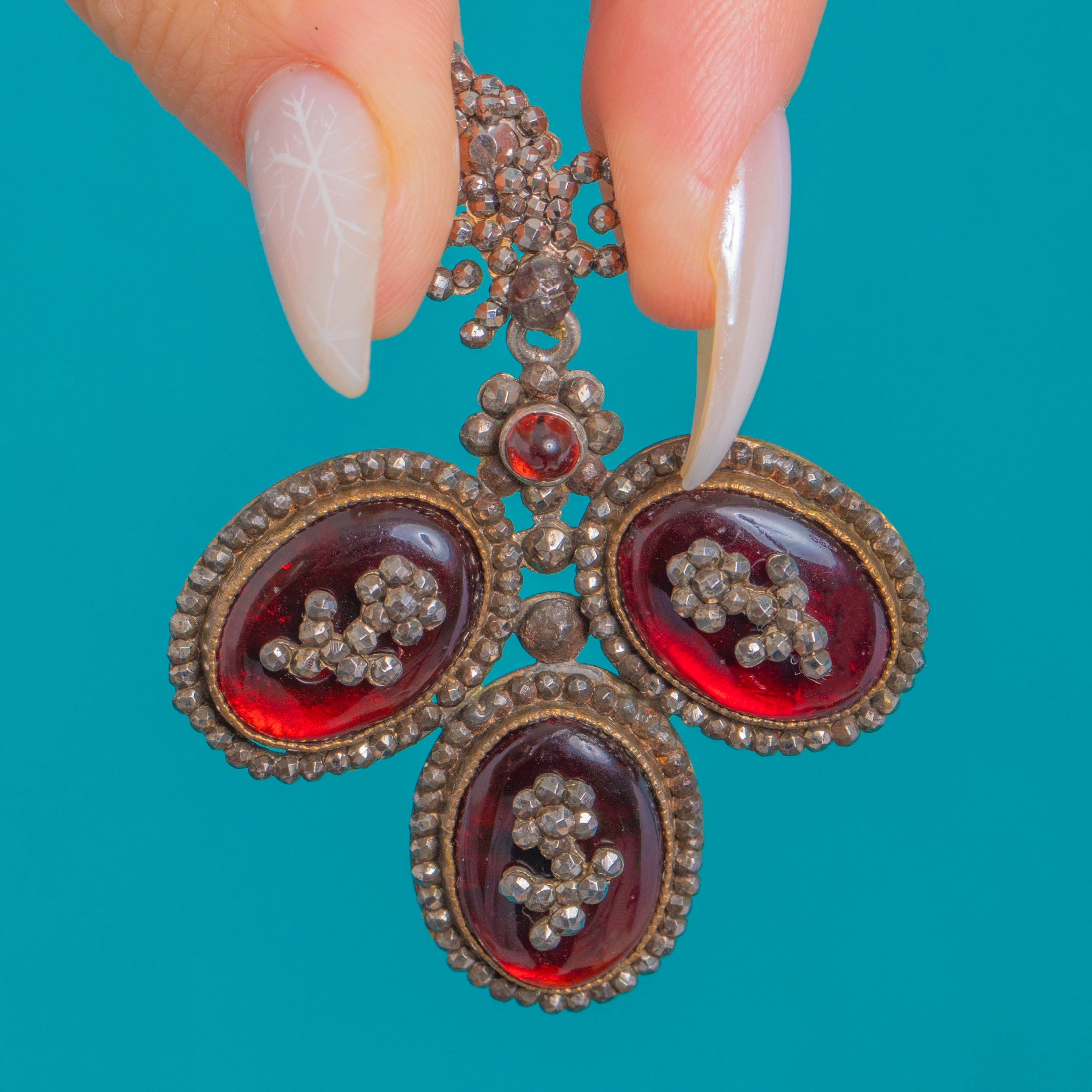 Each cabochon is embraced by dense halos and rosette clusters of shimmering Cut Steel, their dark, mirror-bright facets lending a silvery sparkle that contrasts beautifully with the rich red domes. Delicate articulation between the elements gives subtle movement, while the softly time-worn patina and gold-toned rims around the bezels add depth and antique charm. Ornate, romantic and unmistakably historic, this is a statement jewel of superb period character.