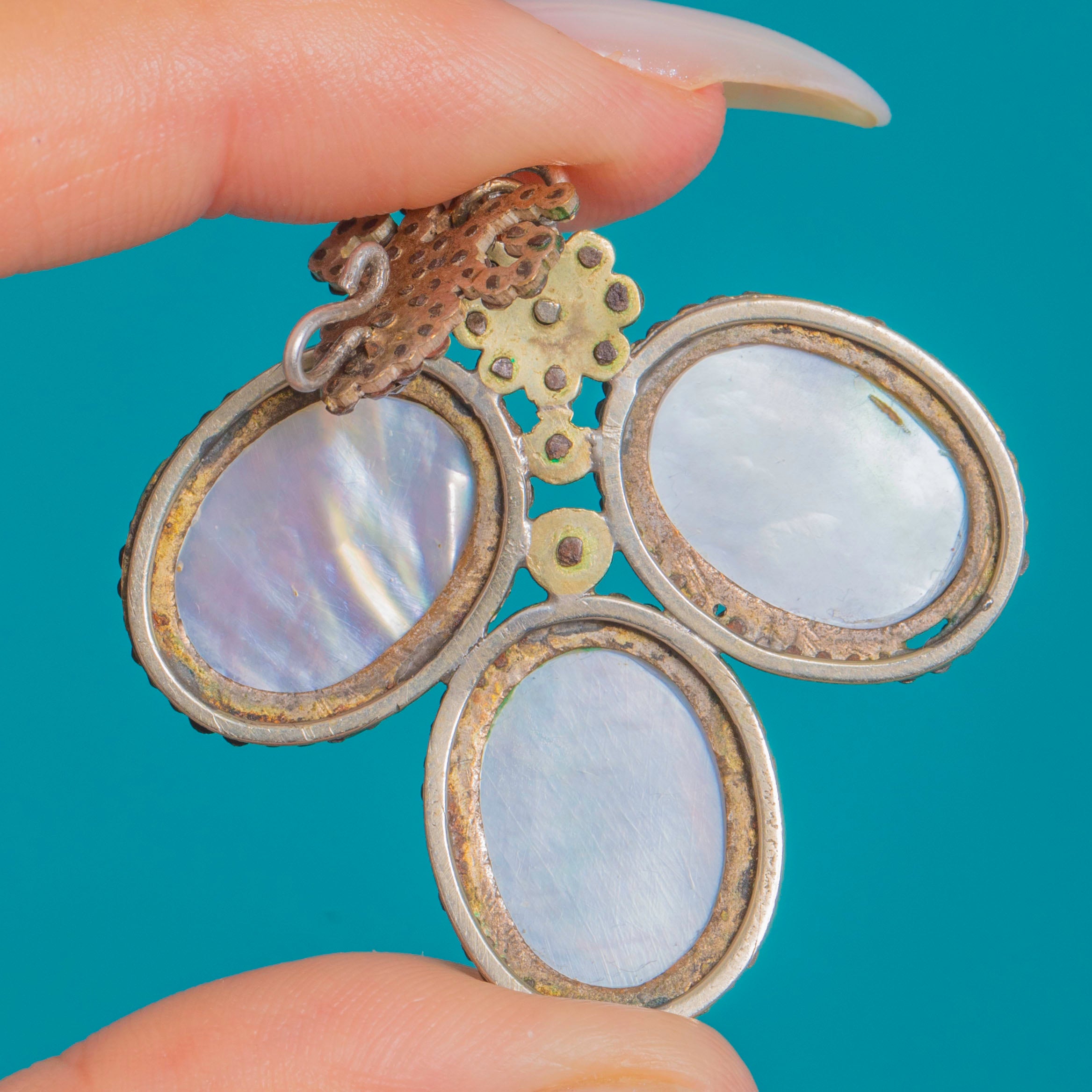 A glorious Georgian pendant in the Queen Anne taste, composed as an articulated trefoil surmounted by a dainty bow. Three high-domed Red Paste cabochons glow dramatically over Mother of Pearl in the traditional “coque de perle” manner, creating that lit-from-within crimson radiance beloved of early 18th–century jewels.