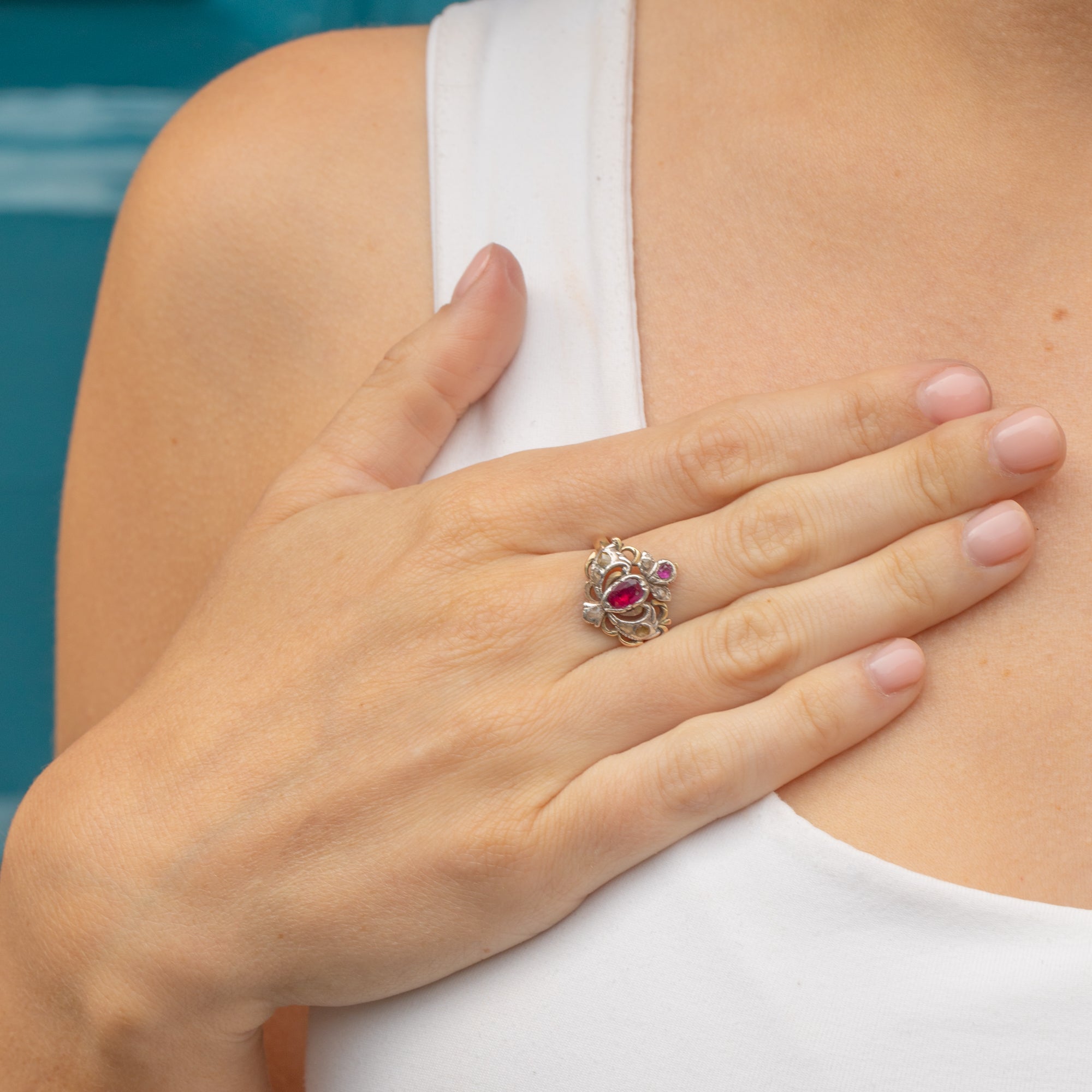 Giardinetti translates to 'little garden', and this one is in full bloom! The Rubies have a vibrant pinky hue and the Diamonds add a wonderful sparkle. The ring provides great finger coverage, and will sure to put your collection above all others!